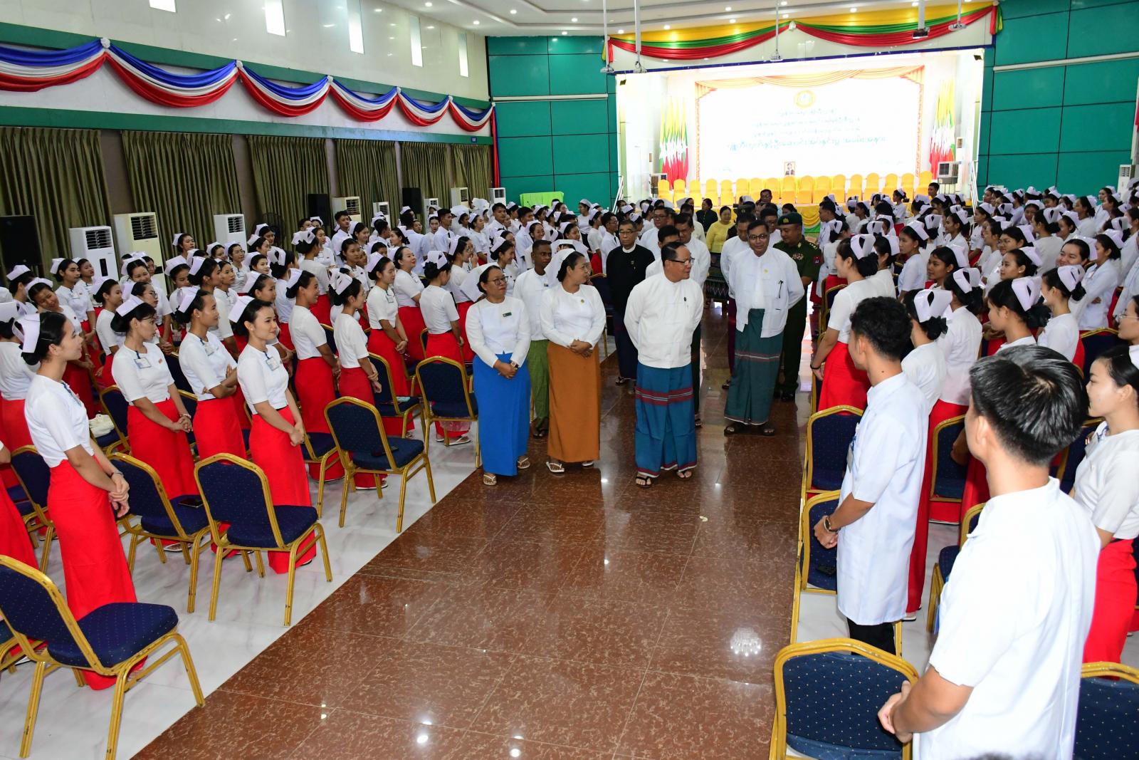 ထို့နောက် ပြည်နယ်ဝန်ကြီးချုပ်နှင့် တာဝန်ရှိသူများသည် သူနာပြု-သားဖွားဒီပလိုမာ သင်တန်းသား၊ သင်တန်းသူများအား ရင်းနှီးနွေးထွေးစွာ တွေ့ဆုံနှုတ်ဆက်၍ အားပေးစကားများ ပြောကြားခဲ့ကြောင်း သတင်းရသည်။