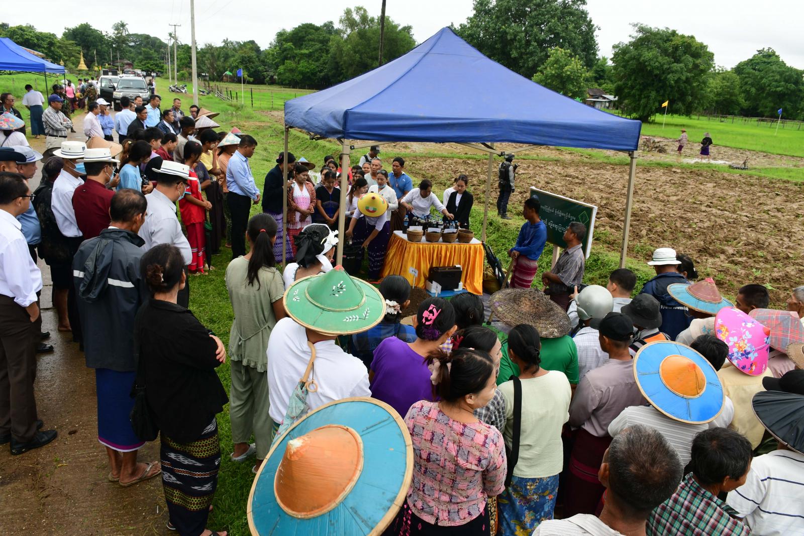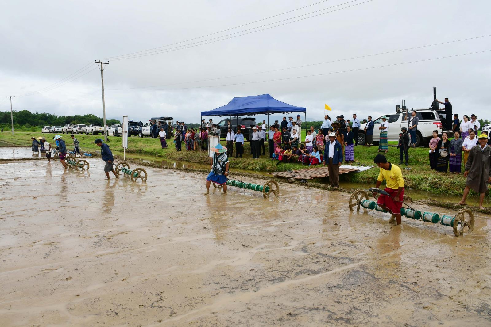 ယင်းနောက် ဝင်းကျန်ကျေးရွာ ကွင်းအမှတ်-၁၂၁၅/ခ၊ တောင်သူဒေါ်ထွေးမြ၏ လယ်မြေ ၅ ဧက၌ မျိုးစေ့ချကိရိယာဖြင့် မိုးစပါးစိုက်ပျိုးခြင်းကွင်းသရုပ်ပြပွဲကို ကျင်းပရာ ပြည်နယ်စိုက်ပျိုးရေးဦးစီးဌာန ညွှန်ကြားရေးမှူး ဦးထွန်းမြင့်က မျိုးစေ့ချကိရိယာဖြင့်စိုက်ပျိုးခြင်း၏ အကျိုးကျေးဇူးများကို ရှင်းလင်းပြောကြားပြီး ပြည်နယ်စီးပွားရေးရာဝန်ကြီး ဦးစောခင်မောင်မြင့်က မိုးစပါးစွမ်းအားပြည့် စိုက်ပျိုးထုတ်လုပ်နိုင်ရေး ဆွေးနွေးပြောကြားကာ တောင်သူများ၏ မေးမြန်းဆွေးနွေးမှုများအပေါ် ပြန်လည်ရှင်းလင်းဖြေကြား၍ လိုအပ်သည်များပေါင်းစပ်ညှိနှိုင်းဖြည့်ဆည်း ဆောင်ရွက်ပေးခဲ့ကြောင်း သိရသည်။