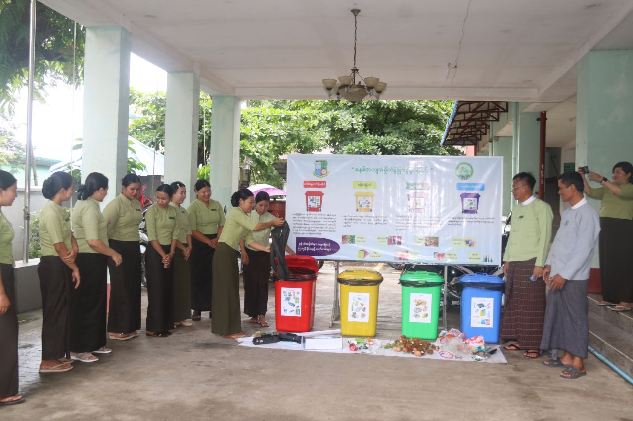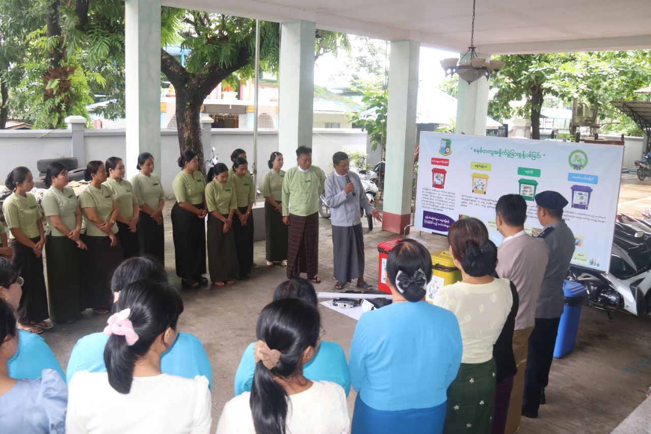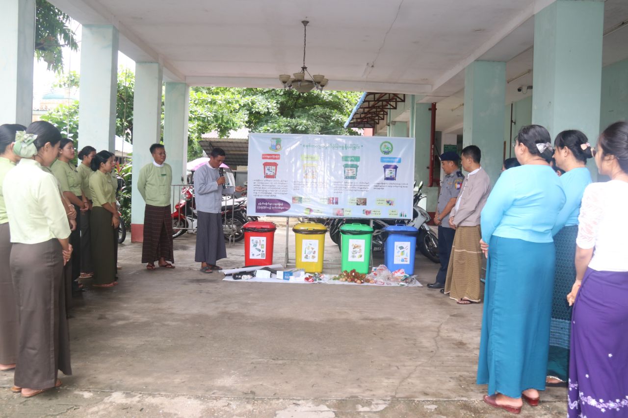ဦးစွာ မြို့နယ်စီမံအုပ်ချုပ်ရေးအဖွဲ့ဥက္ကဋ္ဌက အဖွင့်အမှာစကားပြောကြားပြီး မြို့နယ်ပတ်ဝန်းကျင်ထိန်းသိမ်းရေးဦးစီးဌာနမှူး ဦးသက်နိုင်က ဌာနဆိုင်ရာ ဝန်းထမ်းများနှင့် အများပြည်သူများ မိမိနေအိမ်မှ စတင်၍ မိမိပတ်ဝန်းကျင်၊ ကျောင်းများတွင် အမှိုက်ကို စနစ်တကျခွဲခြား စွန့်ပစ်သည့် အလေ့အထကောင်းများ ဖြစ်ပေါ်စေရေး ပညာပေးပြီး ပတ်ဝန်းကျင်သန့်ရှင်းသာယာလှပစေရေးလုပ်ငန်းများ ဆောင်ရွက်ရာတွင် အထောက်အကူဖြစ်စေရန်အတွက် စွန့်ပစ်ပစ္စည်းများလေးမျိုးခွဲခြား၍ အမှိုက်ပုံးများ လေးလုံးထားရှိပြီး အမှိုက်စွန့်ပစ်သည့် စနစ်အား စံပြဆောင်ရွက်နိုင်ရေးအတွက် ပလတ်စတစ်အမှိုက်အတွက်၊ အပြာရောင်ပုံး၊ အမှိုက်စိုအတွက် အစိမ်းရောင်ပုံး၊ အမှိုက်ခြောက်အတွက် အဝါရောင်ပုံးနှင့် အန္တရာယ်အမှိုက်အတွက် အနီရောင်ပုံးများဖြင့် စနစ်တကျစွန့်ပစ်နိုင်ရေးရှင်းလင်းပြောကြားခဲ့သည်။