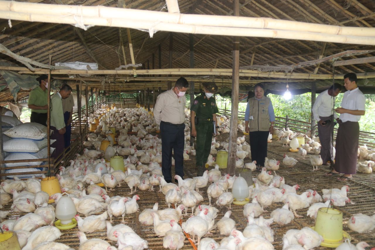 ဆက်လက်၍ ပြည်နယ်ဝန်ကြီးချုပ်နှင့်အဖွဲ့သည် ယမန်နေ့နံနက်ပိုင်းက မုဒုံမြို့နယ် ကွမ်တာကျေးရွာရှိ ဦးလင်းလင်းထွန်း၏ အသားတိုးကြက်မွေးမြူရေးခြံသို့ရောက်ရှိရာ ဦးစွာ ပြည်နယ်မွေးမြူးရေးကုသရေးဦးစီးဌာန ညွှန်ကြားရေးမှူးက အသားတိုးကြက်ရုံ (၆)ရုံ၌ CP Broiler အသားတိုးကြက်ကောင်ရေ(၁၈၀၀၀)မွေးမြူထားရှိမှု၊အစာရရှိမှု၊ တစ်နှစ်ပိဿာ (၁၈၃၆၀၀)ထုတ်လုပ်မှုအခြေအနေများကို ရှင်းလင်းတင်ပြရာ ပြည်နယ်ဝန်ကြီးချုပ်က မွေးမြူရေးလုပ်ငန်းများ ဆောင်ရွက်ရာတွင် ခေတ်မီနည်းစနစ်များ အသုံးပြုမွေးမြူသည့် နည်းလမ်းများကို အသုံးပြုဆောင်ရွက် ကြစေလိုကြောင်း၊ မွေးမြူရေးခြံ သန့်ရှင်းရေးဆောင်ရွက်မှုနှင့် ရောဂါကူးစက်မှု မဖြစ်ပွားစေရေး ကြိုတင်ဆောင်ရွက်ထားရှိရန်လိုကြောင်း ပြောကြားကာ လိုအပ်သည်များကို တာဝန်ရှိသူများနှင့် ပေါင်းစပ်ဖြည့်ဆည်းဆောင်ရွက်ပေးပြီး မွေးမြူရေးခြံအတွင်း (၄၅)ရက်သား ကြက်ရုံနှင့် (၁၈)ရက်သားကြက်ရုံတို့၌ မွေးမြူအောင်မြင်ဖြစ်ထွန်းနေမှုအခြေအနေများကို လှည့်လည်ကြည့်ရှု့စစ်ဆေးခဲ့ကြောင်း သိရသည်။