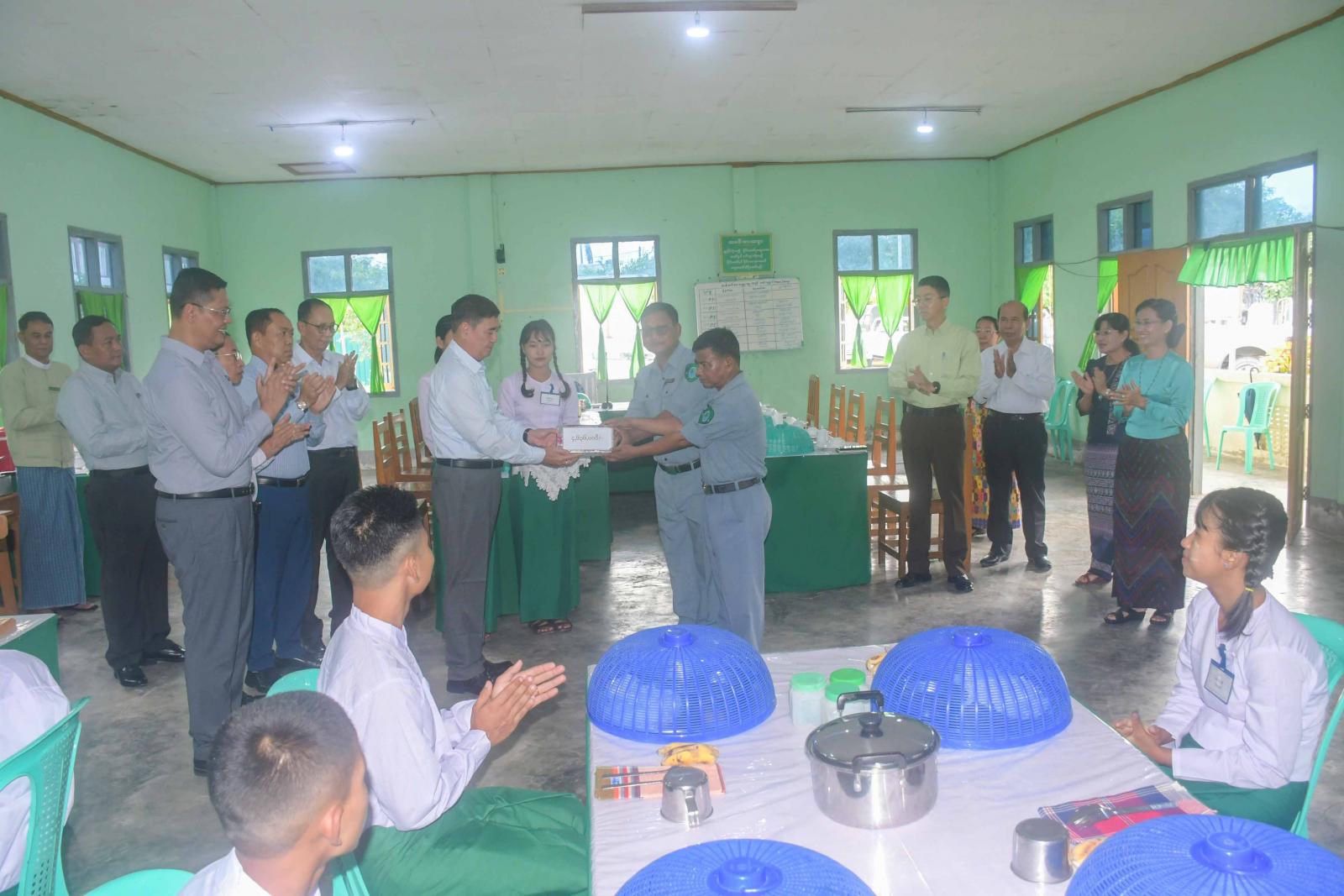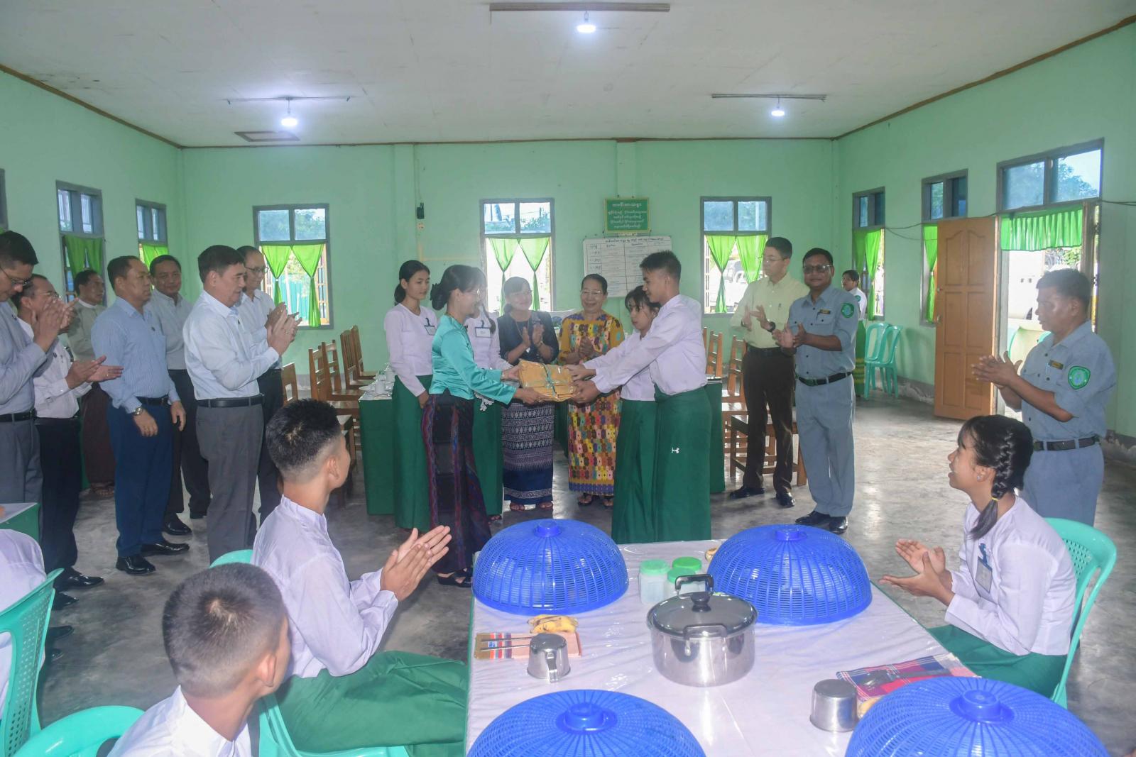 ထို့နောက် ထမင်းစားဆောင်တွင် နေ့လယ်စာစားပွဲကိုကျင်းပရာ ရခိုင်ပြည်နယ်ဝန်ကြီးချုပ် ဦးထိန်လင်းက ကျောင်းသား၊ ကျောင်းသူများ၏ နေထိုင်စားသောက်ရေးအတွက် လိုအပ်သော ကူညီဆောင်ရွက်မှုများပေးနိုင်ရန် ပြည်နယ်အစိုးရအဖွဲ့ဝင်များ၊ သက်ဆိုင်ရာဌာနများမှ တာဝန်ရှိသူများနှင့်အတူ လာရောက်ခြင်းဖြစ်ကြောင်း၊ ကျောင်းအတွက် နိုင်ငံတော်မှလိုအပ်သော ထောက်ပံ့မှုများ ပေးထားသကဲ့သို့ ပြည်နယ်အစိုးရအဖွဲ့ကလည်း လိုအပ်သည်များကို ဝိုင်းဝန်းကူညီဆောင်ရွက်ပေးလျက်ရှိကြောင်း၊ ယခုလာရောက်ရာတွင်လည်း ကျောင်းသား၊ ကျောင်းသူများအတွက် စားစရိတ်အပိုဆောင်းငွေများ၊ ပညာသင်စရိတ်နှင့် မိုးတွင်းကာလဖြစ်သည့်အတွက် မိုးကာအင်္ကျီများကို လာရောက်ပေးအပ်ခြင်းဖြစ်ကြောင်း၊ ပြည်ထောင်စုအတွင်းနေထိုင်ကြသည့် တိုင်းရင်းသားညီအစ်ကိုများသည် မိသားစုစိတ်ဓာတ်ဖြင့် စည်းစည်းလုံးလုံးညီညီညွတ်ညွတ် နေထိုင်သွားကြရမည်ဖြစ်ကြောင်း၊ ကျောင်းသား၊ ကျောင်းသူများအနေဖြင့် ကျောင်းအတွင်း နေထိုင်စဉ် သတ်မှတ်ထားသော စည်းမျဉ်း၊ စည်းကမ်းများနှင့်အညီနေထိုင်ပြီး ပညာကိုကြိုးစား သင်ယူကြစေလို ကြောင်း၊ ကျောင်းသား၊ ကျောင်းသူများသည် နောင်တစ်ချိန်တွင် မိမိတို့ဒေသ၌ လက်ဆင့်ကမ်း တာဝန် ထမ်းဆောင်ကြမည့် မျိုးဆက်သစ်လူငယ်များဖြစ်ကြောင်း၊ လူငယ်များသည် စာပေ တတ်မြောက်ပြီး ထူးချွန်ထက်မြက်သည့် လူငယ်များဖြစ်လာလျင် ရခိုင်ပြည်နယ်ကြီးသည်လည်း ဖွံ့ဖြိုးတိုးတက်လာမည် ဖြစ်ကြောင်း၊ ထို့ကြောင့် ပညာကိုကြိုးစားသင်ယူကြပါ၊ တစ်ဦးနှင့်တစ်ဦး ချစ်ချစ်ခင်ခင်နေထိုင်ပြီး ရိုင်းပင်းကူညီစောင့်ရှောက်ကြပါ၊ အထူးသဖြင့် ကျန်းမာကြံ့ခိုင်သော လူငယ်များဖြစ်အောင် လေ့ကျင့်နေထိုင်ကြပါ၊ ကောင်းမွန်သောလမ်းကြောင်းကို လျှောက်လှမ်းနိုင်ရန် မိမိကိုယ်တိုင်ဝိရိယထုတ် ကြိုးစားရမည်ဖြစ်သဖြင့် မိမိဘဝကိုမိမိကိုယ်တိုင် ထိန်းကျောင်းကာ မိမိရည်မှန်းချက်အတိုင်း လျှောက်လှမ်းနိုင်ပါစေကြောင်း ဆုံးမဩဝါဒစကား ပြောကြားသည်။
