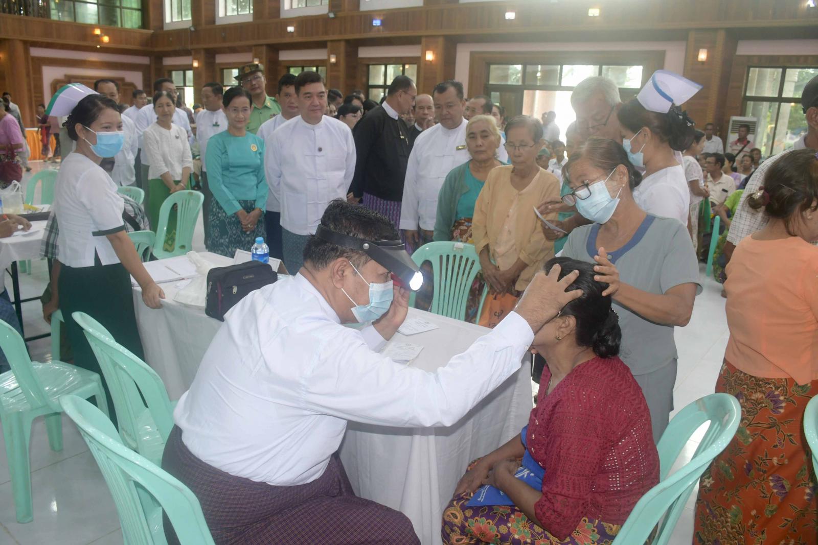 အငြိမ်းစားဝန်ထမ်းများအား ပင်စင်လစာထုတ်ပေးခြင်း၊ ကျန်းမာရေးစောင့်ရှောက်မှုပေးခြင်းနှင့် ချီးမြှင့် ပေးအပ်ခြင်းဆောင်ရွက်ရာတွင် ပြည်နယ်ပြည်သူ့ကျန်းမာရေးဦးစီးဌာနမှူး၊ ခုတင် ၅၀၀ ဆံ့ အထွေထွေ ရောဂါကုဆေးရုံကြီးမှ ဆေးရုံအုပ်ကြီးတို့က အနီးကပ်ကြီးကြပ်ကာ ခုတင် ၅၀၀ ဆံ့ အထွေထွေရောဂါကု ဆေးရုံကြီးမှ သမားတော်ကြီးများ၊ အထူးကုဆရာဝန်ကြီးများနှင့် ကျန်းမာရေးဝန်ထမ်းများက သွေးပေါင်ချိန် တိုင်းတာပေးခြင်း၊ သွေးအတွင်း အောက်ဆီဂျင်ပါဝင်မှု တိုင်းတာ ပေးခြင်း၊ ဆီးချို၊ သွေးချိုစစ်ဆေးပေးခြင်း၊ နှလုံးရောဂါစစ်ဆေးခြင်းနှင့် အီးစီဂျီရိုက်ပေးခြင်းများကိုဆောင်ရွက်ပေးကြပြီး လိုအပ်သောဆေးဝါးများကိုလည်း အခမဲ့ထုတ်ပေးကြသည်။ အလားတူ တိုင်းရင်းဆေးပညာဦးစီးဌာနမှ ပြည်နယ်ဦးစီးမှူးနှင့် ဝန်ထမ်းများကလည်း အငြိမ်းအစားဝန်ထမ်းများအား တိုင်းရင်းဆေးဝါးများနှင့် ကုသပေးခြင်းများကို ဆောင်ရွက်ပေးကြပြီး တိုင်းရင်းဆေးများကို အခမဲ့ချီးမြှင့်ပေးအပ်ခဲ့ကြသည်။