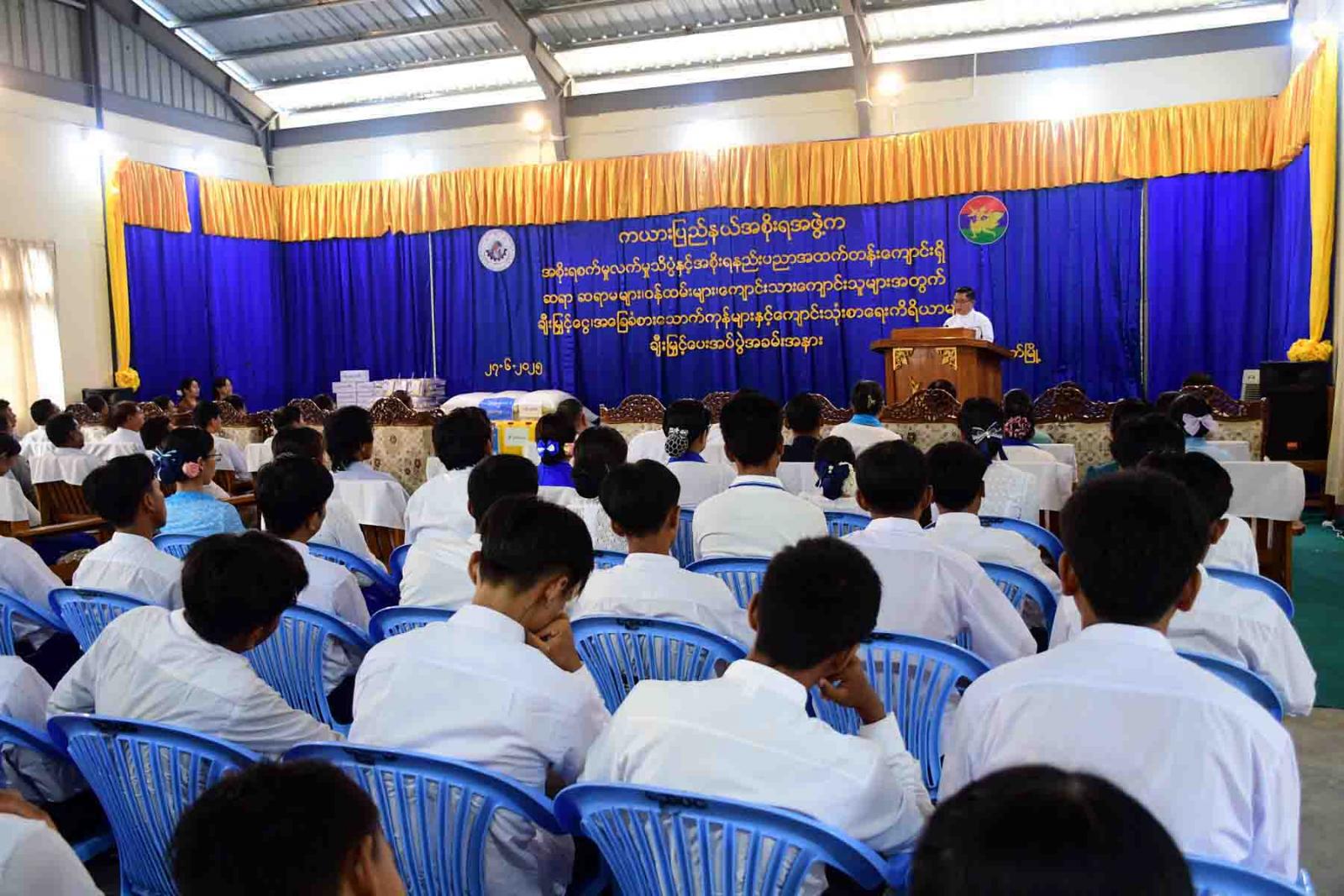 ကယားပြည်နယ်အစိုးရအဖွဲ့အနေဖြင့် ပြည်နယ်၏ ပညာရေးကဏ္ဍနှောင့်နှေးမှုမရှိစေရေးနှင့် အခြေခံပညာနှင့် အဆင့်မြင့်ပညာကျောင်းသား၊ ကျောင်းသူများအားလုံး စိတ်အေးချမ်းသာစွာဖြင့် ပညာသင်ယူနိုင်ရေး ပံ့ပိုးဆောင်ရွက်ပေးလျက်ရှိရာ ယမန်နေ့က ကယားပြည်နယ်အစိုးရအဖွဲ့က အစိုးရစက်မှုလက်မှုသိပ္ပံနှင့် အစိုးရနည်းပညာအထက်တန်းကျောင်းရှိ ဆရာ၊ ဆရာမများ၊ ဝန်ထမ်းများ၊ ကျောင်းသား၊ ကျောင်းသူများအတွက် ချီးမြှင့်ငွေ၊ အခြေခံစားသောက် ကုန်များနှင့် ကျောင်းသုံးစာရေးကိရိယာများ ချီးမြှင့်ပေးအပ်ပွဲကို လွိုင်ကော်မြို့၊ အစိုးရစက်မှုလက်မှုသိပ္ပံ(လွိုင်ကော်)ကျောင်းခန်းမ၌ ကျင်းပပြုလုပ်သည်။