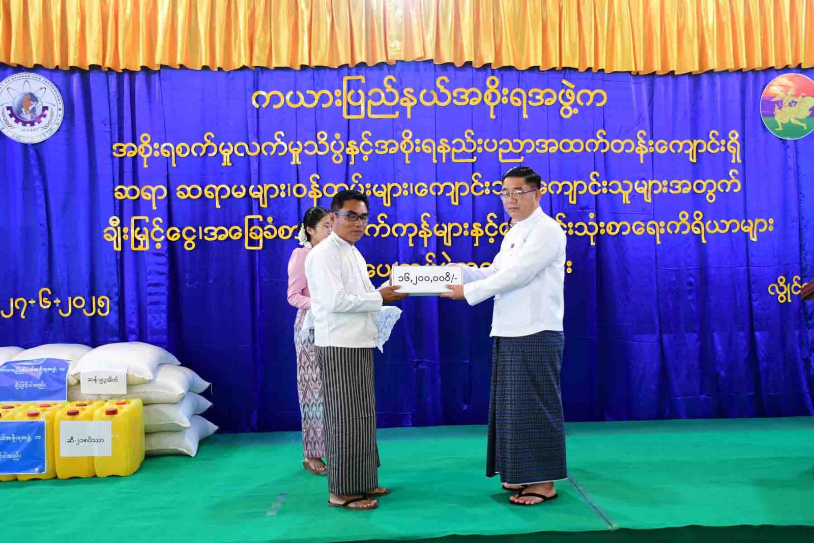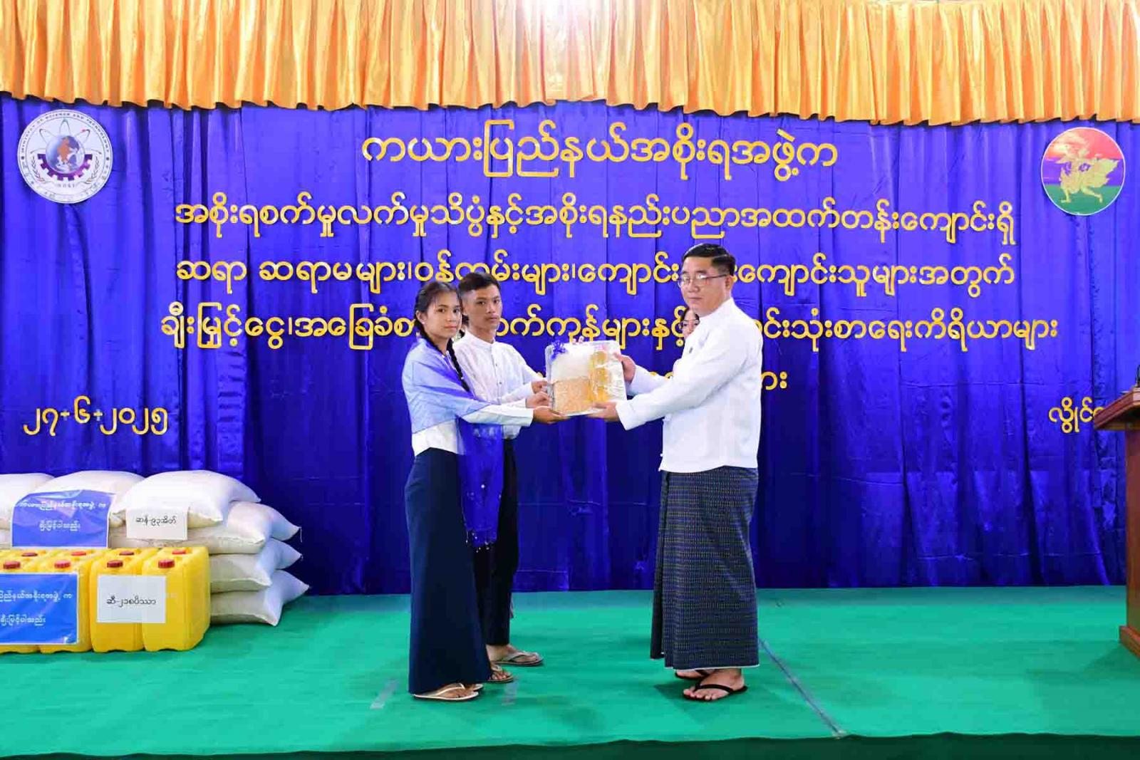 ထို့နောက် လုံခြုံရေးနှင့်နယ်စပ်ရေးရာဝန်ကြီးက ပြည်နယ်အစိုးရအဖွဲ့က ကျောင်းငွေပဒေသာပင် ချီးမြှင့်ငွေများနှင့် ကျောင်းသုံးစာရေးကိရိယာများအားလည်းကောင်း၊ စီးပွားရေးရာဝန်ကြီးက စားဖိုဆောင်ချက်ပြုတ်ရေးအဖွဲ့အတွက် တစ်နှစ်စာချီးမြှင့်ငွေနှင့် ကျောင်းသုံးစာရေးကိရိယာများအားလည်းကောင်း ပေးအပ်ရာ တာဝန်ရှိသူအသီးသီးက လက်ခံရယူခဲ့ကြသည်။