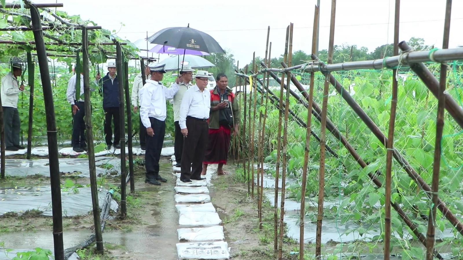 ယင်းနောက် ပြည်နယ်ဝန်ကြီးချုပ်နှင့်အဖွဲ့သည် ဟင်းသီးဟင်းရွက်စံပြစိုက်ခင်းအတွင်း တောင်သူ(၁၃)ဦး၏ အောင်မြင်ဖြစ်ထွန်းနေသော ခဝဲ၊ သခွား၊ ခရမ်း၊ ဘူး၊ ရုံပတီ၊ တိုင်ထောင်ပဲ၊ ပဲတောင့်ရှည်၊ ဖူးစားပြောင်း၊ ကင်မွန်းချဉ်၊ ဆူးပုတ်၊ ကန်စွန်းဥစိုက်ခင်းများ၊ အမှတ်(၂၀)စက်မှုလယ်ယာစခန်း(ဘားအံ)၏ ထွန်စက်ကြီးများဖြင့် သစ်စိမ်းမြေဩဇာ(ပိုက်ဆံလျှော်)ပင်များအား ထယ်ထိုးမြေမြှုပ်ခြင်းတို့ကို ကြည့်ရှုအားပေးခဲ့ကြပြီး ပြည်နယ်ဝန်ကြီးချုပ်က ရာသီမရွေး မြေလွတ်၊ မြေလပ်မကျန် စိုက်ပျိုးလုပ်ကိုင်နိုင်ရေး၊ ရေသွင်း၊ ရေထုတ်မြောင်းများ စနစ်တကျရှိစေရေးနှင့် တောင်သူလိုအပ်ချက်များအား ကူညီဖြည့်ဆည်းပေးနိုင်ရေး တာဝန်ရှိသူများအား မှာကြားခဲ့သည်။