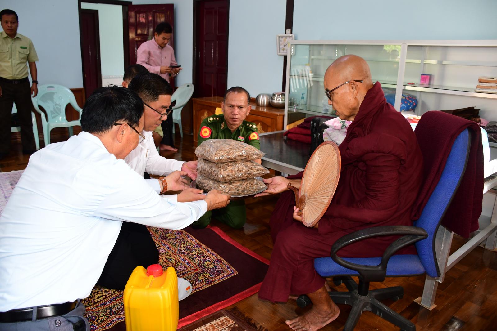 ရှေးဦးစွာ ပြည်နယ်ဝန်ကြီးချုပ်နှင့် တာဝန်ရှိသူများသည် ဒေါဥခူပရိယတ္တိစာသင်တိုက် ဦးစီးပဓာန နာယကဆရာတော် ဘဒ္ဒန္တဝိသုဒ္ဓါစာရအား ဖူးမြော်ကြည်ညို၍ ကျောင်းတိုက် သံဃာတော်များအတွက် ဆွမ်းဆန်တော်၊ ဆီနှင့် လှူဖွယ်ပစ္စည်းများ၊ နဝကမ္မအလှူတော်ငွေများ ဆက်ကပ်လှူဒါန်းသည်။ ထို့နောက် ကျောင်းတိုက်အတွင်း နယ်မြေခံတပ်ရင်းတပ်ဖွဲ့များ၊ ဌာနဆိုင်ရာများနှင့် ရပ်ကွက်နေပြည်သူများက ကုသိုလ်ပြုစုပေါင်းသန့်ရှင်းရေး ဆောင်ရွက်နေမှုတို့အား လှည့်လည်ကြည့်ရှုအားပေးသည်။ ဆက်လက်၍ ကျောင်းတိုက်အတွင်း အကြမ်းဖက်သောင်းကျန်းသူများကြောင့် ထိခိုက်ပျက်စီးခဲ့သည့် သိမ်တော်၊ ဓမ္မာရုံ၊ ဆွမ်းစားဆောင်များ၊ ဆရာတော် သီတင်းသုံးသည့် အဆောင်များနှင့် အလှူရှင်များက ပြင်ဆင်ပေးလျက်ရှိသော ကျောင်းဆောင်များကို လှည့်လည်ကြည့်ရှုစစ်ဆေးရာ ပြည်နယ်သာသနာရေးဦးစီးဌာန တာဝန်ရှိသူများက လိုက်လံရှင်းလင်း တင်ပြသည်။ ပြည်နယ်ဝန်ကြီးချုပ်က ဆရာတော်၊ သံဃာတော်များ ပြန်လည်သီတင်းသုံးနိုင်ရေး အတွက် ဦးစားပေးပြုပြင်ပေးရမည့် ကျောင်းတိုက်များကို အမြန်ပြန်လည်ပြုပြင်ပေးနိုင်ရေး တာဝန် ရှိသူများအားမှာကြားပြီး လိုအပ်သည်များ ပေါင်းစပ်ညှိနှိုင်းပေးသည်။