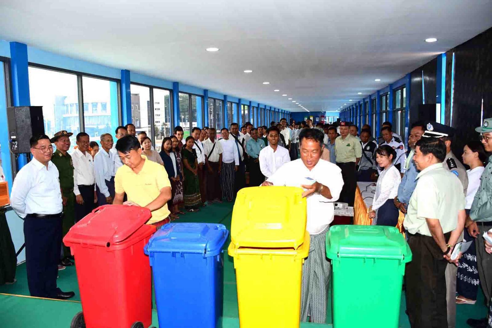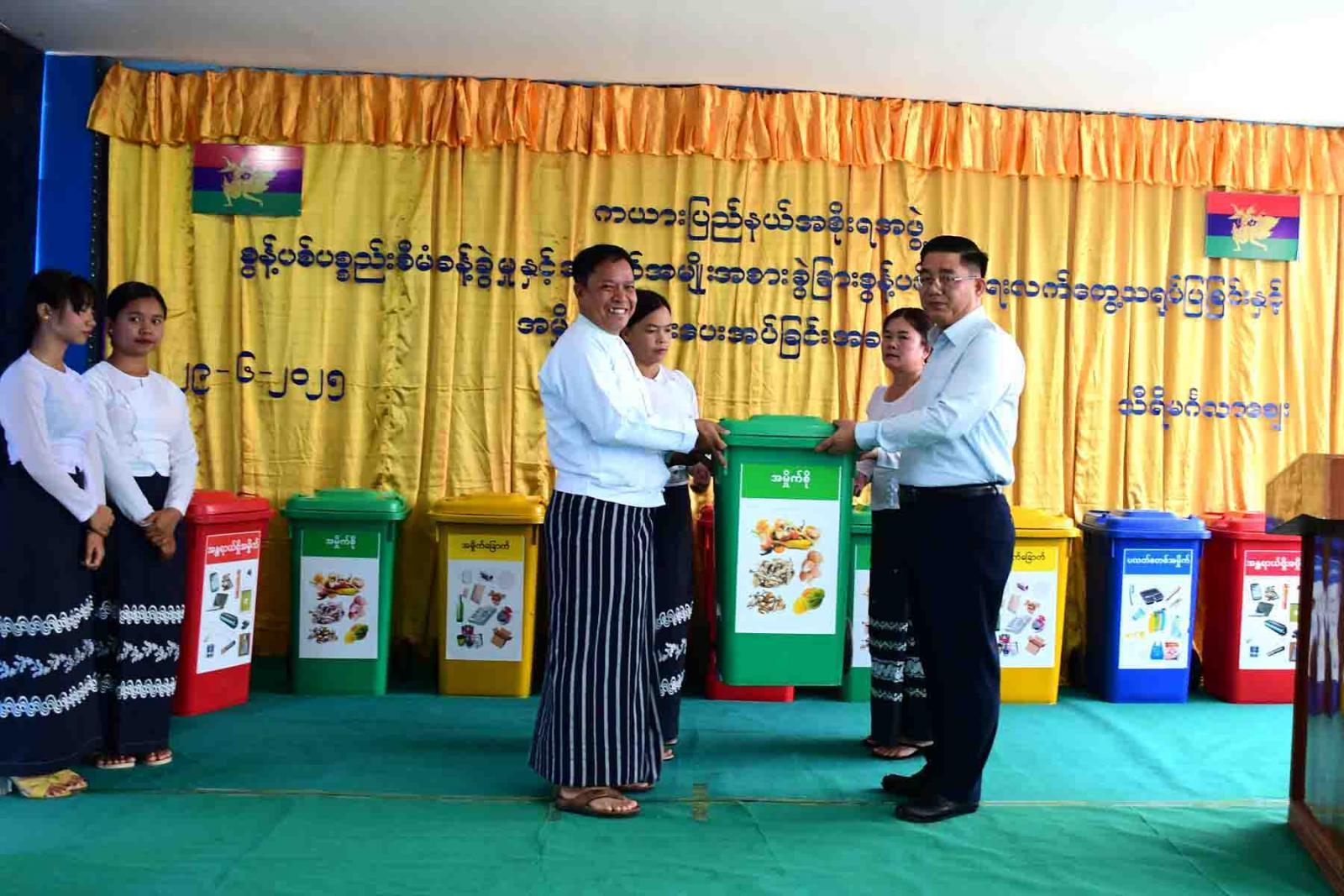 ထို့နောက် ပြည်နယ်ဝန်ကြီးချုပ်က နည်းပညာတက္ကသိုလ်(လွိုင်ကော်)နှင့် သီရိမင်္ဂလာ ဈေးသူ၊ ဈေးသားများအတွက် အမှိုက်ပုံးများပေးအပ်ရာ ကျောင်းအုပ်ကြီးနှင့် ဈေးသူ၊ ဈေးသားကိုယ်စားလှယ်များ လက်ခံရယူကြသည်။ ဆက်လက်၍ လုံခြုံရေးနှင့်နယ်စပ်ရေးရာဝန်ကြီးက ပြည်နယ်ပညာရေးမှူးရုံး၊ သယံဇာတရေးရာဝန်ကြီးက ပြည်နယ်ပြည်သူ့ဆေးရုံကြီး၊ တိုင်းရင်းသားရေးရာဝန်ကြီးက ပြည်နယ်သာသနာရေးဦးစီးဌာနသို့လည်းကောင်း အမှိုက်ပုံးများ အသီးသီးပေးအပ်ရာ တာဝန်ရှိသူများက လက်ခံရယူကြသည်။