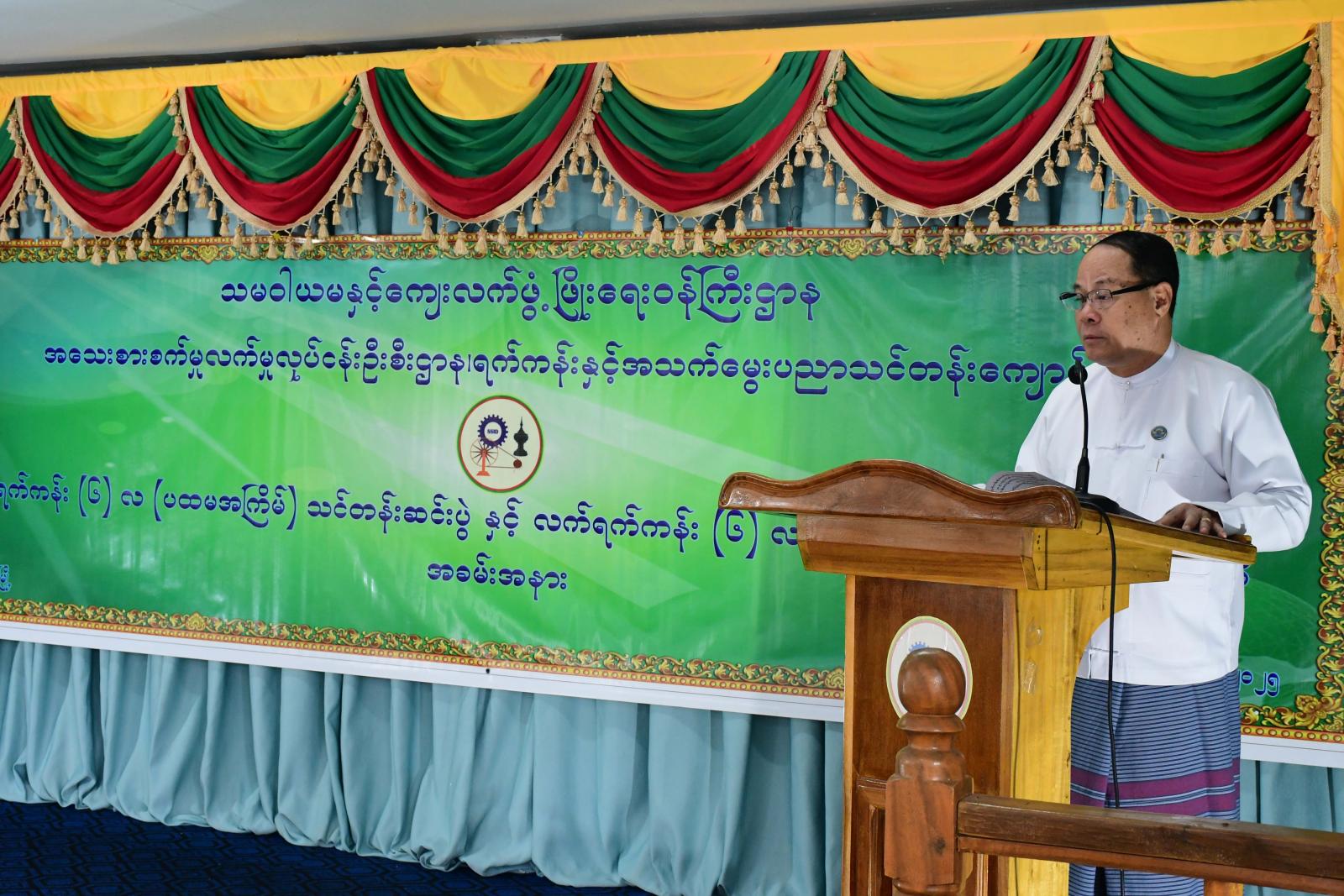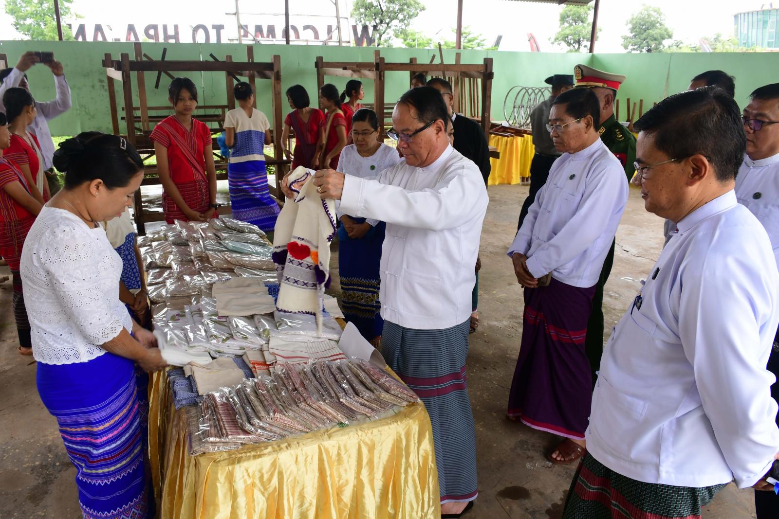 ဦးစွာ ပြည်နယ်ဝန်ကြီးချုပ်ဦးစောမြင့်ဦးက သင်တန်းဆင်းသင်တန်းသူများအနေဖြင့် ပြည်တွင်းမှ ကုန်ကြမ်းများကို အသုံးပြုပြီး ကုန်ချောများထုတ်လုပ်ခြင်းဖြင့် မိမိတို့၏ရိုးရာရက်ကန်းပညာကို ထိန်းသိမ်းစောင့်ရှောက်နိုင်မည်ဖြစ်ပြီး နိုင်ငံခြားသို့ သွားရောက်လုပ်ကိုင်မည့်အစား မိသားစုနှင့် အိုးမကွာ၊ အိမ်မကွာနေထိုင်ပြီး မိမိတို့ကိုယ်ပိုင်ရက်ကန်းလုပ်ငန်းလုပ်ကိုင်ခြင်းဖြင့် ဝင်ငွေများရရှိလာနိုင်မည်ဖြစ်ကြောင်း၊ သင်ကြားပေးလိုက်သောနည်းပညာများဖြင့် ကရင်တိုင်းရင်းသားတို့၏ ရိုးရာအထည်များကိုအခြေခံပြီး ကောင်းမွန်ဆန်းသစ်သော အတွေးအခေါ်များဖြင့် Innovation & Creation များပြုလုပ်၍ ဈေးကွက်ဝင်အထည်များထုတ်လုပ်နိုင်သည့် ရက်ကန်းလုပ်ငန်းရှင်များဖြစ်အောင် ကြိုးစားကြစေလိုကြောင်း တိုက်တွန်းပြောကြားသည်။