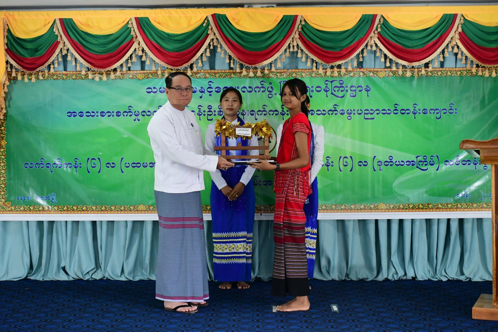 ထို့နောက် ရက်ကန်းနှင့်သက်မွေးပညာသင်တန်းကျောင်း ကျောင်းအုပ်ဆရာမကြီးက သင်တန်းနှင့်ပတ်သက်၍ ရှင်းလင်းတင်ပြပြီး ပြည်နယ်ဝန်ကြီးချုပ်က ၂၀၂၅ ပညာသင်နှစ် လက်ရက်ကန်း (၆) လသင်တန်း (ပထမအကြိမ်) သင်တန်းဆင်း သင်တန်းသူများအား လက်ရက်ကန်းစင်များကို လည်းကောင်း၊ ပြည်နယ်တရားလွှတ်တော်တရားသူကြီးချုပ်က ရက်ကန်းဆက်စပ်ပစ္စည်းများနှင့် ကုန်ကြမ်းပစ္စည်းများကိုလည်းကောင်း၊ လုံခြုံရေးနှင့်နယ်စပ်ရေးရာဝန်ကြီးက သင်တန်းထူးချွန်ဆုများကိုလည်းကောင်း၊ လမ်းပန်းဆက်သွယ်ရေးဝန်ကြီးက သင်တန်းဆင်း လက်မှတ်များကိုလည်းကောင်း အသီးသီးပေးအပ်ချီးမြှင့်ရာ သင်တန်းဆင်းသင်တန်းသူတစ်ဦးက ကျေးဇူးတင်စကားပြန်လည်ပြောကြားသည်။