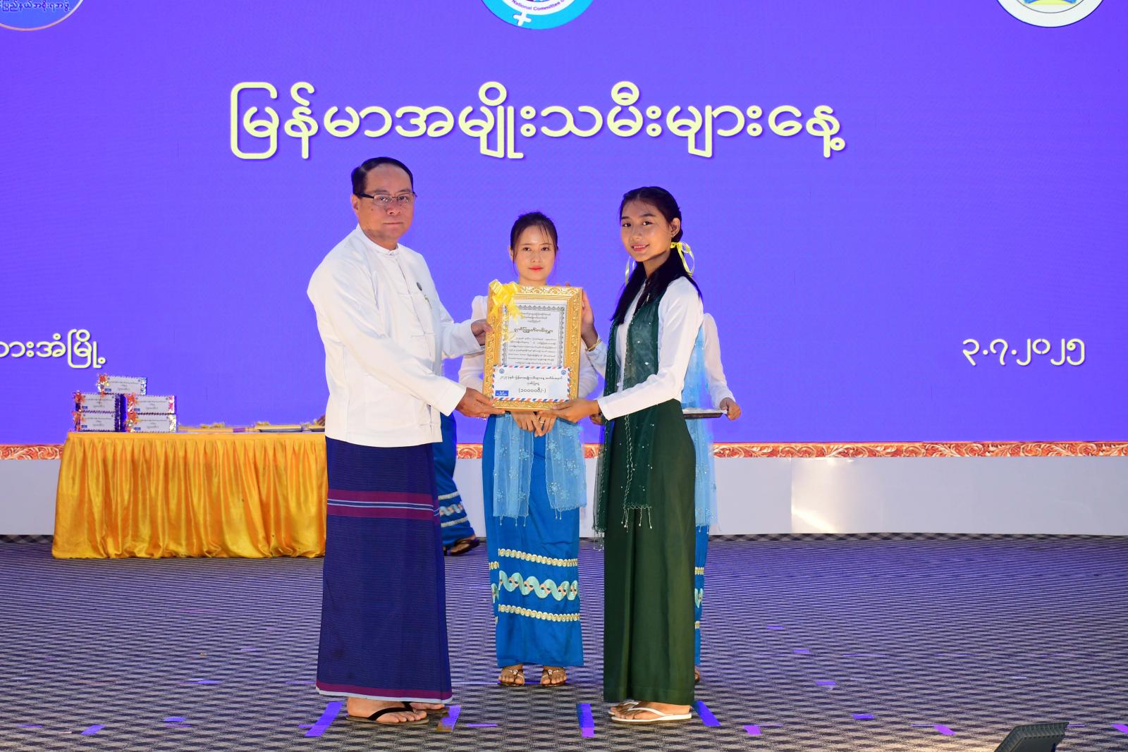 ယင်းနောက် ပြည်နယ်ဝန်ကြီးချုပ်၊ ပြည်နယ်အမျိုးသမီးရေးရာအဖွဲ့နာယကနှင့်အဖွဲ့ဝင်များက ပြည်နယ်၏စီးပွားရေး၊ ပညာရေး၊ လူမှုရေး၊ အားကစားကဏ္ဍများတွင် ထူးချွန်စွာဆောင်ရွက်ခဲ့ကြသော အမျိုးသမီးများအား ဂုဏ်ပြုဆုများပေးအပ်ချီးမြှင့်ပြီး ပြည်နယ်လူမှုရေးဝန်ကြီးနှင့် ပြည်နယ်အမျိုးသမီးရေးရာအဖွဲ့ဝင်များက မြန်မာအမျိုးသမီးများနေ့အခမ်းအနားတွင် ကပြဖျော်ဖြေသော မူကြိုရင်သွေးငယ်လေးများကိုယ်စား ဆရာမတစ်ဦးစီအား ဂုဏ်ပြုဆုများ ပေးအပ်ချီးမြှင့်ကြကာ စုပေါင်းမှတ်တမ်းဓာတ်ပုံများ ရိုက်ကူးခဲ့ကြသည်။