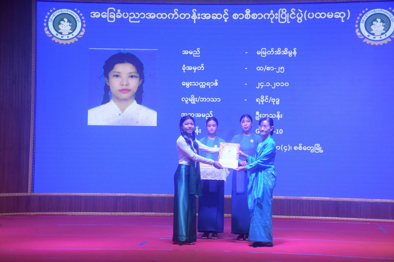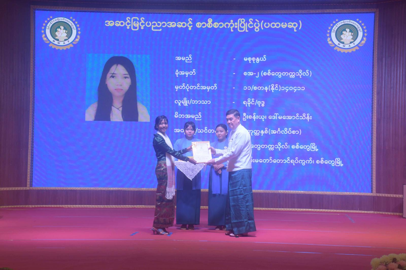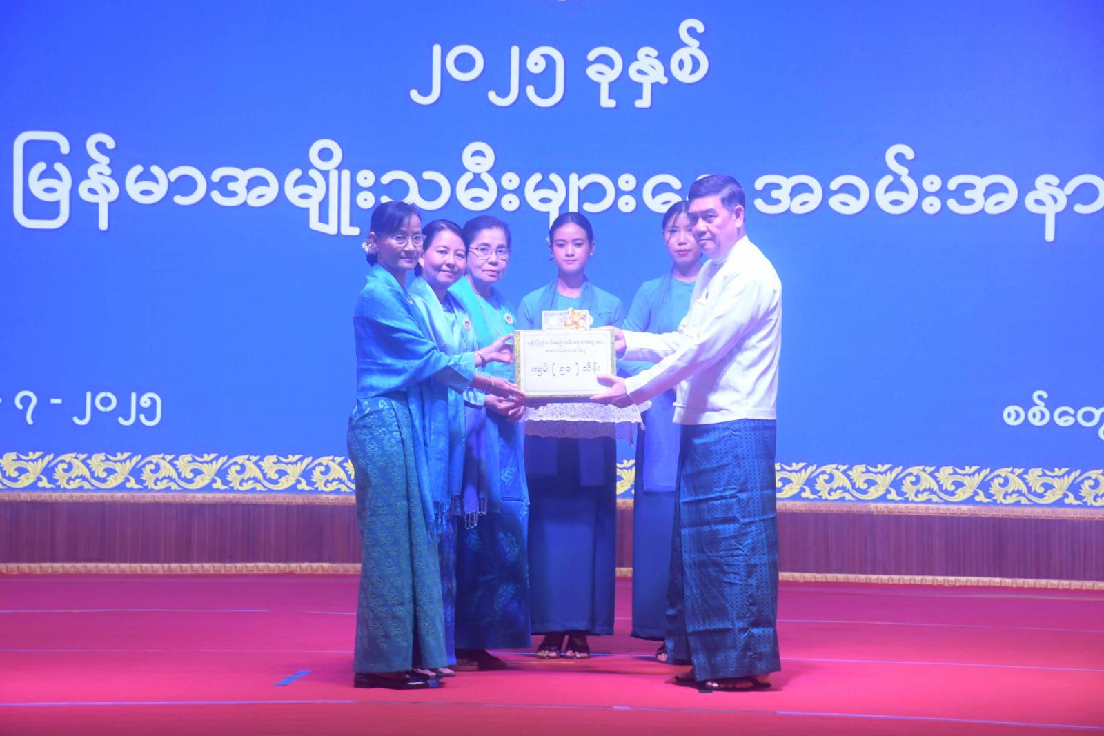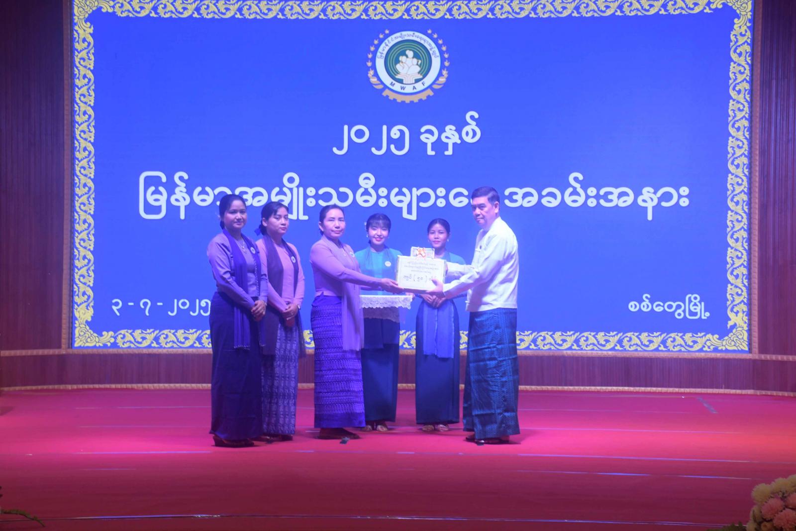 ဆက်လက်၍ ပြည်နယ်ဝန်ကြီးချုပ် ဦးထိန်လင်းက ရခိုင်ပြည်နယ်အမျိုးသမီးရေးရာအဖွဲ့နှင့် မိခင်နှင့်ကလေးစောင့်ရှောက်မှုကြီးကြပ်ရေးအဖွဲ့သို့ ထောက်ပံ့ငွေများပေးအပ်ပြီး အဆင့်မြင့်ပညာအဆင့် စာစီစာကုံးပြိုင်ပွဲတွင်ဆုရရှိကြသော ကျောင်းသား၊ ကျောင်းသူများအား ဆုများပေးအပ်ချီးမြှင့်သည်။ ဆက်လက်၍ ပြည်နယ်ဝန်ကြီးချုပ်၏ဇနီး ပြည်နယ်အမျိုးသမီးရေးရာအဖွဲ့နာယက ဒေါ်ဆွေဆွေမြတ်နှင့် တာဝန်ရှိသူများက အခြေခံပညာအထက်တန်းအဆင့်၊ အလယ်တန်းအဆင့် စာစီစာကုံးပြိုင်ပွဲတွင် ဆုရရှိကြသော ကျောင်းသား၊ ကျောင်းသူများ၊ အာဟာရချက်ပြုတ်ပြိုင်ပွဲတွင် ဆုရရှိကြသောပြိုင်ပွဲဝင်အသင်းများ၊ အမျိုးသမီးသွေးလှူရှင်များ၊ အဆင့်မြင့်ပညာအဆင့် အမျိုးသမီးလူရည်ချွန်များနှင့် အခြေခံပညာအဆင့် အမျိုးသမီးလူရည်ချွန်များ ဂုဏ်ပြုချီးမြှင့်ငွေနှင့် ဂုဏ်ပြုမှတ်တမ်းလွှာများ ပေးအပ်ကြသည်။