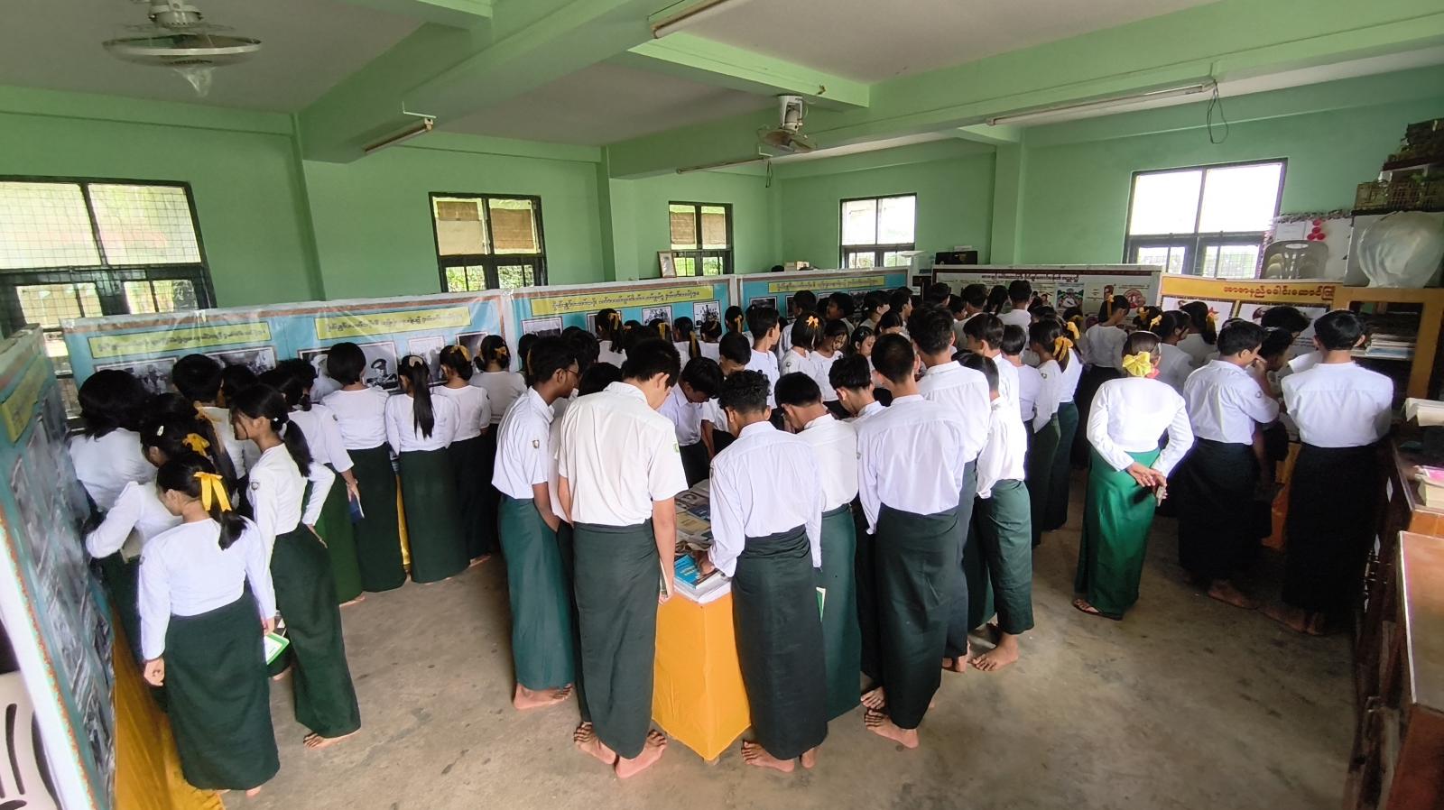 ဆက်လက်၍ ပြန်ကြားရေးနှင့်ပြည်သူ့ဆက်ဆံရေးဦးစီးဌာနမှ ခင်းကျင်းပြသထားသည့် အာဇာနည်နေ့အကြောင်းအရာများနှင့်ပတ်သက်သည့် နံရံကပ်ပိုစတာများ၊ စာအုပ် စာစောင်များကို ကျောင်းသား/သူများက စိတ်ပါဝင်စားစွာ လေ့လာကြည့်ရှု မှတ်သားခဲ့ကြကြောင်း သိရသည်။