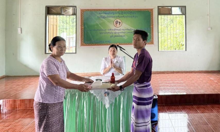 သင်တန်းဖွင့်ပွဲတွင် ကရင်ပြည်နယ်အသေးစားစက်မှုလက်မှုလုပ်ငန်းဦးစီးဌာန ညွှန်ကြားရေးမှူး ဒေါက်တာ ကြူကြူလှိုင်က အမှာစကားပြောကြားပြီး သင်ထောက်ကူပစ္စည်းများနှင့် သင်တန်းသုံး ကုန်ကြမ်းပစ္စည်းများအား သင်တန်းသူများထံ ပေးအပ်သည်။