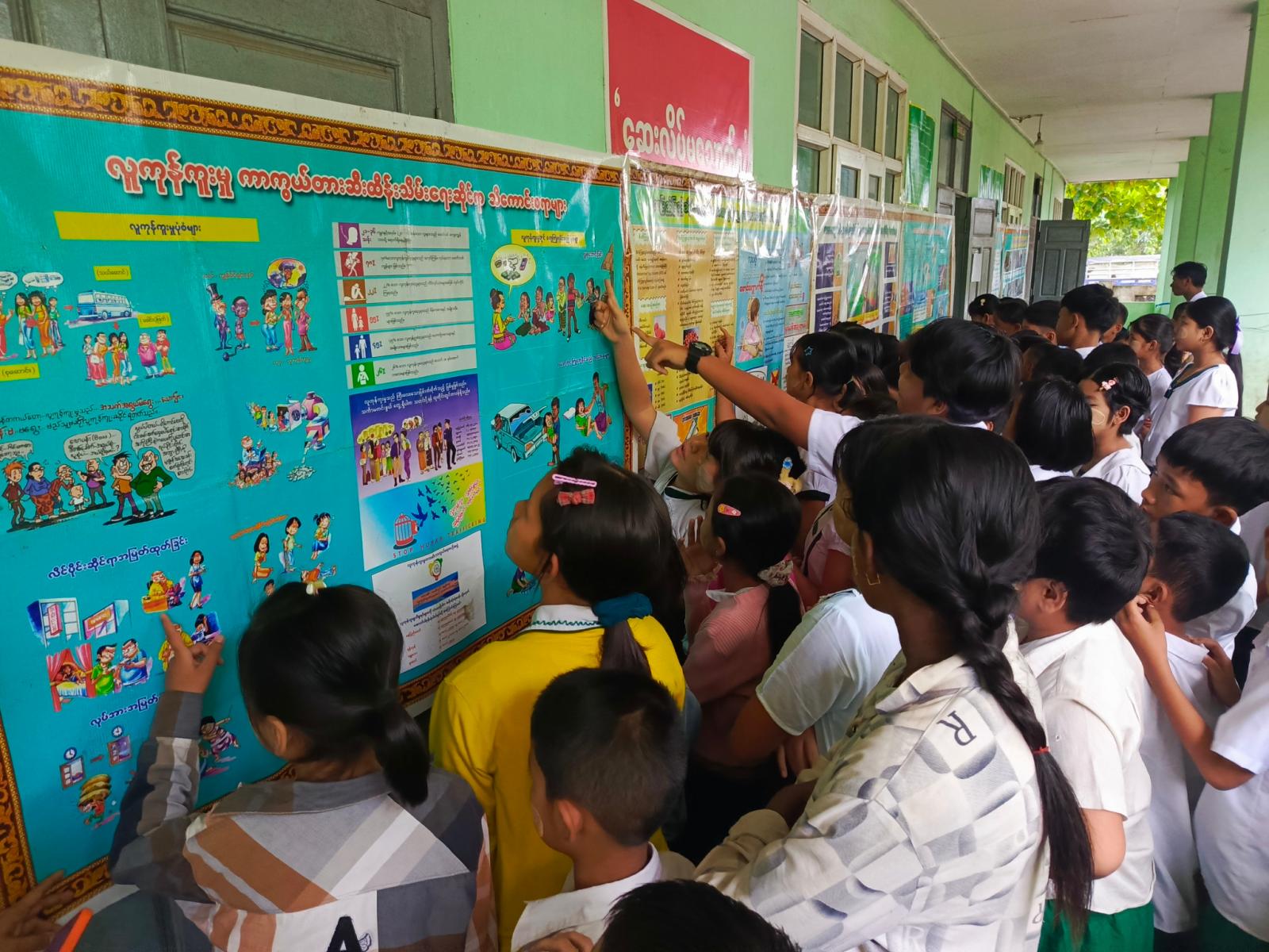 အဆိုပါ အသိပညာပေးလုပ်ငန်းတွင် ပြန်ကြားရေးနှင့်ပြည်သူ့ဆက်ဆံရေးဦးစီးဌာနမှ ကျောင်းသူ၊ ကျောင်းသားများ ဖတ်ရှုလေ့လာနိုင်ရန် ကလေးကဗျာများ၊ ရုပ်ပြပုံပြင်များ၊ စာစောင်များစသည့် ကလေးများအသိပညာတိုးပွားရေး စာအုပ်စာပေများနှင့် စာဖတ်ရှိန်မြှင့်တင်ရေး၊ မူးယစ်ဆေးဝါးအန္တရာယ်သတိပြုကာကွယ်ရေးစသည့်အသိပညာပေး နံရံကပ်စာစောင်များတို့ကို ခင်းကျင်းပြသရာ ကျောင်းသား၊ ကျောင်းသူများမှစိတ်ပါ၀င်စားစွာ ကြည့်ရှုလေ့လာခဲ့ကြောင်း သိရသည်။