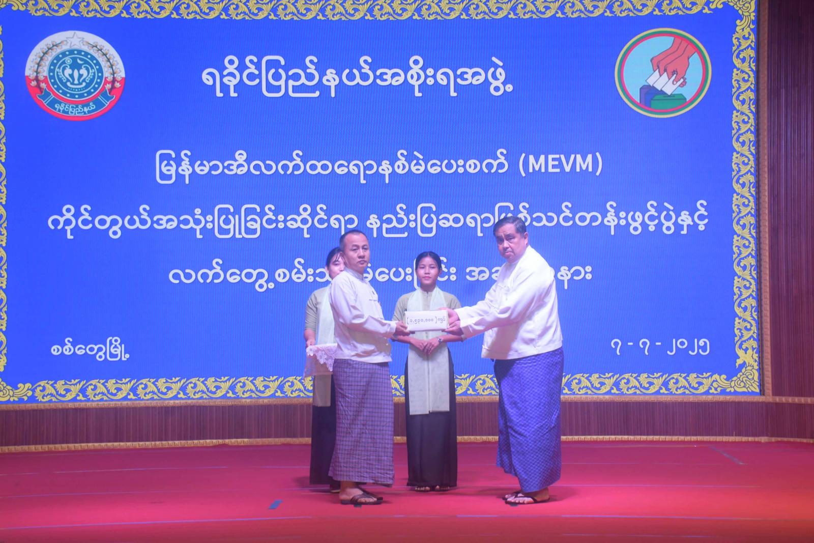 ထို့နောက် ပြည်နယ်ဝန်ကြီးချုပ် ဦးထိန်လင်းက သင်တန်းသား၊ သင်တန်းသူများအတွက် ချီးမြှင့်ငွေများပေးအပ်ရာ ပြည်နယ်ရွေးကောက်ပွဲအရာရှိက လက်ခံရယူသည်။