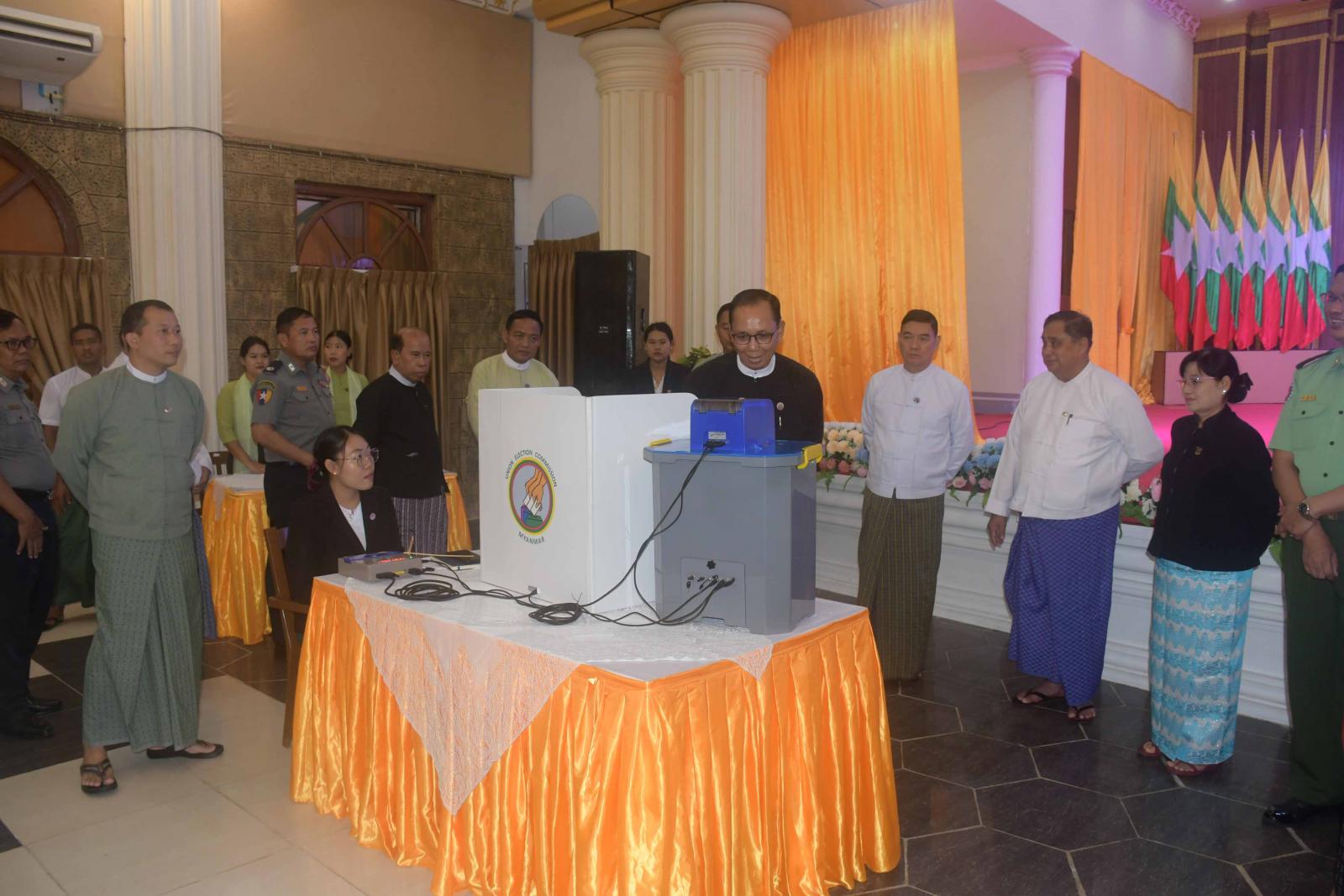 ထို့နောက် ရခိုင်ပြည်နယ်ဝန်ကြီးချုပ်နှင့်အဖွဲ့သည် မြန်မာအီလက်ထရောနစ် မဲပေးစက်ဖြင့် မဲပေးခြင်း၊ သရုပ်ပြသခြင်းတို့အား လိုက်လံကြည့်ရှုအားပေးကြသည်။