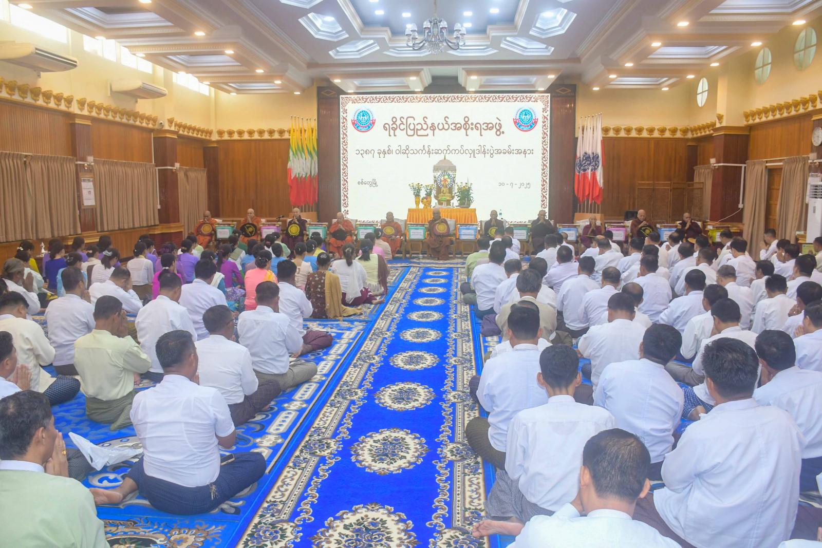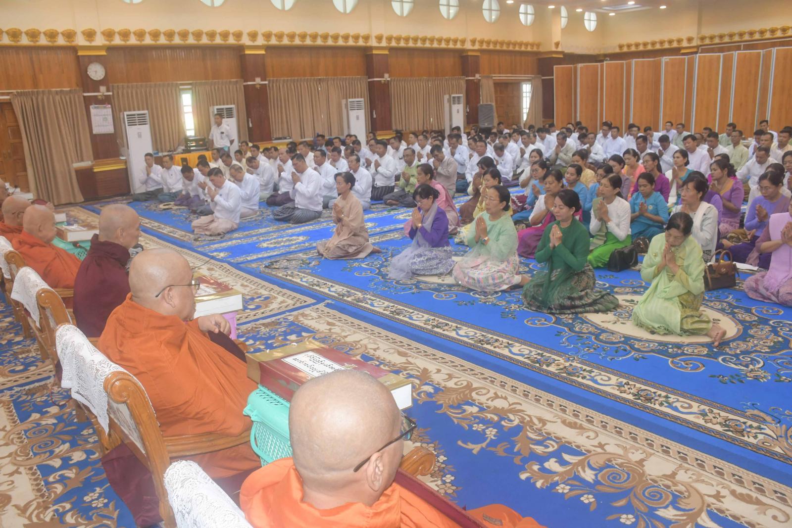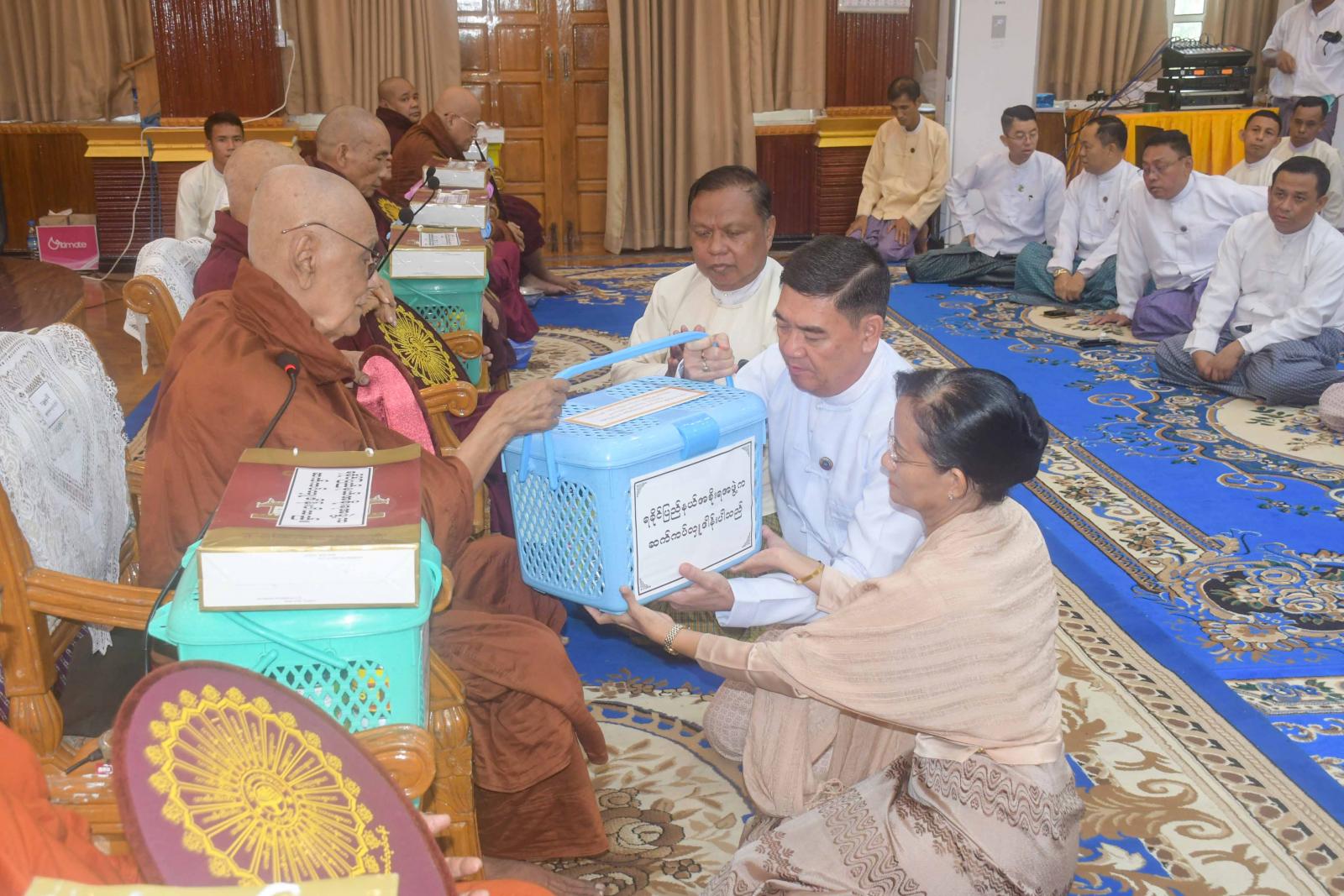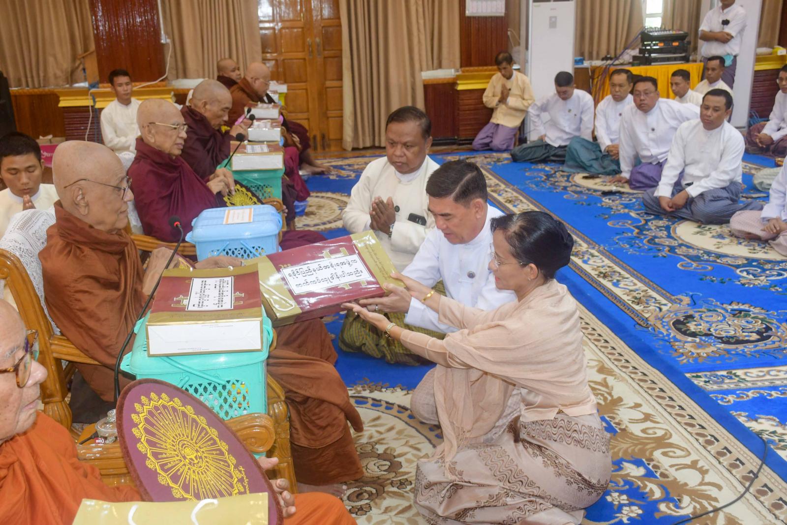 ဆက်လက်၍ အဘိဓဇမဟာရဋ္ဌဂုရု ဘဒ္ဒန္တနန္ဒသိရီ မဟာထေရ်မြတ်ထံမှ ပြည်နယ်ဝန်ကြီးချုပ် အမှူးပြုသော ဧည့်ပရိသတ်များက ငါးပါးသီလ ခံယူဆောက်တည်ကြပြီး သံဃာတော်အရှင်သူမြတ်များက ပရိတ်တရားတော်များ ရွတ်ပွားချီးမြှင့်တော်မူကြသည်။ ယင်းနောက် ပြည်နယ်ဝန်ကြီးချုပ်နှင့်ဇနီး၊ ပြည်နယ်တရားလွှတ်တော်တရားသူကြီးချုပ်၊ ပြည်နယ်အစိုးရအဖွဲ့ဝင်များနှင့် တာဝန်ရှိသူများက သံဃာတော် အရှင်သူမြတ်များအား ဝါဆိုသင်္ကန်းနှင့် လှူဖွယ်ဝတ္ထုပစ္စည်းများ ဆက်ကပ်လှူဒါန်းကြသည်။ ဆက်လက်၍ မြို့နယ်ဩဝါဒါစရိယ၊ စစ်တွေမြို့၊ ပညာလင်္ကာရ ကျောင်းတိုက်ပဓာနနာယကဆရာတော် အဂ္ဂမဟာဂန္ထဝါစကပဏ္ဍိတ ဘဒ္ဒန္တနာဂိန္ဒ မဟာထေရ်မြတ်ထံမှ ပြည်နယ်ဝန်ကြီးချုပ် အမှူးပြုသော ဧည့်ပရိသတ်များက အနုမောဒနာ တရားနာယူ၍ လှူဒါန်းမှုအစုစုအတွက် ရေစက်သွန်းချ အမျှပေးဝေကြပြီး အခမ်းအနားကို ဗုဒ္ဓသာသနံစိရံတိဋ္ဌတု သုံးကြိမ်ရွတ်ဆို ဆုတောင်း၍ ရုပ်သိမ်းကြသည်။