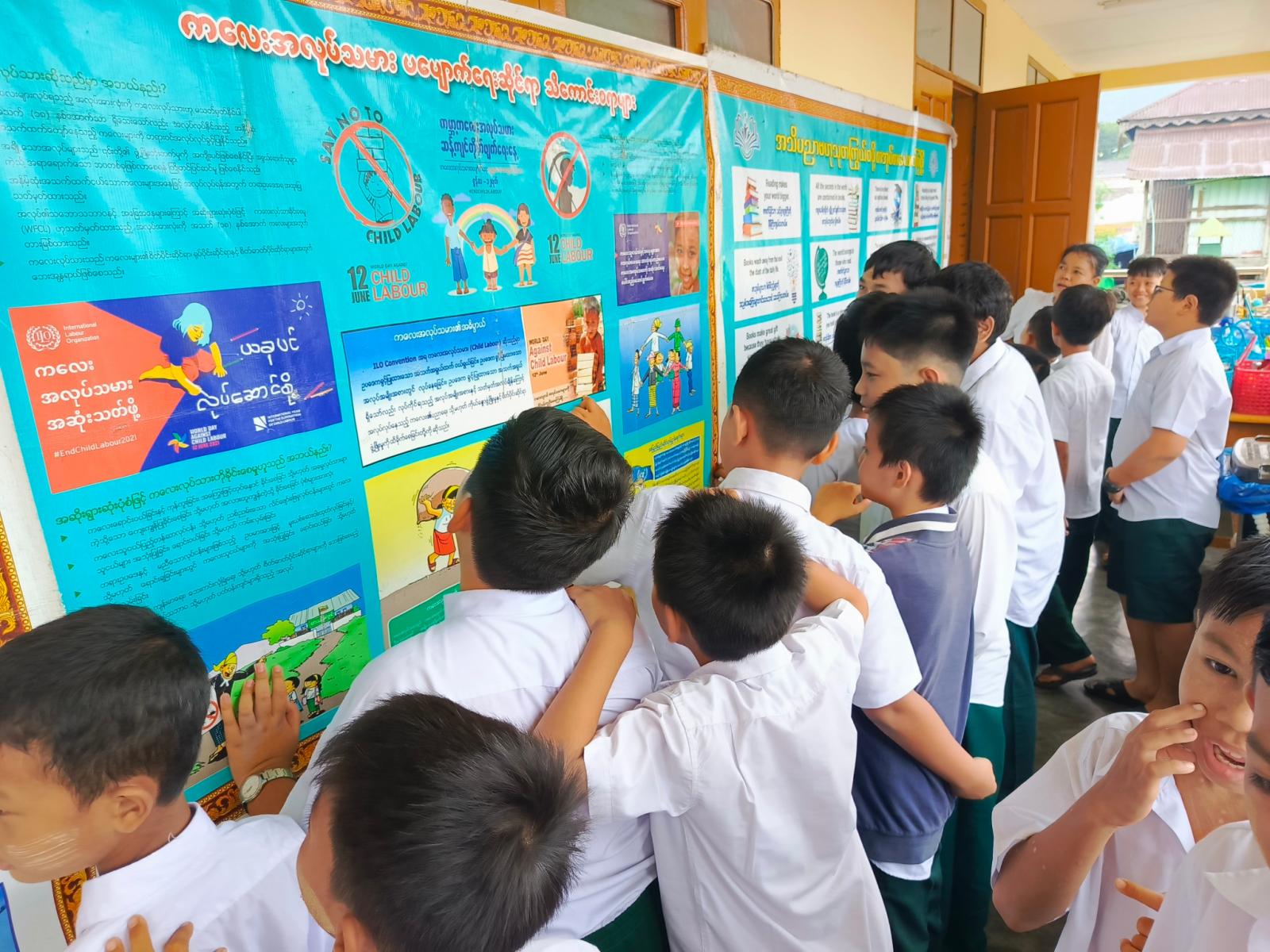အဆိုပါ အသိပညာပေးလုပ်ငန်းတွင် ပြန်ကြားရေးနှင့်ပြည်သူ့ဆက်ဆံရေးဦးစီးဌာနမှ ကျောင်းသူ၊ ကျောင်းသားများ ဖတ်ရှုလေ့လာနိုင်ရန် ကလေးကဗျာများ၊ ရုပ်ပြပုံပြင်များ၊ စာစောင်များ စသည့် ကလေးများအသိပညာတိုးပွားရေး စာအုပ်စာပေများနှင့် စာဖတ်ရှိန်မြှင့်တင်ရေး၊ ကလေးအလုပ်သမားပပျောက်ရေး စသည့်အသိပညာပေး နံရံကပ်စာစောင်များကို ခင်းကျင်းပြသရာ ကျောင်းသား၊ ကျောင်းသူများမှ စိတ်ပါ၀င်စားစွာ ကြည့်ရှုလေ့လာခဲ့ကြောင်း သိရသည်။
