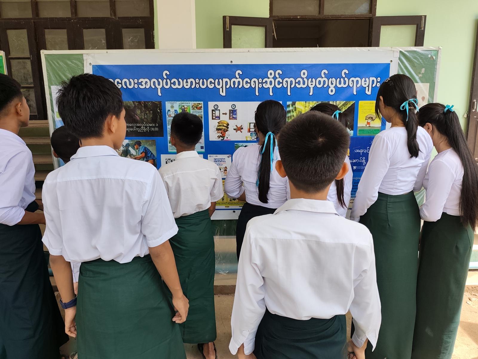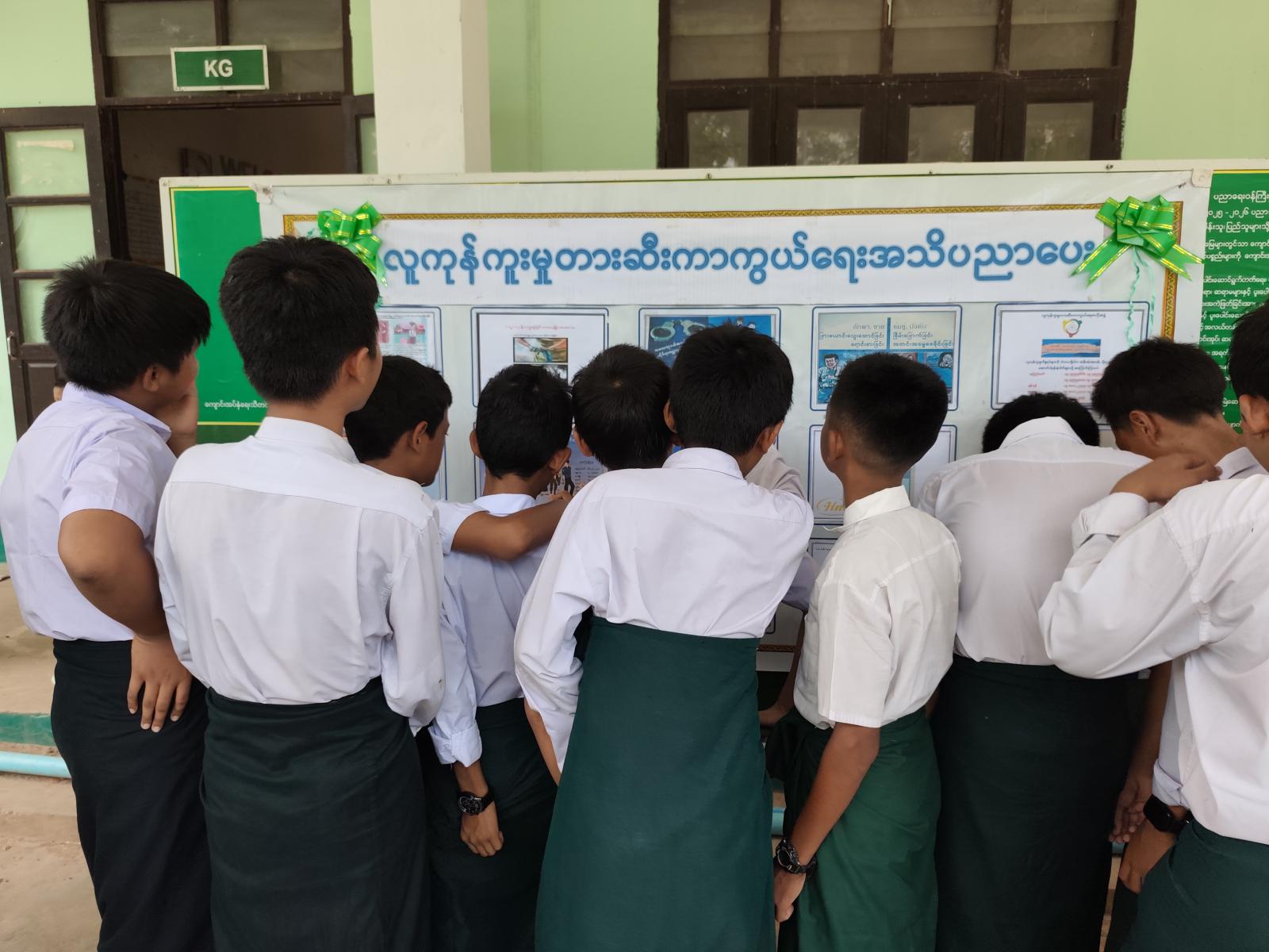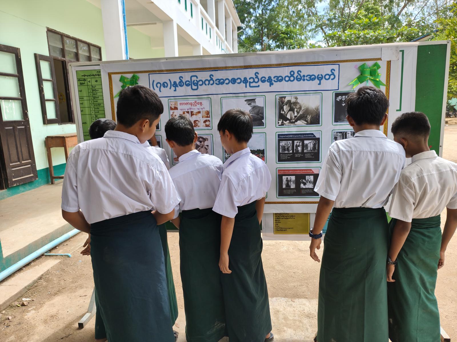 ဆက်လက်ပြီး အလယ်တန်းအဆင့် ကျောင်းသား၊ ကျောင်းသူများက ခရိုင် ပြန်ကြားရေးနှင့်ပြည်သူ့ဆက်ဆံရေးဦးစီးဌာနက ပြသထားသည့် စာအုပ်/စာစောင်၊ နံရံကပ် စာစောင်များအား လေ့လာကြည့်ရှုခဲ့ကြကြောင်း သိရသည်။