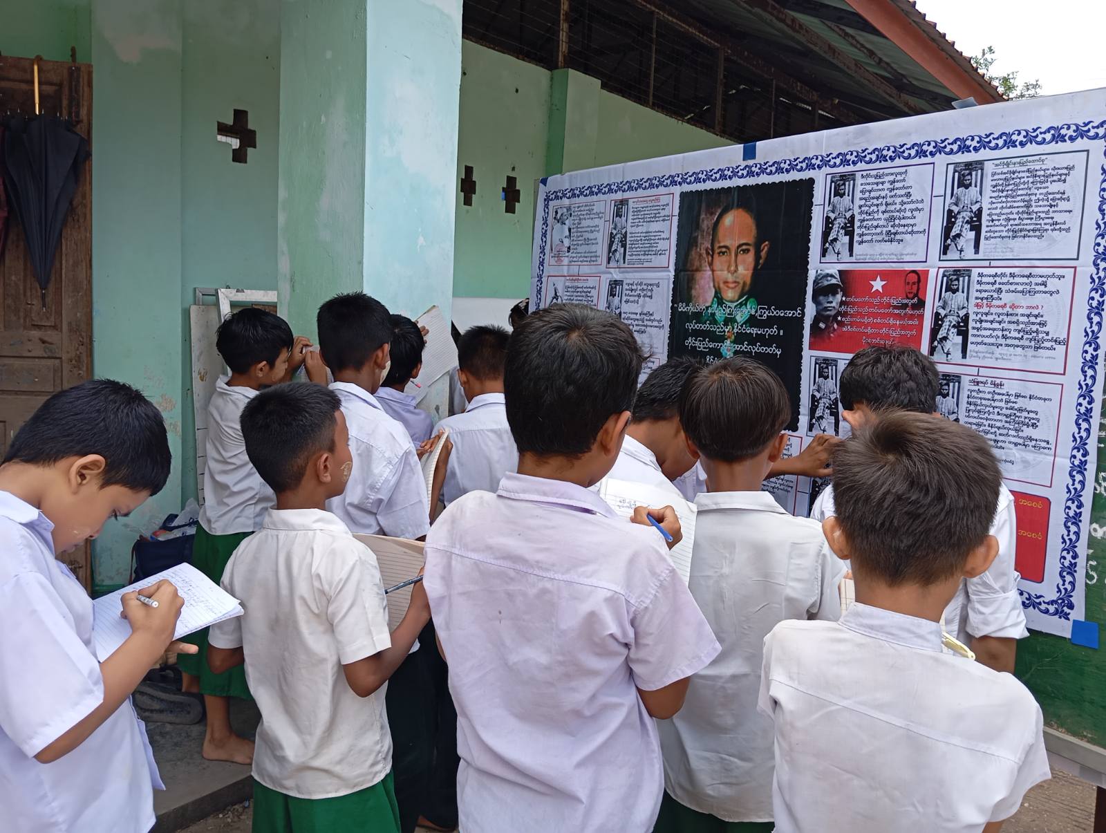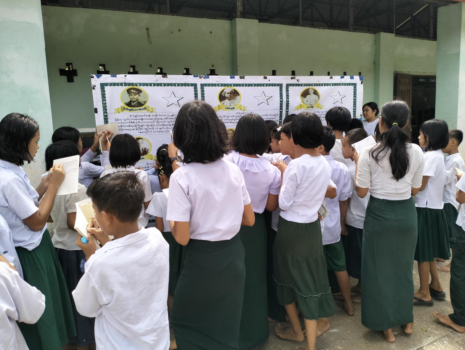 ဦးစွာ ကျောင်းအုပ်ဆရာမကြီးကအမှာစကားပြောကြားကာ မြို့နယ် ပြန်ကြားရေးနှင့်ပြည်သူ့ ဆက်ဆံရေးဦးစီးဌာနဦးစီးအရာရှိ ဒေါ်မိသူဇာက အာဇာနည်နေ့ဖြစ်ပေါ်လာပုံ သမိုင်းကြောင်းများနှင့် အာဇာနည်ခေါင်းဆောင်ကြီး ဗိုလ်ချုပ်အောင်ဆန်းအကြောင်း သိကောင်းစရာများဟောပြောခဲ့ပြီး ကျောင်းသား၊ ကျောင်းသူများကသိလိုသည်များကို ပြန်လည်ဖြေကြားပေးခြင်းနှင့် အာဇာနည်နေ့အထိမ်းအမှတ် စာအုပ်စာစောင်ပြသခြင်း၊ အာဇာနည်ခေါင်းဆောင်ကြီးများ၏ နိုင်ငံဖွံ့ဖြိုးရေး လုပ်ငန်းဆောင်ရွက်မှုမှတ်တမ်းဓါတ်ပုံများ၊ ကလေးစစ်သားလျော့နည်းပပျောက်ရေး အသိပညာပေးနံရံကပ်စာစောင်နှင့် ကလေးအလုပ်သမားလျော့နည်းပ ပျောက်ရေးစသည့် နံရံကပ်စာစောင်များ ပြသခဲ့ကြောင်းသိရသည်။