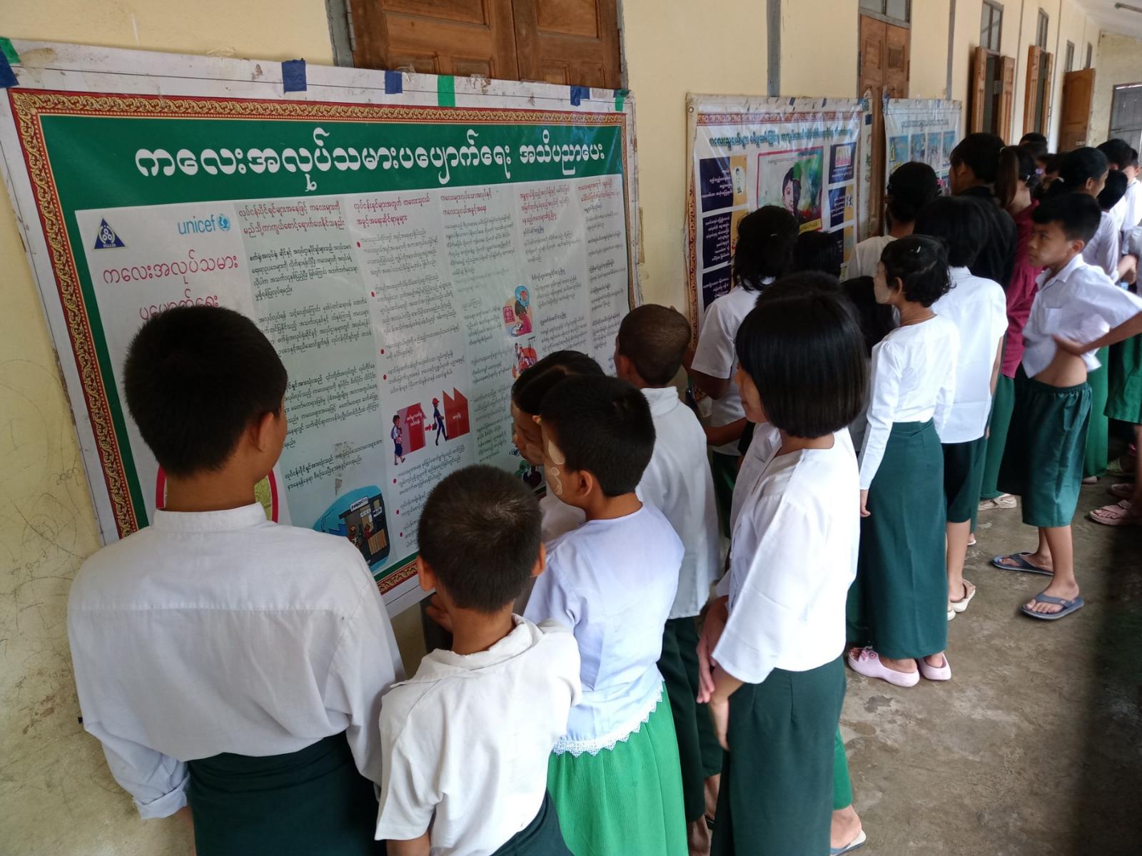 အဆိုပါအသိပညာပေးလုပ်ငန်းတွင် မူးယစ်ဆေးဝါးအန္တရာယ်တားဆီးကာကွယ်ရေး၊ ကလေးအလုပ်သမားပပျောက်ရေး၊ ကလေးသူငယ်များ စစ်မှုထမ်းခြင်းမှ ကာကွယ်တားဆီးရေးဆိုင်ရာသိကောင်းစရာ စသည့်အသိပညာပေးနံရံကပ်စာစောင်များကို ခင်းကျင်းပြသခဲ့ရာ ကျောင်းသား၊ ကျောင်းသူများက စိတ်ပါ၀င်စားစွာ ကြည့်ရှုလေ့လာခဲ့ကြောင်း သိရသည်။