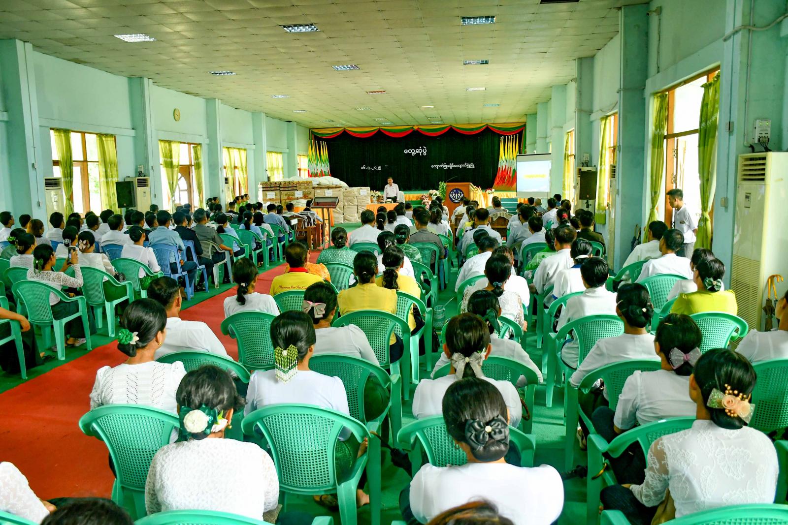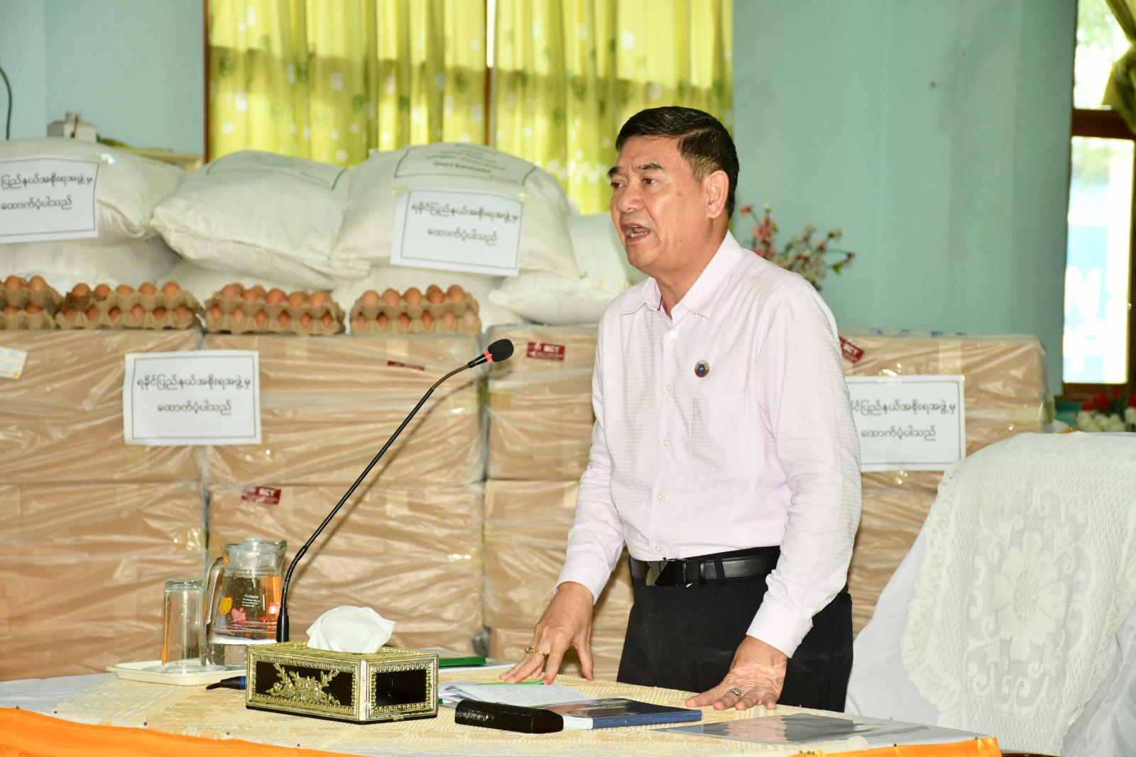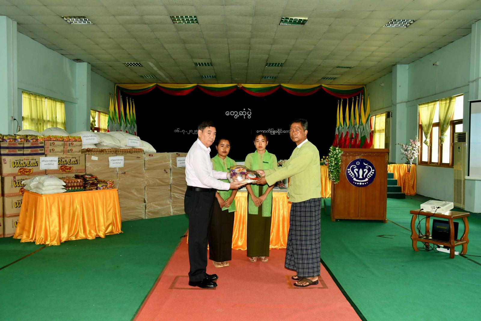 ယင်းနောက် ပြည်နယ်ဝန်ကြီးချုပ်က ခရိုင်နှင့်မြို့နယ်အဆင့်ဌာနဆိုင်ရာများအတွက် ဆန်နှင့်အခြေခံစားသောက်ကုန်များကို ပေးအပ်ရာ တာဝန်ရှိသူများက လက်ခံရယူကြသည်။