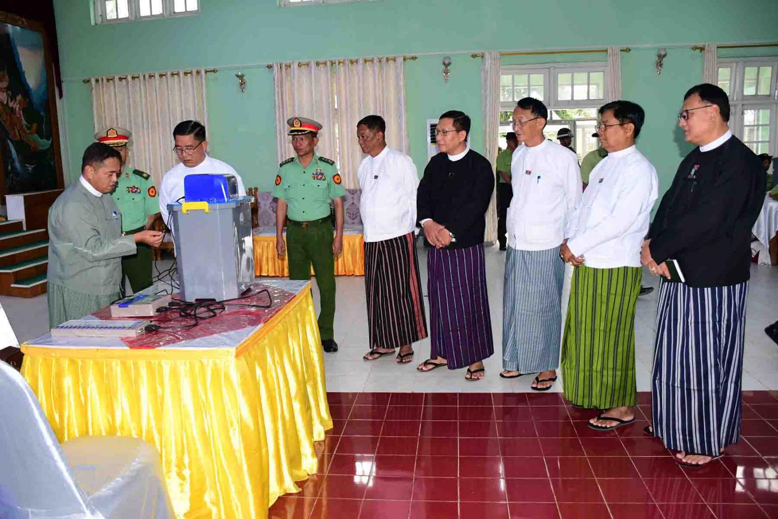ထို့နောက် ပြည်နယ်ဝန်ကြီးချုပ်နှင့် တာဝန်ရှိသူများအား လွိုင်ကော်မြို့နယ်ခန်းမ၌ MEVM အသုံးပြုပုံများကို ပြည်နယ်ရွေးကောက်ပွဲအရာရှိက လက်တွေ့သရုပ်ပြရှင်းလင်းတင်ပြခဲ့ပြီး MEVM အသုံးပြုနည်းသင်တန်းဖွင့်လှစ်ပို့ချနေမှုနှင့် သင်တန်းသား၊ သင်တန်းသူများက စိတ်ပါဝင်စားစွာ လက်တွေ့ဆောင်ရွက်နေမှုများအား ကြည့်ရှုအားပေးခဲ့သည်။