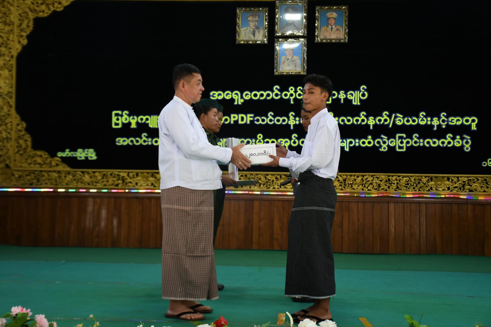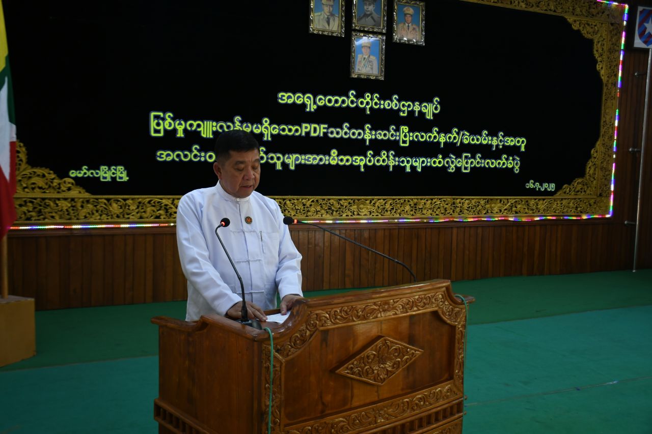 ဦးစွာ ပြည်နယ်ဝန်ကြီးချုပ် ဦးအောင်ကြည်သိန်းနှင့် တိုင်းမှူး ဗိုလ်ချုပ်ကျော်လင်းမောင်တို့က ဂုဏ်ပြုအမှာစကားများပြောကြားပြီး ပြစ်မှုကျူးလွန်ခြင်းမရှိသော PDF သင်တန်းဆင်း လူငယ် (၅)ဦးမှ လက်နက်များပေးအပ်ကြရာ ပြည်နယ်ဝန်ကြီးချုပ်၊ တိုင်းမှူးနှင့် ပြည်နယ်ဝန်ကြီးတို့ကလက်ခံရယူကြပြီး ဂုဏ်ပြုလက်ဆောင်နှင့် ထောက်ပံ့ငွေများပေးအပ်ခဲ့သည်။ ထို့နောက် ဥပဒေဘောင်အတွင်း ပြန်လည်ဝင်ရောက်ခဲ့သည့် ပြစ်မှုကျူးလွန်ခြင်းမရှိသော PDF သင်တန်းဆင်းလူငယ်များကိုယ်စား တစ်ဦးမှ ကျေးဇူးတင်စကား ပြန်လည်ပြောကြားပြီး ပြည်နယ်ဝန်ကြီးချုပ်၊ တိုင်းမှူးနှင့် တာဝန်ရှိသူများက ဥပဒေဘောင်အတွင်း ပြန်လည်ဝင်ရောက်လာသူများနှင့် မိသားစုဝင်များအား ရင်းရင်းနှီးနှီး တွေ့ဆုံနှုတ်ဆက် အားပေးစကားများ ပြောကြားခဲ့သည်။