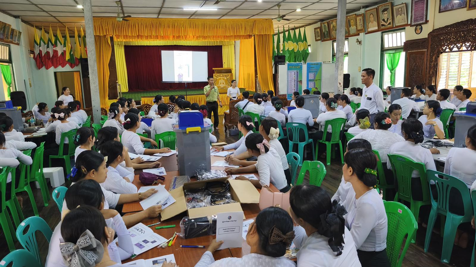 သင်တန်းဖွင့်ပွဲအခမ်းအနားတွင် မြို့နယ်စီမံအုပ်ချုပ်ရေးအဖွဲ့ဥက္ကဋ္ဌ ဦးပြည်သိမ်းက အဖွင့်အမှာစကားပြောကြားပြီး မြို့နယ်ရွေးကောက်ပွဲအရာရှိ ဒေါ်ခိုင်ချိုချိုထက်၊ ဒုမြို့နယ်အုပ်ချုပ်ရေးမှူး၊ ဒုမြို့နယ်ပညာရေးမှူးနှင့် သင်တန်းနည်းပြများက မြန်မာအီလက်ထရောနစ် မဲပေးစက် (MEVM) ကိုင်တွယ်အသုံးပြုနည်းအဆင့်ဆင့် ထိန်းချုပ်စက်ကိုင်တွယ်နည်း၊ ထိန်းချုပ်စက်ကိုင်တွယ်သူအတွက် လုပ်ငန်းစဥ်တို့ကို ဆွေးနွေးသင်ကြားပို့ချပေးသည်။