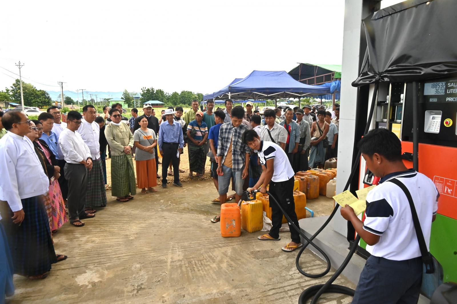 ယင်းနောက် ပြည်နယ်ဝန်ကြီးချုပ်၊ ပြည်နယ်တရားလွှတ်တော်တရားသူကြီးချုပ်၊ ပြည်နယ်အစိုးရအဖွဲ့ဝင် ဝန်ကြီးများ၊ ပြည်နယ်ဥပဒေချုပ်တို့သည် ပြည်နယ်အဆင့်ဌာနဆိုင်ရာ တာဝန်ရှိသူများနှင့်အတူ ရထိုက်တန် ဆီဆိုင်၌ စိုက်ပျိုးရေးဦးစီးဌာန ဝန်ထမ်းများက ဝိုင်းဝန်းကူညီကြီးကြပ်ပေးမှုဖြင့် မြစ်ကြီးနားနှင့် ဝိုင်းမော်မြို့နယ်အတွင်းရှိ တောင်သူများအတွက် ပြည်နယ်စက်သုံးဆီတင် သွင်းသိုလှောင်ဖြန့်ဖြူးခြင်း လုပ်ငန်းကြီးကြပ်မှုကော်မတီ၏ ရည်ညွှန်းလက်လီဈေးနှုန်းဖြစ်သည့် ဒီဇယ်တစ်လီတာလျှင်ငွေကျပ် (၅၂၀၀)ကျော်ဖြင့် လယ်တစ်ဧကလျှင် ၄ ဂါလံနှုန်း ရောင်းချပေးနေမှုအခြေအနေများကို ကြည့်ရှုအားပေးခဲ့ကြပြီး တောင်သူများအား ရင်းရင်းနှီးနှီး လိုက်လံနှုတ်ဆက်ခဲ့ကြသည်။