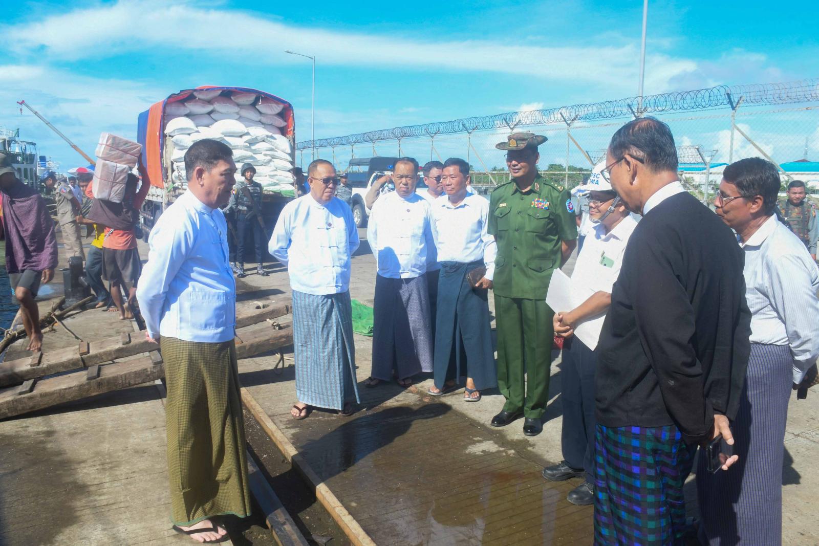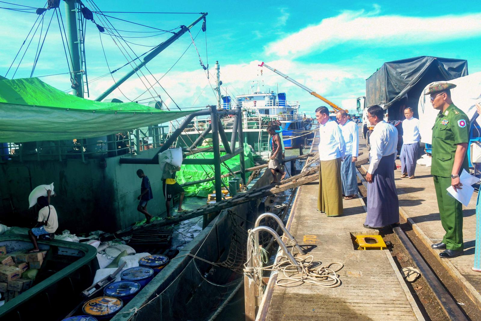အမျိုးသားသဘာဝဘေးအန္တရာယ်ဆိုင်ရာစီမံခန့်ခွဲမှုကော်မတီ၏ လမ်းညွှန်မှုအရ ရခိုင်ပြည်နယ် အစိုးရအဖွဲ့နှင့် ရန်ကုန်တိုင်းဒေသကြီးအစိုးရအဖွဲ့၏ စီစဉ်ကြီးကြပ်မှုဖြင့် ရခိုင်ပြည်နယ်သို့ သင်္ဘောများဖြင့် ဆန်နှင့်အခြေခံ စားသောက်ကုန်ပစ္စည်းများကို ပို့ဆောင်ပေးလျက်ရှိရာ စစ်တွေမြို့ ဘက်စုံသုံးဆိပ်ကမ်းတွင် MV-ALLIANCE (002)သင်္ဘော၊ အမ်ဗွီတော်ဝင်သီရိသင်္ဘော၊ အမ်ဗွီတော်ဝင် ရတနာသင်္ဘော၊ အမ်ဗွီရဲထွန်းအောင်(၃)သင်္ဘောနှင့် အမ်ဗွီအောင်ရတနာ(၁)သင်္ဘောတို့ဖြင့် ရန်ကုန်မြို့မှတည်ဆောက်ရေးသုံးပစ္စည်းများ၊ ဆန်နှင့်အခြေခံစားသောက်ကုန် ပစ္စည်းများ၊ လူသုံးကုန်ပစ္စည်းများရောက်ရှိလာမှုကို ရခိုင်ပြည်နယ်ဝန်ကြီးချုပ် ဦးထိန်လင်းနှင့်တာဝန်ရှိသူများ ဇူလိုင် ၂၂ ရက် နံနက်ပိုင်းက သွားရောက်ကြည့်ရှုစစ်ဆေးသည်။