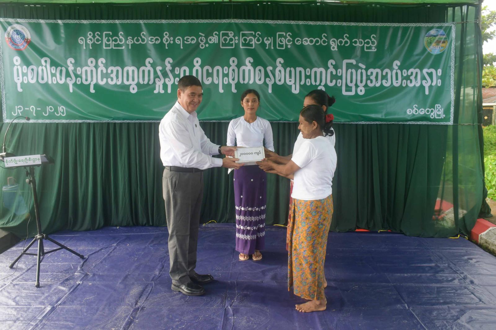 ဆက်လက်၍ ပြည်နယ်ဝန်ကြီးချုပ်က ကောက်စိုက်လုံမေများအား အမှတ်တရ လက်ဆောင်များ ပေးအပ်ပြီး ကွင်းပြပွဲသို့ တက်ရောက်လာကြသည့် တောင်သူများအား ရင်းရင်းနှီးနှီး တွေ့ဆုံနှုတ်ဆက်သည်။