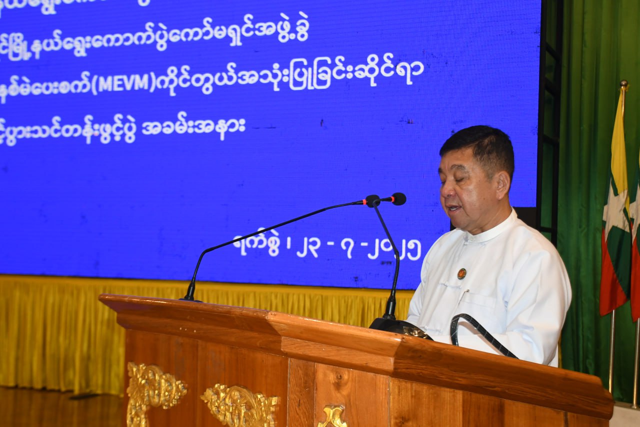 ဦးစွာ အခမ်းအနားတွင် ပြည်နယ်ဝန်ကြီးချုပ် ဦးအောင်ကြည်သိန်းက မြန်မာနိုင်ငံရွေးကောက်ပွဲသမိုင်းတွင် ယခုရွေးကောက်ပွဲသည် အီလက်ထရောနစ်စက်ကို အသုံးပြု၍ကျင်းပမည့် ပထမဆုံးရွေးကောက်ပွဲဖြစ်ကြောင်း၊ မဲဆန္ဒရှင်ပြည်သူများ လွယ်ကူစွာမဲပေးနိုင်ရေးနှင့် မဲပေးစက်ကိုင်တွယ်မည့်သူများ စနစ်တကျကိုင်တွယ်နိုင်ရေးသည် အဓိကကျသောအပိုင်းဖြစ်၍ မဲပေးစက်တည်ဆောက်ပုံနည်းလမ်းများ၊ စက်တပ်ဆင်ပုံ၊ စမ်းသပ်မဲပေးပုံ၊ ဖြန့်ခွဲပုံ၊ ရွေးကောက်ပွဲနေ့တွင် မဲရုံ၌ မဲပေးစက်တပ်ဆင်ခင်းကျင်းပုံ၊ မဲရလဒ်ရေတွက်ပုံ၊ နည်းဥပဒေပါအတိုင်း မဲရလဒ်စာရင်းပြုစုပုံ၊ မဲပေးစက်အား ပြန်လည်ထုပ်ပိုးသိမ်းဆည်းပုံတို့ကို လုပ်ငန်းလမ်းညွှန်ချက်များနှင့်အညီ ယခုသင်တန်းတွင် စနစ်တကျသင်ကြားပြသပေးမည်ဖြစ်ကြောင်း၊ မဲရုံအသီးသီးတွင် မဲပေးစက်၊ ထိန်းချုပ်စက် (Control Unit) ကို ကိုင်တွယ်ကြီးကြပ်ရမည့် မဲရုံအဖွဲ့ဝင်များအနေဖြင့် မဲပေးစက်အစိတ်အပိုင်း တစ်ခုစီ၏ ဖွဲ့စည်းတည်ဆောက်ထားမှု ဆန္ဒမဲပေးသည့်လုပ်ငန်းကို ဆောင်ရွက်မှု စသည်တို့ကို ကျွမ်းကျွမ်းကျင်ကျင်ဖြင့်သိရှိပြီး လက်တွေ့ကိုင်တွယ်အသုံးပြုတတ်စေရန်ရည်ရွယ်၍ သင်တန်းဖွင့်လှစ်ခြင်းဖြစ်ကြောင်း၊ လာမည့် ပါတီစုံဒီမိုကရေစီအထွေထွေရွေးကောက်ပွဲတွင် မြန်မာအီလက်ထရောနစ်မဲပေးစက် (MEVM) အသုံးပြု၍ မဲပေးခြင်းဖြင့် ပယ်မဲဖြစ်ပေါ်မှုမရှိခြင်း၊ မဲရေတွက်ခြင်းအတွက် အချိန်ကြန့်ကြာမှုများ၊ ကိန်းဂဏန်းလွှဲမှားမှုများကိုကျော်လွှားပြီး အချိန်တိုအတွင်း တိကျမှန်ကန်သည့် မဲရလဒ်များ ထုတ်ပြန်ဆောင်ရွက်နိုင်မည်ဖြစ်ပြီး အငြင်းပွားဖွယ်ဖြစ်ရပ်များ၊ မဲမသမာမှုများလည်း မရှိနိုင်တော့ဘဲ ပွင့်လင်းမြင်သာသည့် တရားမျှတပြီး သိက္ခာရှိသည့် ရွေးကောက်ပွဲတစ်ရပ် ဖြစ်လာမည်ဖြစ်ကြောင်း ပြောကြားသည်။