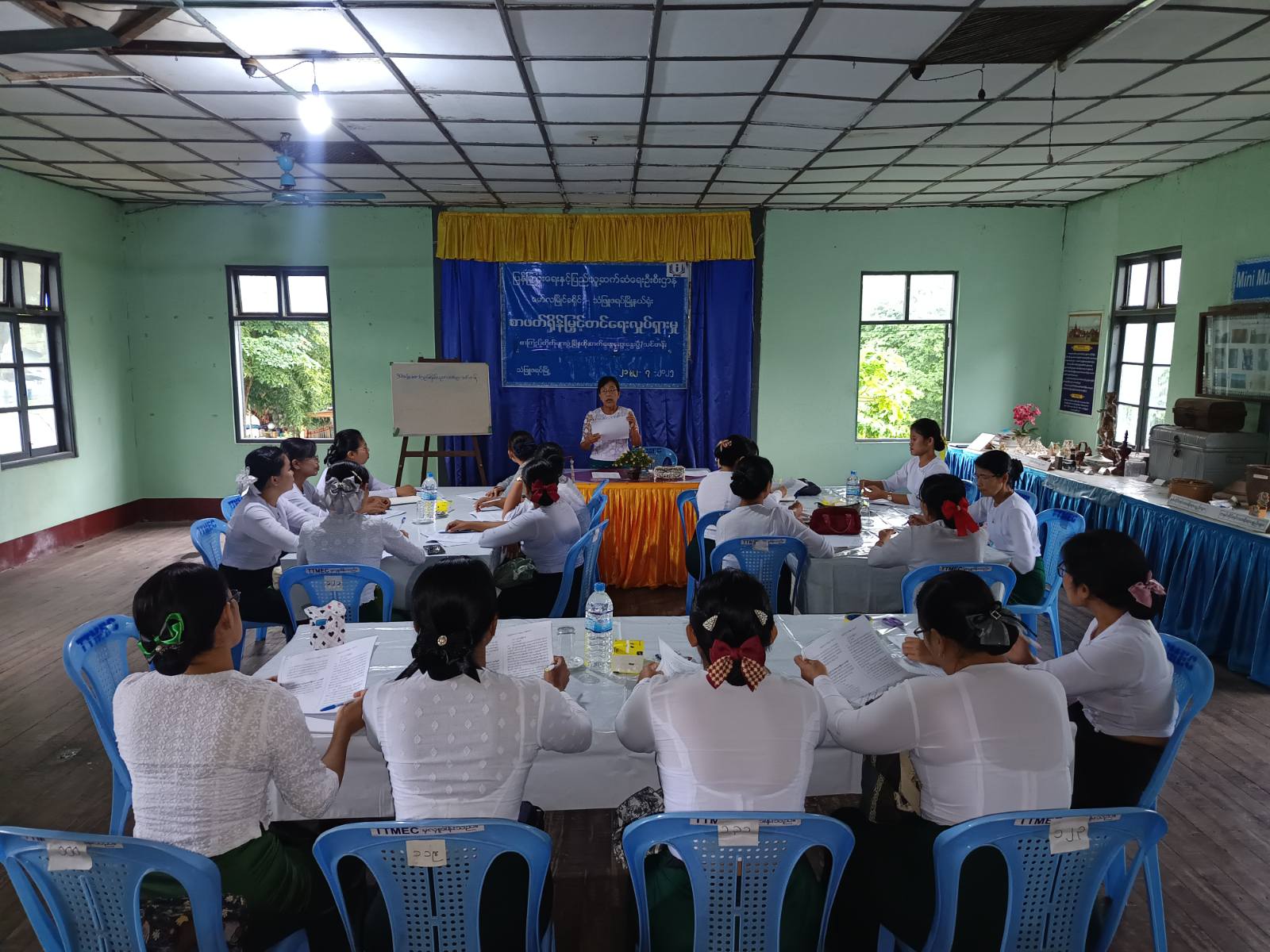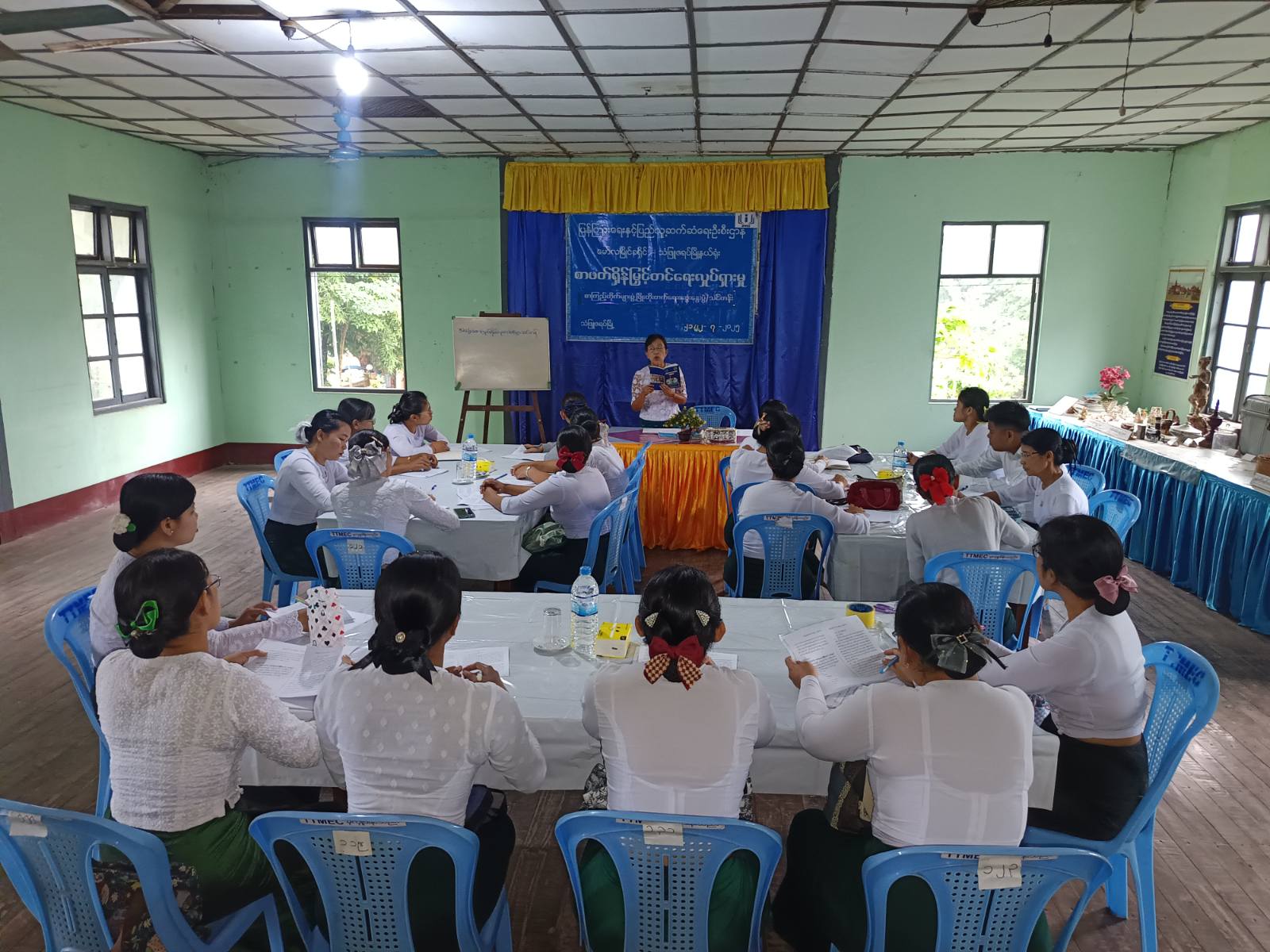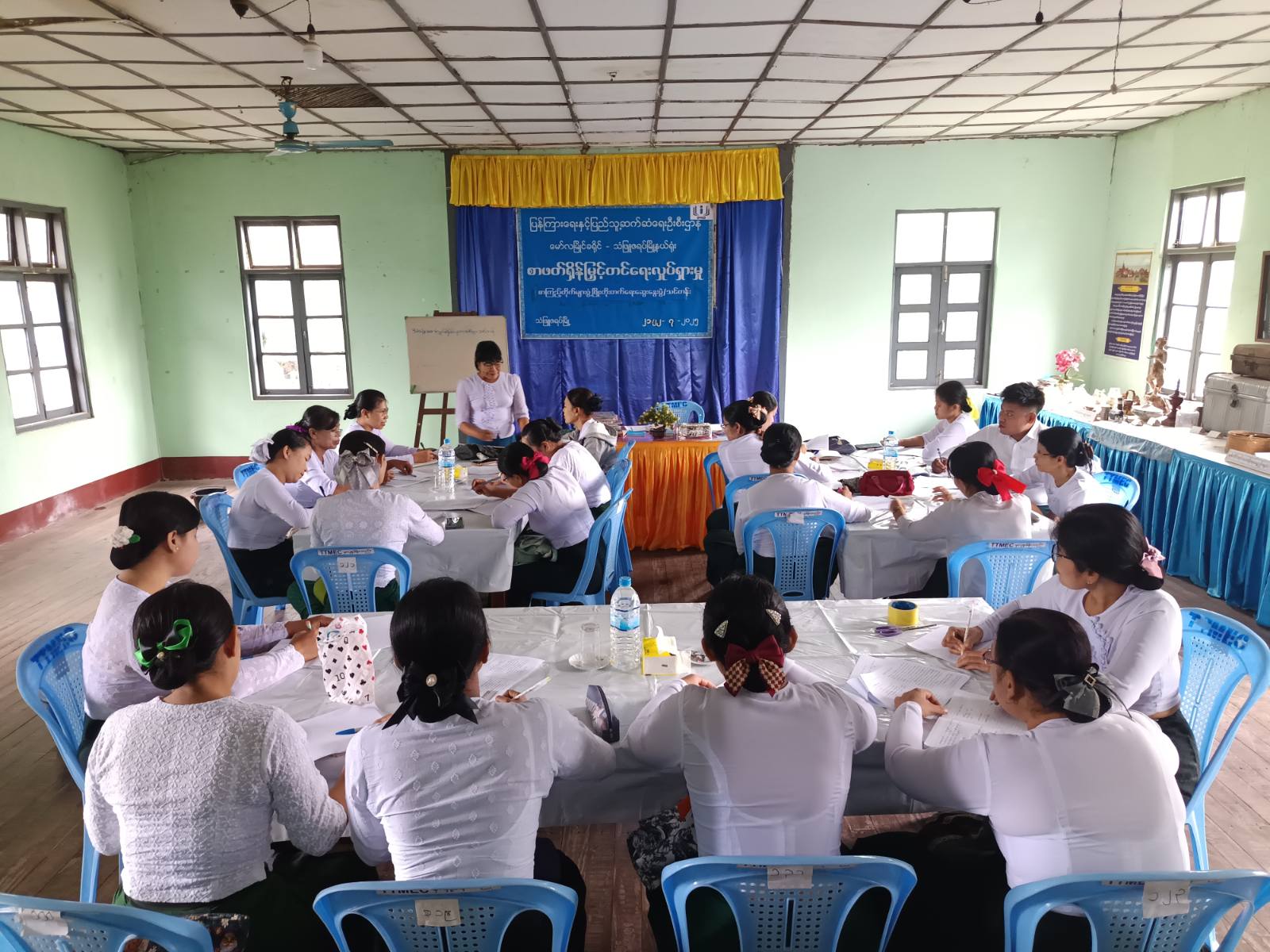 သင်တန်းတွင် မြို့နယ်ပြန်ကြားရေးနှင့်ပြည်သူ့ဆက်ဆံရေးဦးစီးဌာန ဦးစီးအရာရှ်ိဒေါ်အေးအေးသီက ယခုဖွင့်လှစ်သည့်စာကြည့်တိုက်များဖွံ့ဖြိုးတိုးတက်ရေးဆွေးနွေးပွဲနှင့် သင်တန်းကိုတက်ရောက်ခဲ့ကြသည့် မြို့နယ်အတွင်းရှိအခြေခံပညာကျောင်းများမှ စာကြည့်တိုက်တာဝန်ခံ ဆရာ၊ ဆရာမများအနေဖြင့် စာကြည့်တိုက်များဖွံ့ဖြိုးတိုးတက်ရေးအတွက် ယခုဆွေးနွေးမှုများအပေါ် အောင်မြင်စွာအကောင်အထည်ဖော်ဆောင်ရွက်ကြစေရေး၊ အခြေခံပညာကျောင်းစာကြည့်တိုက်များဖွံ့ဖြိုးတိုးတက်မှသာလျှင် အနာဂတ်နိုင်ငံတော်ကို ကောင်းမွန်စွာဖော်ဆောင်နိုင်မည်ဖြစ်ကြောင်း ရှင်းလင်းပြောကြားသည်။