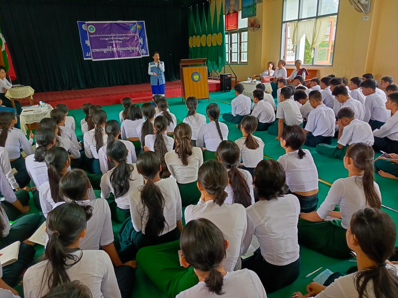 အသိပညာပေးဟောပြောရာတွင် ခရိုင်ဘေးအန္တရာယ်ဆိုင်ရာစီမံခန့်ခွဲမှုဦးစီးဌာနမှ လက်ထောက်ညွှန်ကြားရေးမှူး ဒေါ်နှင်းသီတာက နှစ်စဉ်မြန်မာနိုင်ငံအတွင်း အဖြစ်များသည့် သဘာဝဘေး(၉)မျိုးနှင့်ဖြစ်ပွားပုံများ၊ မုန်တိုင်းဘေးဖြစ်ပွားတတ်သည့်ကာလ၊ မုန်တိုင်းသတိပေးချက် အဝါ၊ လိမ္မော်၊ အနီ၊ အညို၊ အစိမ်းအရောင် ငါးမျိုးတို့အလိုက် မုန်တိုင်းဖြစ်စဉ်များ၊ သတိပြုရမည့်အခြေအနေများ၊ ငလျင်ဘေးဖြစ်ပွားမှုနှင့် ဘေးအန္တရာယ်ကင်းရှင်းရေး သတိပြုလိုက်နာရမည့်အချက်များ စသည်တို့ကို ရှင်းလင်းဟောပြောရာ ကျောင်းသား၊ ကျောင်းသူတို့က သိလိုသည်တို့ကို ပြန်လည်ဆွေးနွေးမေးမြန်းခဲ့ကြသည်။