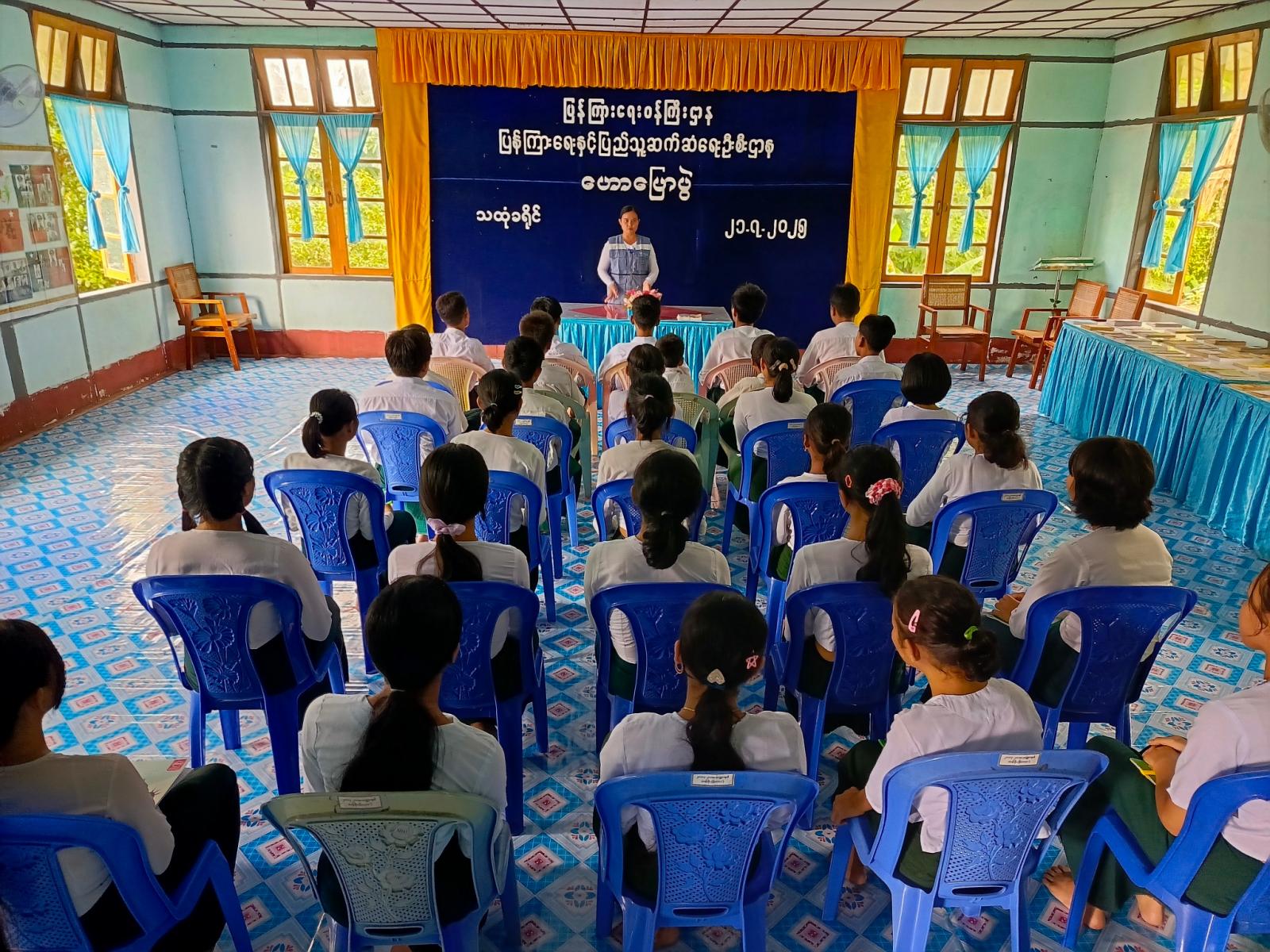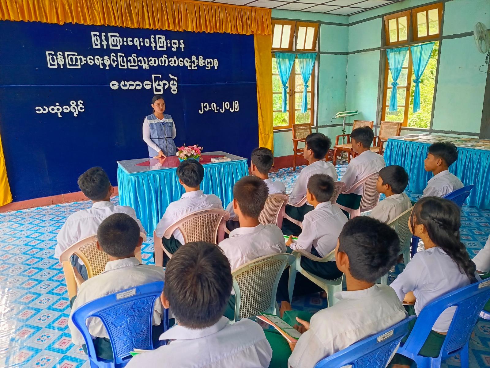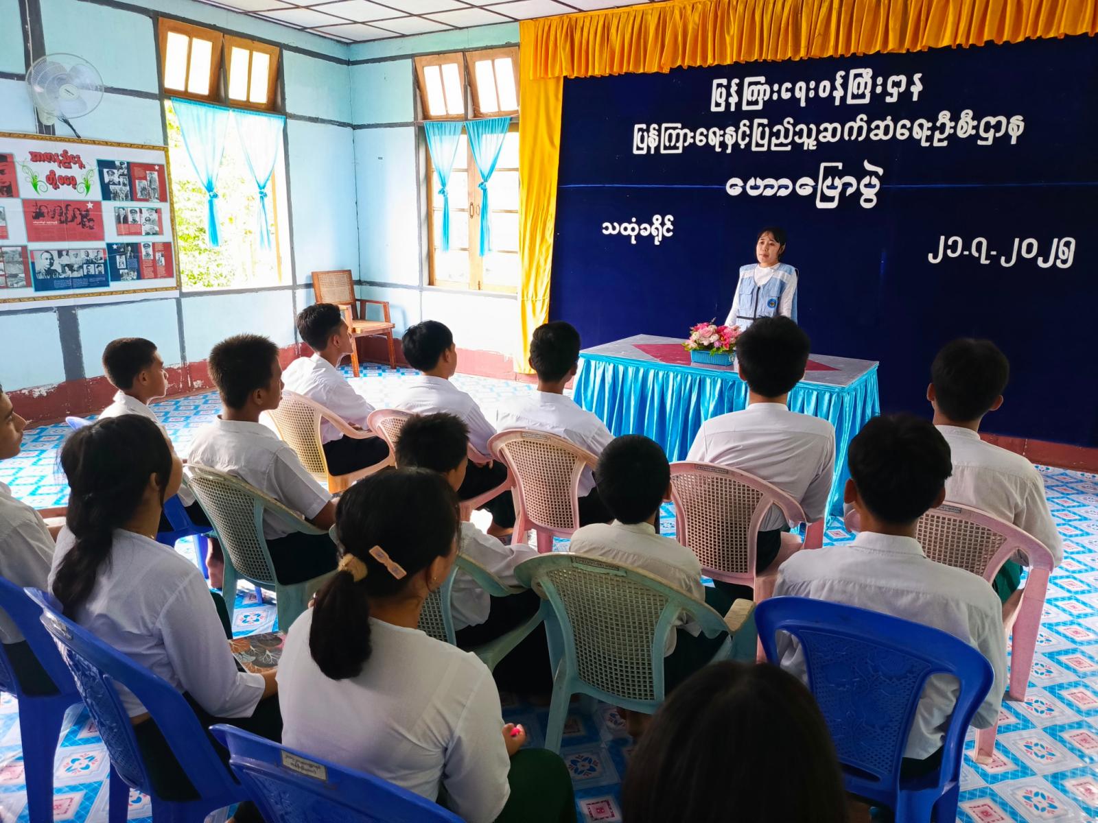 အသိပညာပေးဟောပြောပွဲတွင် ဘေးအန္တရာယ်ဆိုင်ရာစီမံခန့်ခွဲမှုဦးစီးဌာနမှဝန်ထမ်းများက မြန်နိုင်ငံအတွင်းအဖြစ်များသည့် သဘာဝဘေး(၉)မျိုးနှင့်ဖြစ်ပွားပုံများ၊ မုန်တိုင်းဘေးဖြစ်ပွားတတ်သည့်ကာလ၊ မုန်တိုင်းသတိပေးချက် အဝါ၊ လိမ္မော်၊ အနီ၊ အညို၊ အစိမ်း အရောင် ငါးမျိုးတို့၏အဓိပ္ပါယ်များ၊ မုန်တိုင်းဘေးမဖြစ်ပွားမီ၊ ဖြစ်ပွားဆဲနှင့်ဖြစ်ပွားပြီးနောက် စနစ်တကျဆောင်ရွက်ရမည့်လုပ်ငန်းစဉ်များနှင့် သတိပြုရမည့်အခြေအနေများ၊ ငလျင်ဘေးဖြစ်ပွားမှုနှင့်ဘေး အန္တရာယ်ကင်းရှင်းရေး သတိပြုလိုက်နာရမည့်အချက်များ၊ ငလျင်ဘေးဖြစ်ပွားပါကစနစ်တကျဆောင်ရွက်ရမည့်အချက်များ စသည်တို့ကိုအကျယ်တဝင့်ရှင်းလင်းဟောပြောပြီး သဘာဝဘေးအသိပညာပေး လက်ကမ်းစာစောင်များ ဝေငှပေးခဲ့ကြသည်။