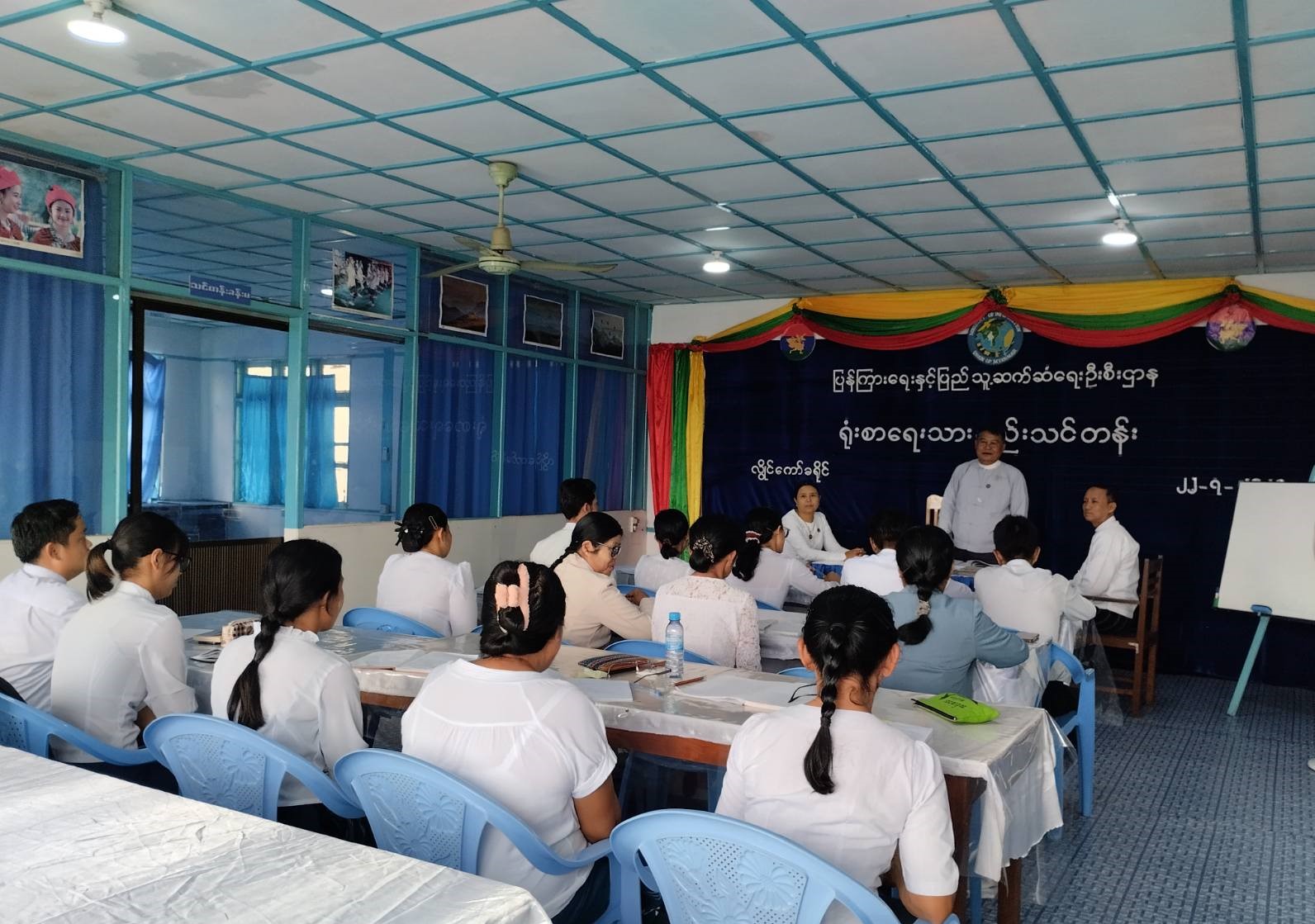 ထို့နောက် ပြည်နယ်ဒုတိယညွှန်ကြားရေးမှူး ဒေါ်နန်းမေစုအောင်က သင်တန်းတွင် ပို့ချဆွေးနွေးမည့်ဘာသာရပ်များနှင့် သင်တန်းစည်းကမ်းများအား ရှင်းလင်းဆွေးနွေးပြီး သင်တန်းနည်းပြများဖြစ်သည့် ညွှန်ကြားရေးမှူး၊ ဒုတိယညွှန်ကြားရေးမှူးနှင့် လွိုင်ကော်ခရိုင် လက်ထောက်ညွှန်ကြားရေးမှူးတို့က ပြည်ထောင်စုရာထူးဝန်အဖွဲ့ကထုတ်ဝေသည့် ရုံးလုပ်ငန်းလက်စွဲစာအုပ်ပါ အကြောင်းအရာများကို ဆွေးပို့ချသည်။