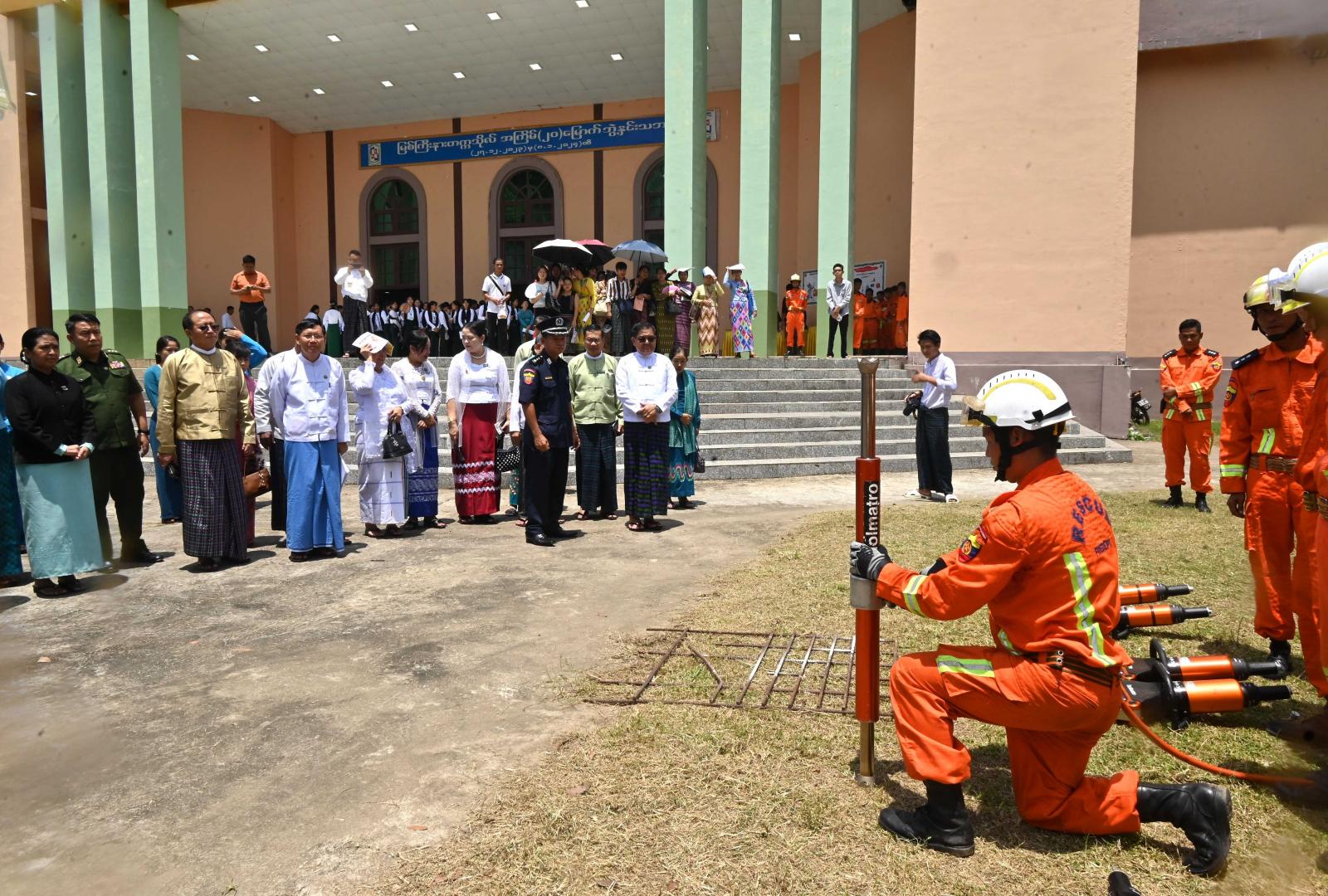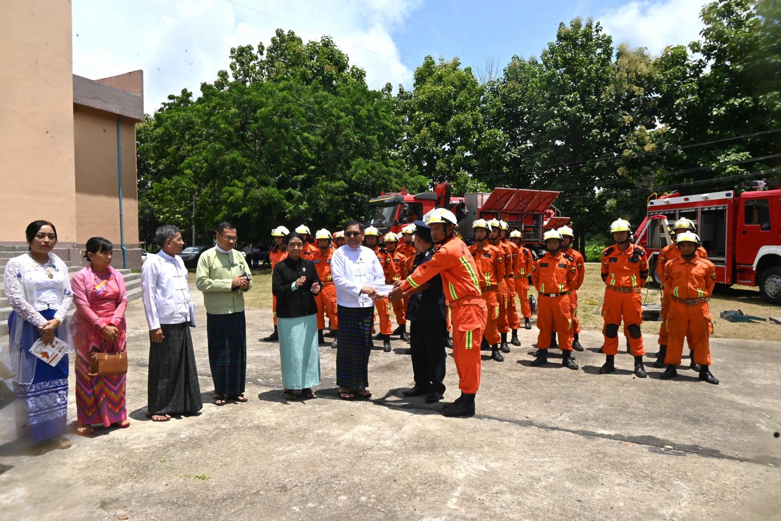 ထို့နောက် ပြည်နယ်ဝန်ကြီးချုပ်နှင့် ဇနီး၊ ပြည်နယ်တရားလွှတ်တော်တရားသူကြီးချုပ်၊ ပြည်နယ်အစိုးရအဖွဲ့ဝင်များ၊ ပြည်နယ်အဆင့်ဌာနဆိုင်ရာများက ပြည်နယ်မီးသတ်ဦးစီးဌာနက ပြသထား သည့် အဆင့်မြှင့်ကယ်ဆယ်ရေးသုံးပစ္စည်းများ ခင်းကျင်းပြသထားရှိမှုကိုလည်းကောင်း၊ သဘာဝဘေးနှင့်စပ်လျဉ်း၍ အသိပညာပေး ဉာဏ်စမ်းကစားခြင်းများကိုလည်းကောင်း၊ မီးသတ်တပ်ဖွဲ့ဝင်များ၏ ရှာဖွေကယ်ဆယ်ရေးလုပ်ငန်းသုံးပစ္စည်းများ လက်တွေ့အသုံးပြုသရုပ်ပြသခြင်းတို့အားလည်းကောင်း လှည့်လည်ကြည့်ရှုအားပေးခဲ့ကြကာ ပြည်နယ်ဝန်ကြီးချုပ်က သရုပ်ပြမီးသတ်တပ်ဖွဲ့ဝင်များအတွက် ချီးမြှင့်ငွေများကို ပေးအပ်ချီးမြှင့်ခဲ့ကြသည်။