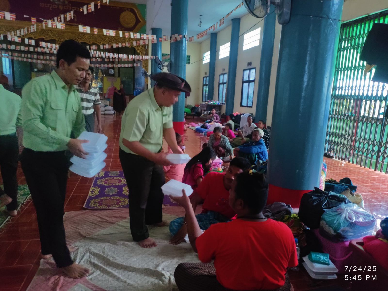 အဆိုပါ ယာယီရေဘေးကယ်ဆယ်ရေးစခန်း (၁၁) ခု ဖွင့်လှစ်ထားရှိခဲ့ရာမှ အမှတ် (၃) ရပ်ကွက်ရှိ ဓိဌာန်အောင်ဘုန်းကြီးကျောင်း၊ ဓမ္မရန်အောင်ဘုန်းကြီးကျောင်း၊ အမှတ်(၄) ရပ်ကွက်ရှိ၊ ကြခတ္တ တောဘုန်းကြီးကျောင်း၊ တောရဘုန်းကြီးကျောင်းနှင့် ဟေမာန်ဦး ဘုန်းကြီးကျောင်း၊ အမှတ် (၅) ရပ်ကွက်ရှိ ကိုးနဝင်းဘုန်းကြီးကျောင်း၊ ရေပူတောင်ပေါ်ကျောင်းနှင့် ဖားခြောက်ကောင် ဘုန်းကြီးကျောင်းစသည့် ကယ်ဆယ်ရေး စခန်း (၈) ခုတွင် ဇူလိုင်လ ၂၄ ရက်နေ့အထိ အိမ်ထောင်စု (၁၁၇၉) စု၊ ကျား (၂၃၇၈) ဦး၊ မ(၂၃၅၈) ဦး၊ စုစုပေါင်း (၄၇၃၆) ဦးတို့အား သဘာဝဘေးအန္တရာယ်ဆိုင်ရာစီမံခန့်ခွဲမှုအဖွဲ့ဥက္ကဋ္ဌ ခရိုင်အုပ်ချုပ်ရေးမှူး ဦးကောင်းစံလင်း ဦးဆောင်၍ တာဝန်ရှိသူများနှင့်အလှူရှင်များမှ လှူဒါန်းသည့် ထောက်ပံ့ရေးပစ္စည်းများ၊ ဆန်၊ ဆီ၊ ငါးသေတ္တာ၊ ကြက်သွန်နီ၊ ဆပ်ပြာ၊ ဆား၊ အချိုမှုန့် စသည့် စားသုံးကုန်ပစ္စည်းများအပြင် ထမင်းဘူးများအား ရေဘေးသင့်ပြည်သူများ လက်ဝယ်အရောက် ထောက်ပံ့ပေးအပ်ခဲ့ကြောင်း သိရသည်။