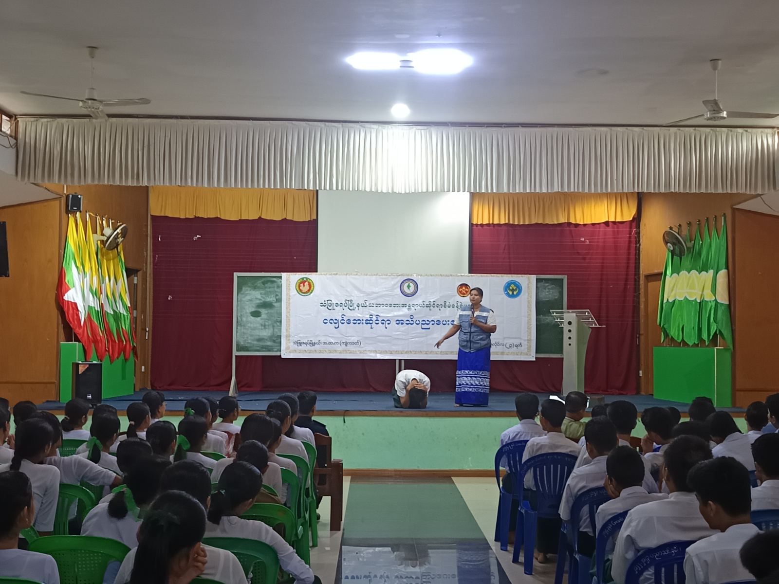 ရှေးဦးစွာ မြို့နယ်သဘာဝဘေးအန္တရာယ်ဆိုင်ရာ စီမံခန့်ခွဲမှုအဖွဲ့ဥက္ကဋ္ဌ ဦးအောင်မိုးလွင်က အဖွင့်အမှာစကားပြောကြားပြီး၊ မြို့နယ်ဘေးအန္တရာယ်ဆိုင်ရာစီမံခန့်ခွဲမှုဦးစီးဌာနမှူး ဦးသူရဦးနှင့် မြို့နယ်မီးသတ်ဦးစီးမှူး ဦးအောင်ကျော်ထွေးတို့က သဘာဝဘေးအန္တရာယ် ဖြစ်ပေါ်ရခြင်းအကြောင်းရင်းများ၊ သဘာဝဘေးအန္တရာယ်အမျိုးအစားများ၊ မိုးရာသီကာလတွင် အများဆုံးဖြစ်ပွားတတ်သည့် ရေဘေးအန္တရာယ်ဆိုင်ရာ ကြိုတင်သတိပြုကာကွယ် လိုက်နာရမည့်အချက်များ၊ အလားတူ ငလျင်ဘေးအန္တရာယ်ပြင်းအားများကြောင့် ထိခိုက်ပျက်စီးမှုများ ဖြစ်ပွားတတ်၍ ကြိုတင်သတိပြုလိုက်နာရမည့်အချက်များ၊ ငလျင်ဘေးအန္တရာယ်နှင့် ကြုံတွေ့ရပါက ရှောင်ရန်/ဆောင်ရန်အချက်များ၊ ငလျင်လှုပ်ခတ်နေစဥ် ကာလ/ ငလျင်လှုပ်ပြီးနောက်ပိုင်း ဆောင်ရွက်ရမည့်အချက်များ၊ အရေးပေါ်လိုအပ်မည့်ပစ္စည်းများနှင့် ကြိုတင်ဆောင်ရွက်ရမည့်အချက်များ၊ သဘာဝဘေးအန္တရာယ်နှင့်ပတ်သက်၍ မိုးလေဝသနှင့်ဇလဗေဒညွှန်ကြားမှုဦးစီးဌာနမှ ထုတ်ပြန်ကြေညာချက်များအား အချိန်နှင့်တစ်ပြေးညီ လိုက်နာဆောင်ရွက်ကြရေးတို့ကို ရှင်းလင်းဟောပြောခြင်းနှင့် လက်တွေ့သရုပ်ပြသခဲ့ကြသည်။