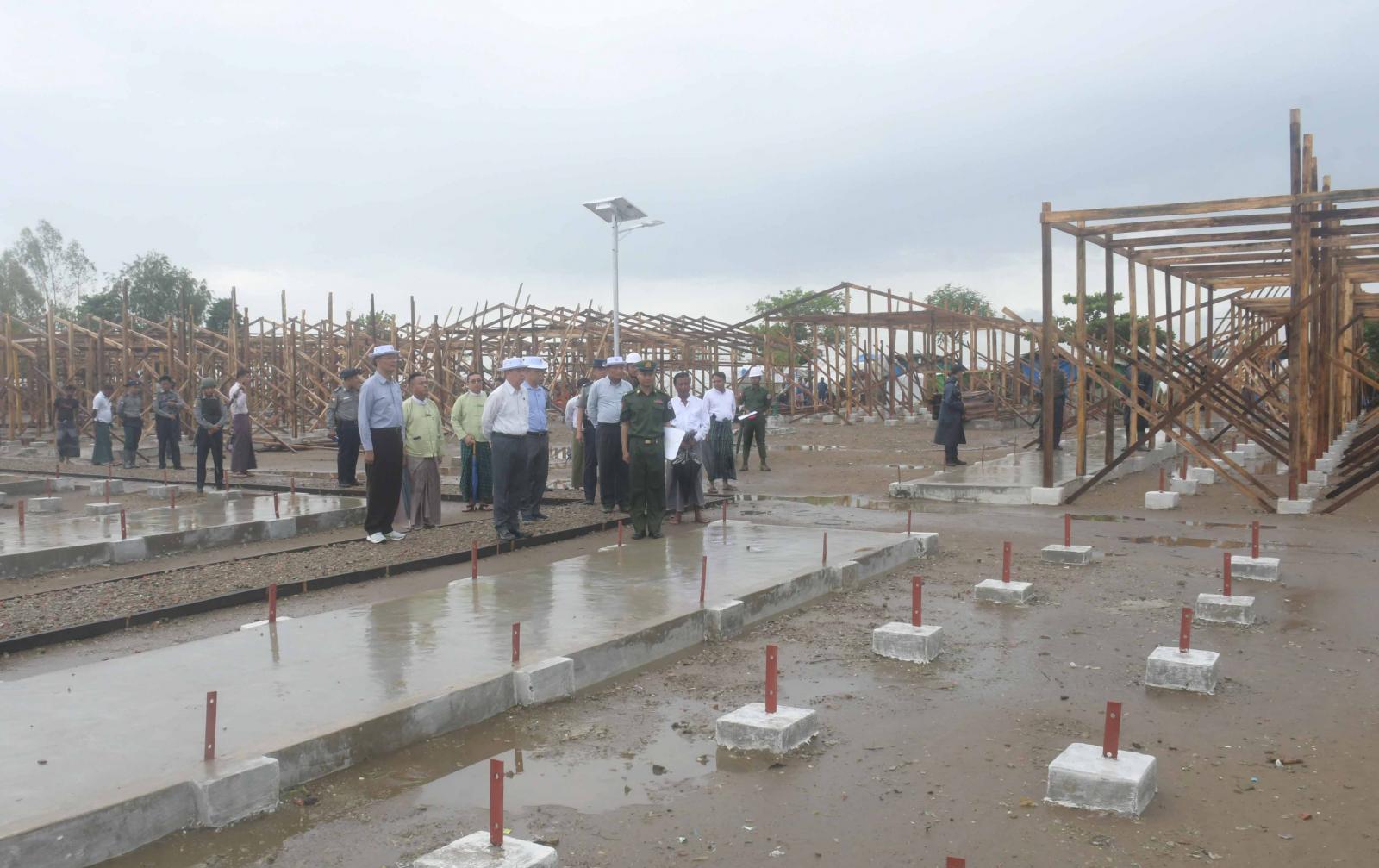 ထို့နောက် ပြည်နယ်ဝန်ကြီးချုပ်နှင့်အဖွဲ့သည် စစ်တွေမြို့နယ်၊ ခေါင်းဒုက္ကာ(၂)IDP စခန်း တွင် သစ်တိုင်၊ ထရံကာ၊ သွပ်မိုးဖြင့် အလျား (၄၈) ပေ၊ အနံ(၃၀) ပေ အဆောက်အဦ (၄၀)လုံး ဆောက်လုပ်ခြင်းနှင့် ရေတုံကင် ၂၄ လုံးတပ်ဆင်ခြင်း လုပ်ငန်းဆောင်ရွက်နေမှုကို သွားရောက်ကြည့်ရှုစစ်ဆေးရာ ရှင်းလင်းဆောင်၌ စစ်တွေတပ်နယ်မှ ဆောက်လုပ်ရေးတာဝန်ခံက လုပ်ငန်းဆောင်ရွက်ပြီးစီးမှု၊ ဆက်လက်ဆောင်ရွက်နေမှုနှင့် တည်ဆောက်ရေးပစ္စည်းများ ရောက်ရှိမှုအခြေအနေများကို ရှင်းလင်း တင်ပြရာ ပြည်နယ်ဝန်ကြီးချုပ်က လိုအပ်သည်များကို တာဝန်ရှိသူများနှင့် ညှိနှိုင်းပေါင်းစပ်ပေးခဲ့သည်။