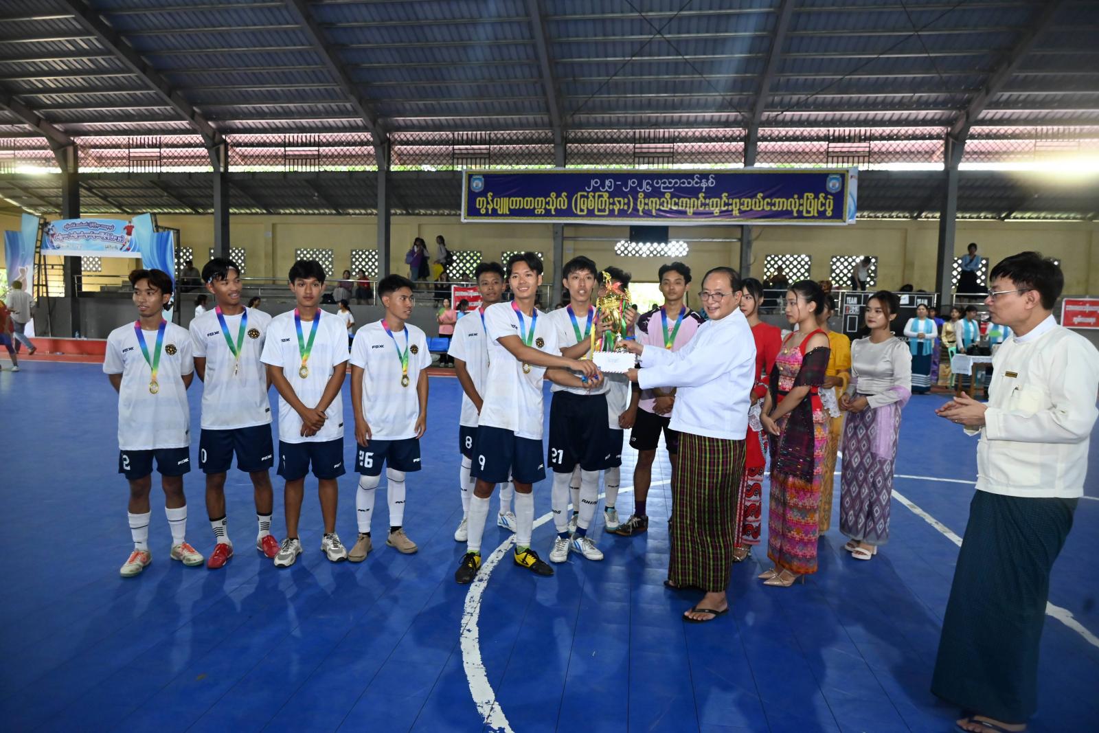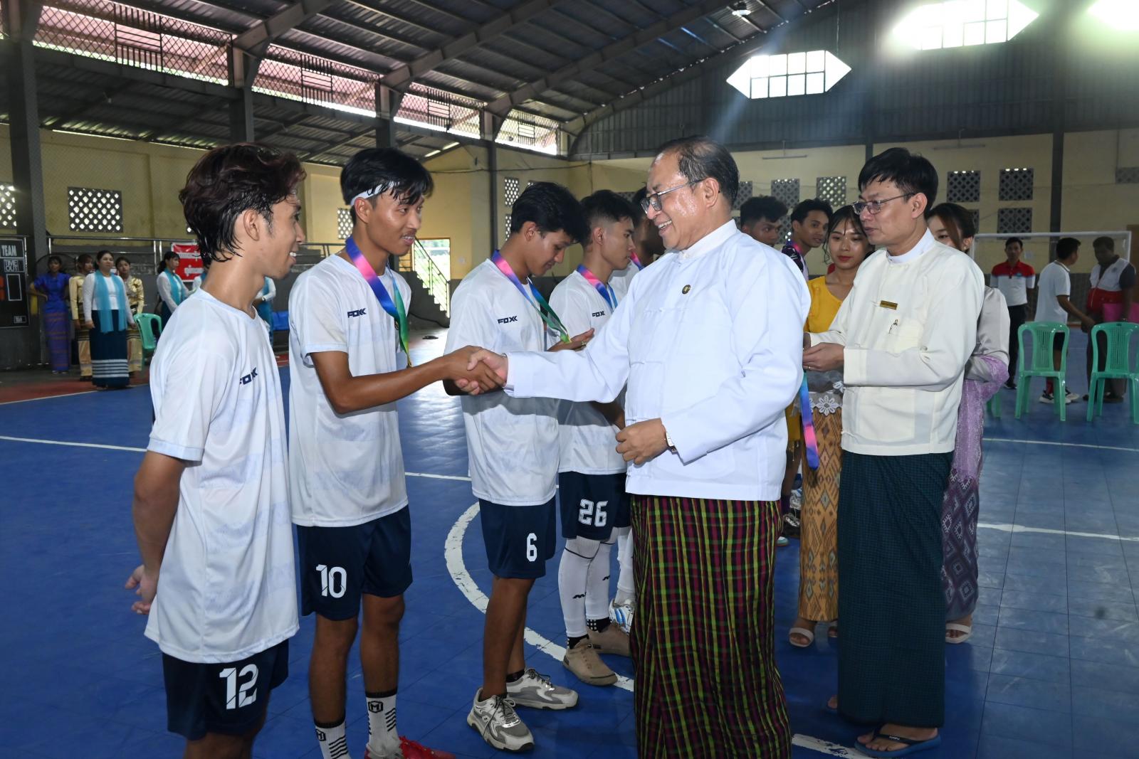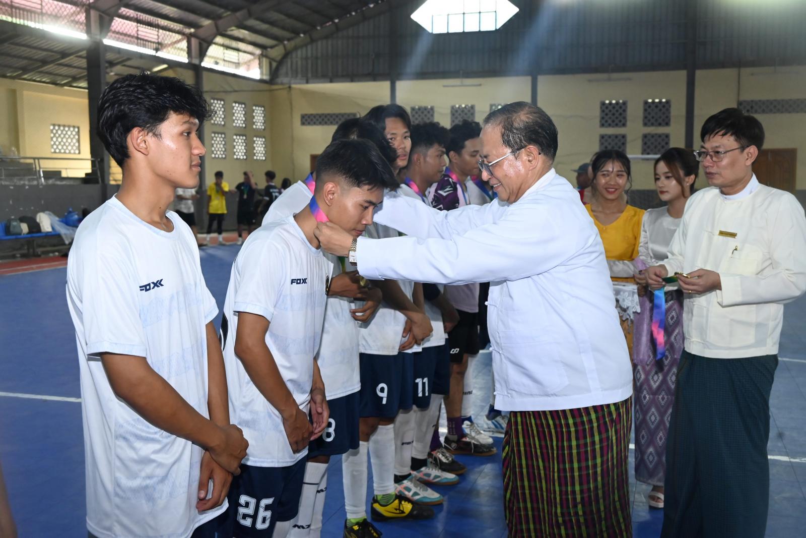 ယင်းနောက် ဆုချီးမြှင့်အခမ်းအနားကို ဆက်လက်ကျင်းပရာ ပြည်နယ်ဝန်ကြီးက ဘောလုံးအသင်းများအား အားကစားသည် နိုင်ငံအရင်းအမြစ်များအတွက် အလွန်အရေးကြီး ကဏ္ဍတစ်ရပ် ဖြစ်ပါကြောင်း၊ ယခုလို ကျောင်းသားလူငယ်များအတွက် အားကစားပြိုင်ပွဲများ ကျင်းပပြုလုပ်ပေး ခြင်းအားဖြင့် အစုအဖွဲ့၏ စည်းလုံးညီညွတ်မှုအင်အားနှင့် တက်ကြွနိုးကြားလန်းဆန်းမှုကို ရရှိစေ မည်ဖြစ်ပါကြောင်း၊ သို့ဖြစ်ပါ၍ အားကစားသမားကောင်းတစ်ယောက်တွင်ရှိရမည့် ဇွဲနှင့် အားက စားစိတ်ဓာတ်ကို အရင်းခံ၍ တရားသောယှဉ်ပြိုင်မှု၊ စည်းကမ်းရှိမှုနှင့် မိမိတို့၏ မူလရည်မှန်းချက် ပန်းတိုင်ဖြစ်သည့် IT ပညာရှင်တစ်ယောက်ဖြစ်လာရေး ကျန်းမာကြံ့ခိုင်ပြီး ဘက်စုံထူးချွန်ထက် မြက်သည့် IT ပညာရှင်များ ဖြစ်လာရန် ကြိုးစားကြစေလိုကြောင်း အားပေးပြောကြားသည်။
