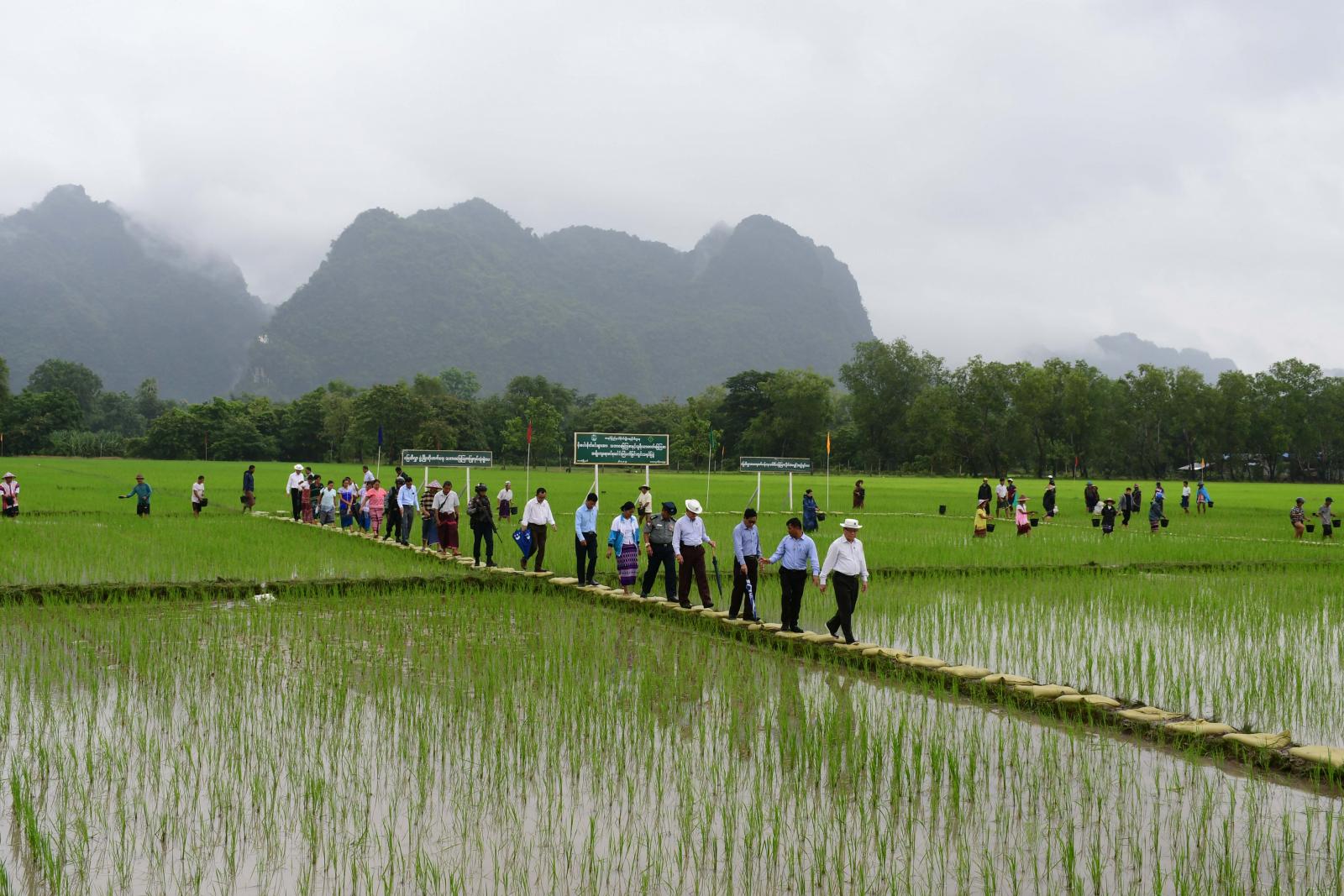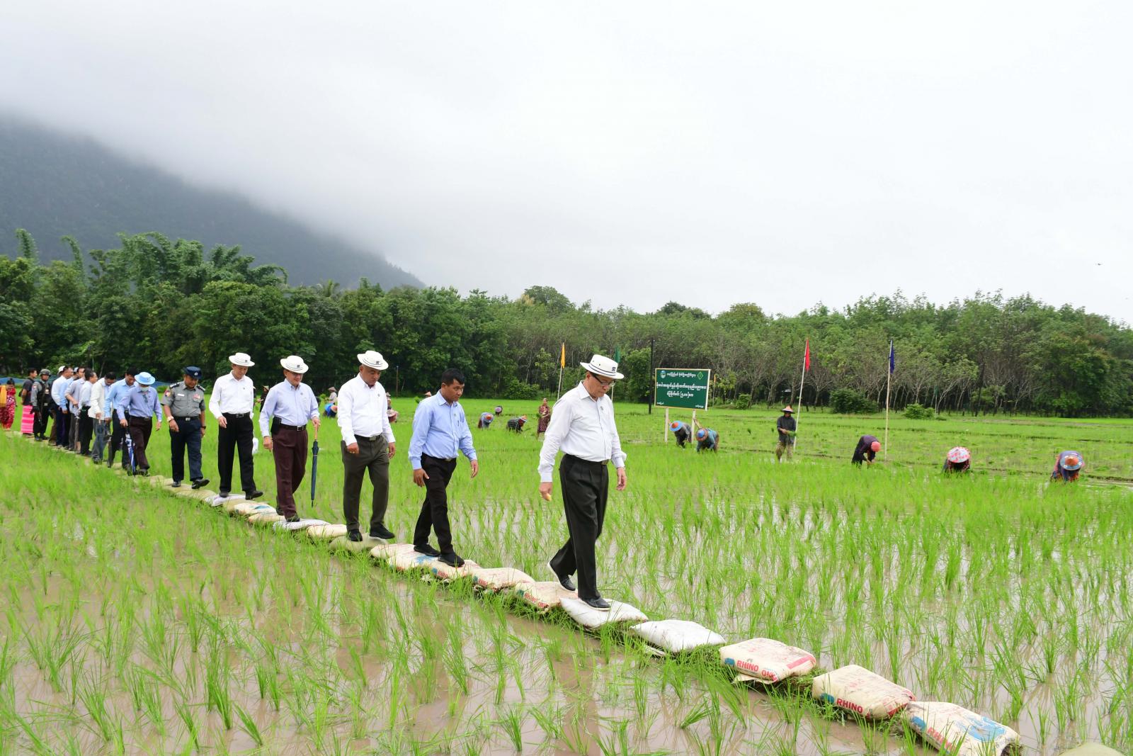 ယင်းနောက် ပြည်နယ်ဝန်ကြီးချုပ်နှင့်အဖွဲ့သည် မိုးစပါးအထွက်နှုန်းတိုးတက်ရေးနည်းပညာပေး စံပြစိုက်ခင်းအား စိုက်ပျိုးရေးဦးစီးဌာနမှဝန်ထမ်းများနှင့် ဒေသခံတောင်သူများစုပေါင်းစိုက်ပျိုးနေမှု အား လှည့်လည်ကြည့်ရှုအားပေးကာ ပင်ကြား၊တန်းကြားမှန်ကန်စေရေး၊ သွင်းအားစုများအချိန်ကိုက် ထည့်သွင်းနိုင်ရေးနှင့် ပန်းတိုင်အထွက်နှုန်း ပြည့်မီကျော်လွန်စေရေး တာဝန်ရှိသူများအား မှာကြားခဲ့သည်။