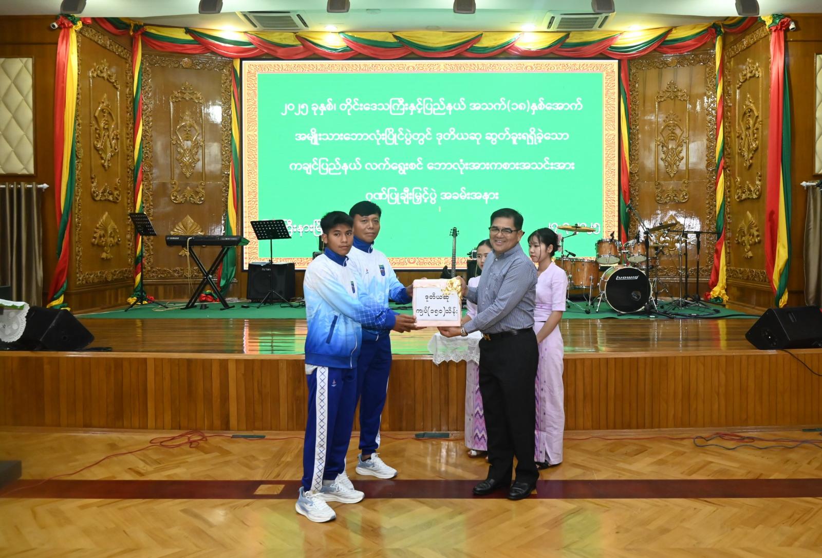 ဆက်လက်၍ ဘောလုံးအသင်းနည်းပြက ပြိုင်ပွဲအတွေ့အကြုံများနှင့် ပြည်နယ်အစိုးရအဖွဲ့၏ အားပေးထောက်ပံ့ ဂုဏ်ပြုချီးမြှင့်မှုအပေါ် ကျေးဇူးတင်စကားပြောကြားပြီး ပြည်နယ်ဝန်ကြီးချုပ်က ဘောလုံးအသင်းအတွက် ပြိုင်ပွဲတစ်လျှောက် ပွဲစဉ်အလိုက် သရေနှင့် အနိုင်ပွဲများအတွက် ချီးမြှင့်ငွေ ကျပ်သိန်း ၆၀ ၊ အသင်းလိုက် ဒုတိဆုအတွက် သိန်း ၁၅၀ ၊ အကောင်းဆုံးရရှိသည့် ကစားသမား (၂)ဦးအတွက် ငွေကျပ်သိန်း ၂၀ ၊ ပြည်နယ်အဆင့် ဌာနဆိုင်ရာများ၊ လုပ်ငန်းရှင်အသင်းအဖွဲ့များက ဂုဏ်ပြုချီးမြှင့်ငွေကျပ်သိန်း ၁၁၀ တို့ဖြင့် စုစုပေါင်း ဂုဏ်ပြုချီးမြှင့် ငွေကျပ်သိန်း ၃၄၀ ကို အသီးသီးထောက်ပံ့ပေးအပ်ခဲ့ကြသည်။
