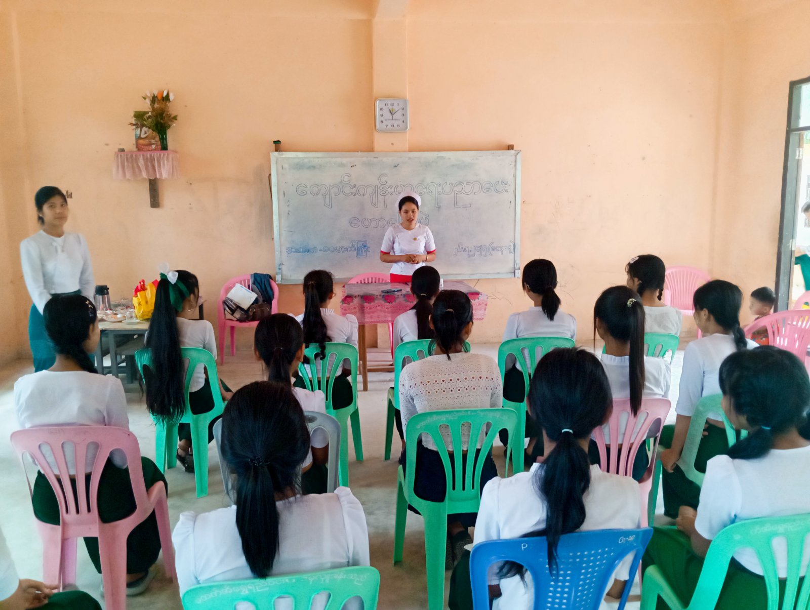 ရှေးဦးစွာ ကျေးလက်ကျန်းမာရေးဌာနခွဲမှ ဘက်စုံသားဖွားဆရာမ ဒေါ်ခိုင်ယမင်းပွင့်က ကျောင်းသား၊ ကျောင်းသူများအား ကျောင်းကျန်းမာရေးအသိပညာပေးဟောပြောခြင်းများ ဆောင်ရွက်ခဲ့ပြီး (KG) ကျောင်းသား၊ ကျောင်းသူများအား အရပ်တိုင်းပေးခြင်း၊ ကိုယ်အလေးချိန် တိုင်းပေးခြင်း၊ သွား၊ မျက်လုံး၊ နား၊ နှာခေါင်း၊ လည်ပင်း စသည့် တစ်ကိုယ်ရည် သန့်ရှင်းမှုကျန်းမာရေးအား စစ်ဆေးပေးခဲ့ပြီး အလယ်တန်းကျောင်းသူလေးများကို သံဓာတ်အားဆေး တိုက်ကျွေးခဲ့ကြောင်း သိရသည်။