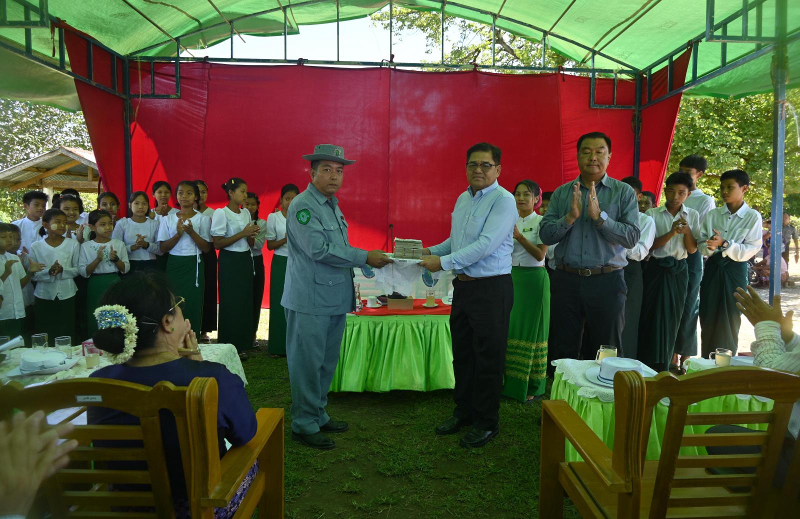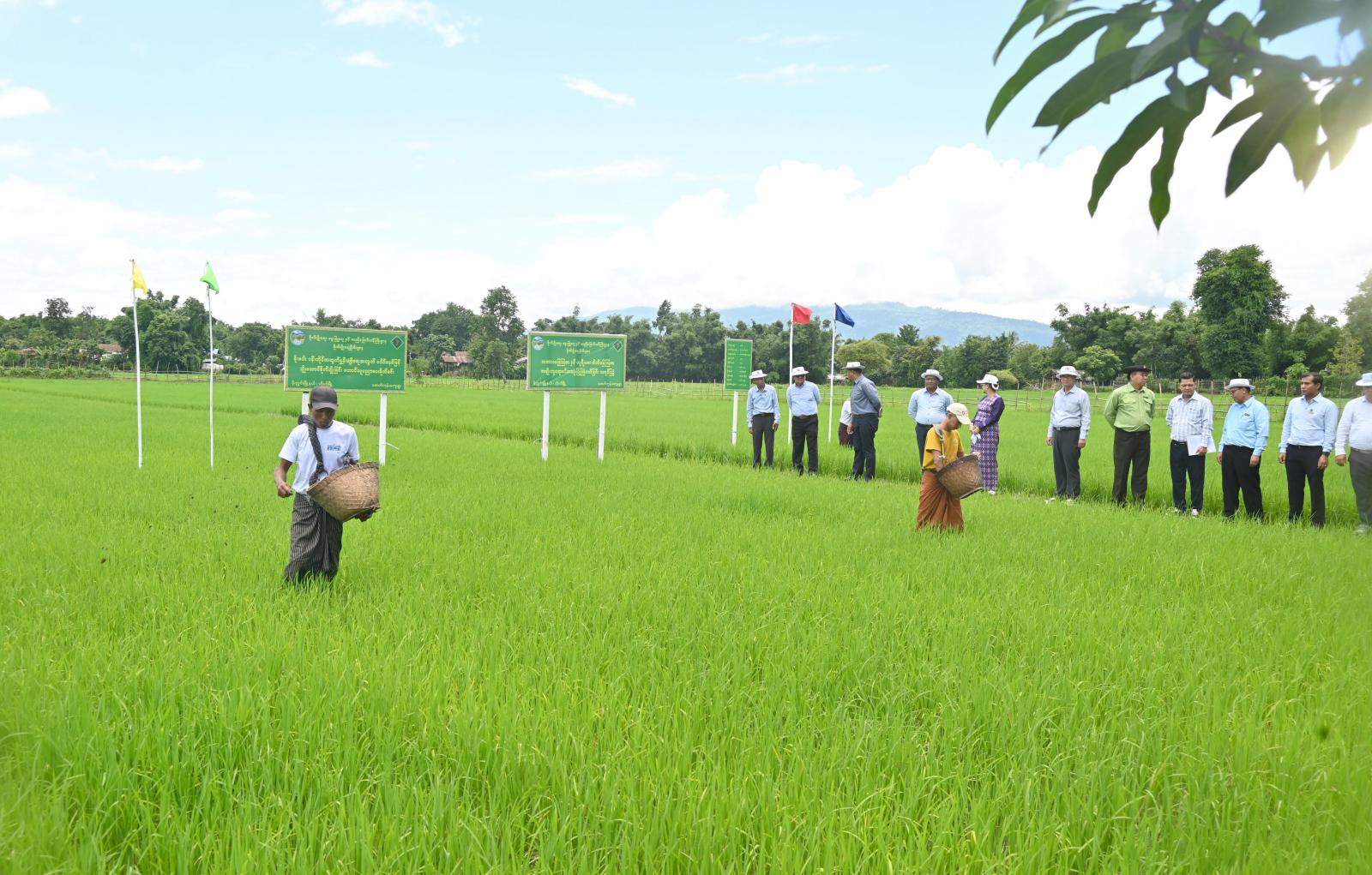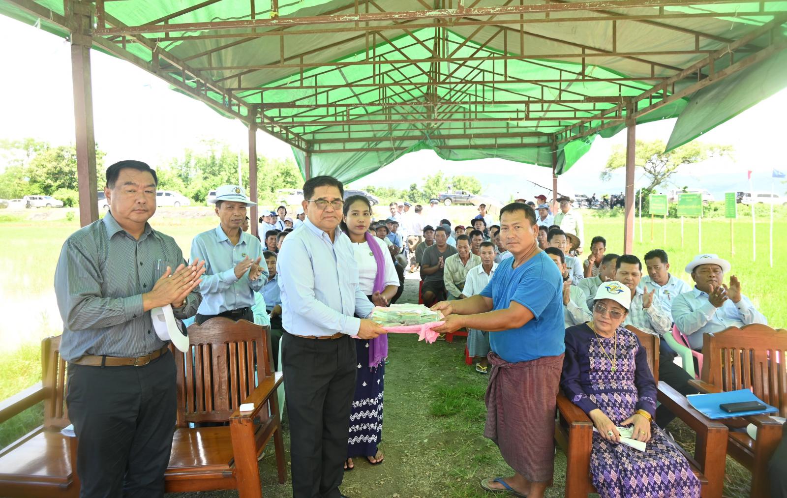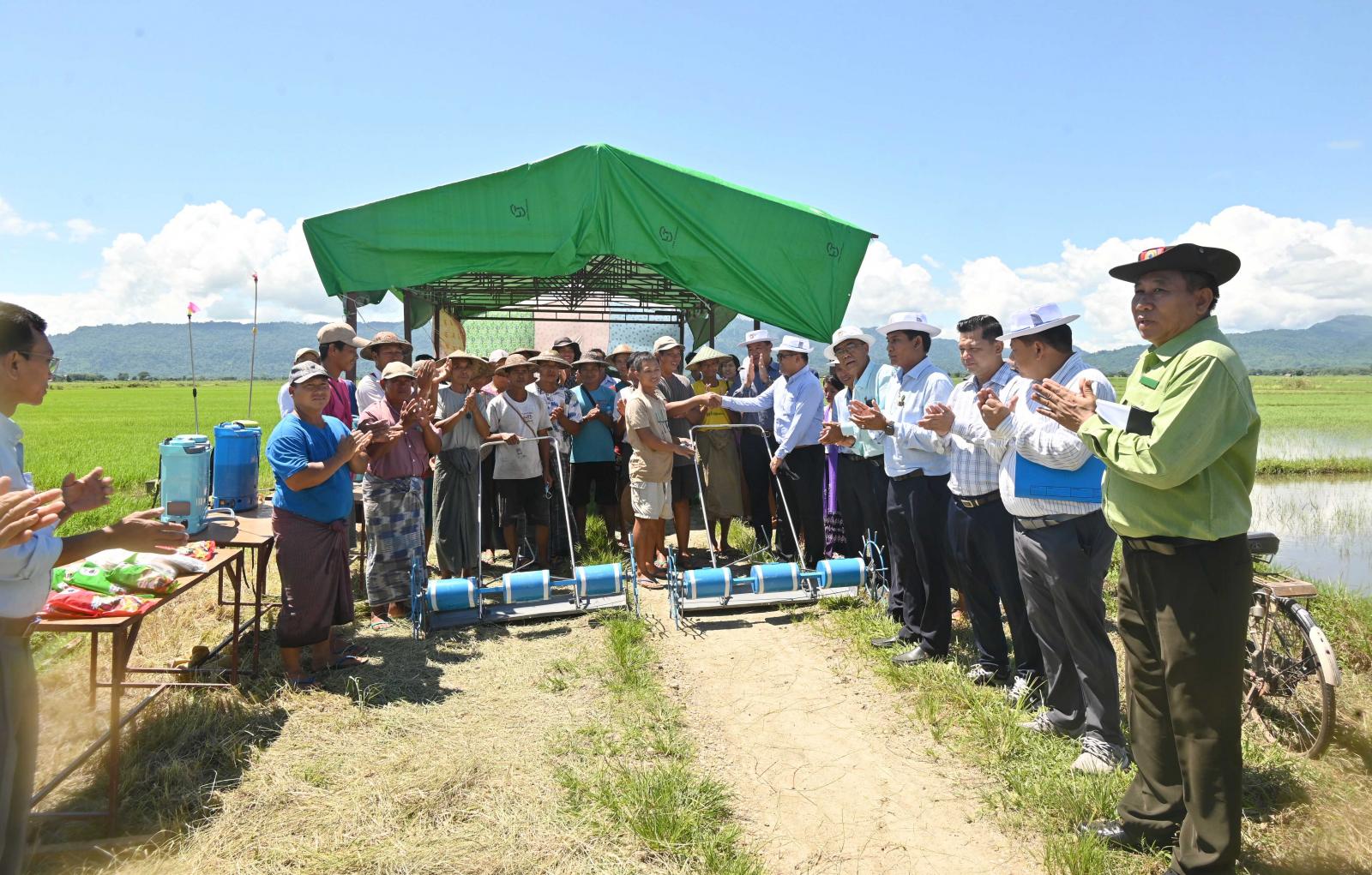 ဆက်လက်၍ ပြည်နယ်ဝန်ကြီး၊ ပြည်နယ်ဥပဒေချုပ်နှင့် ပြည်နယ်စိုက်ပျိုးရေးဦးစီးဌာန၊ ပြည်နယ်ဦးစီးမှူးတို့က တောင်သူများအတွက် ရွက်ဖျန်းအားတိုးစေးများ၊ သဘာဝမြေဩဇာများနှင့် ဟင်းသီးဟင်းရွက်မျိုးစေ့များကိုလည်းကောင်း၊ ရွာသစ်ကြီးကျေးရွာ အခြေခံပညာကျောင်း ဘင်ခရာအဖွဲ့အတွက် ဝတ်စုံစာရိတ်အဖြစ် ငွေကျပ်သိန်း ၅၀ ကိုလည်းကောင်း ထောက်ပံ့ပေးအပ်ခဲ့ကြပြီး ပြည်နယ်ဝန်ကြီးချုပ်နှင့် တာဝန်ရှိသူများသည် တောင်သူများနှင့်အတူ ကွင်းအတွင်းရှိ တောင်သူဦးအောင်သန်း၏ မိုးစပါးစိုက်လယ်အတွင်း စိုက်ပျိုးရေးဦးစီးဌာနက တောင်သူအသိ ပညာပေးဓာတ်မြေဩဇာနှင့် သဘာဝမြေဩဇာ အချိန်ကိုက် အချိုးကျ ရောစပ်ပက်ဖြန်းခြင်း ကွင်းသရုပ်ပြသမှုအား ကြည့်ရှုအားပေးခဲ့ကြသည်။