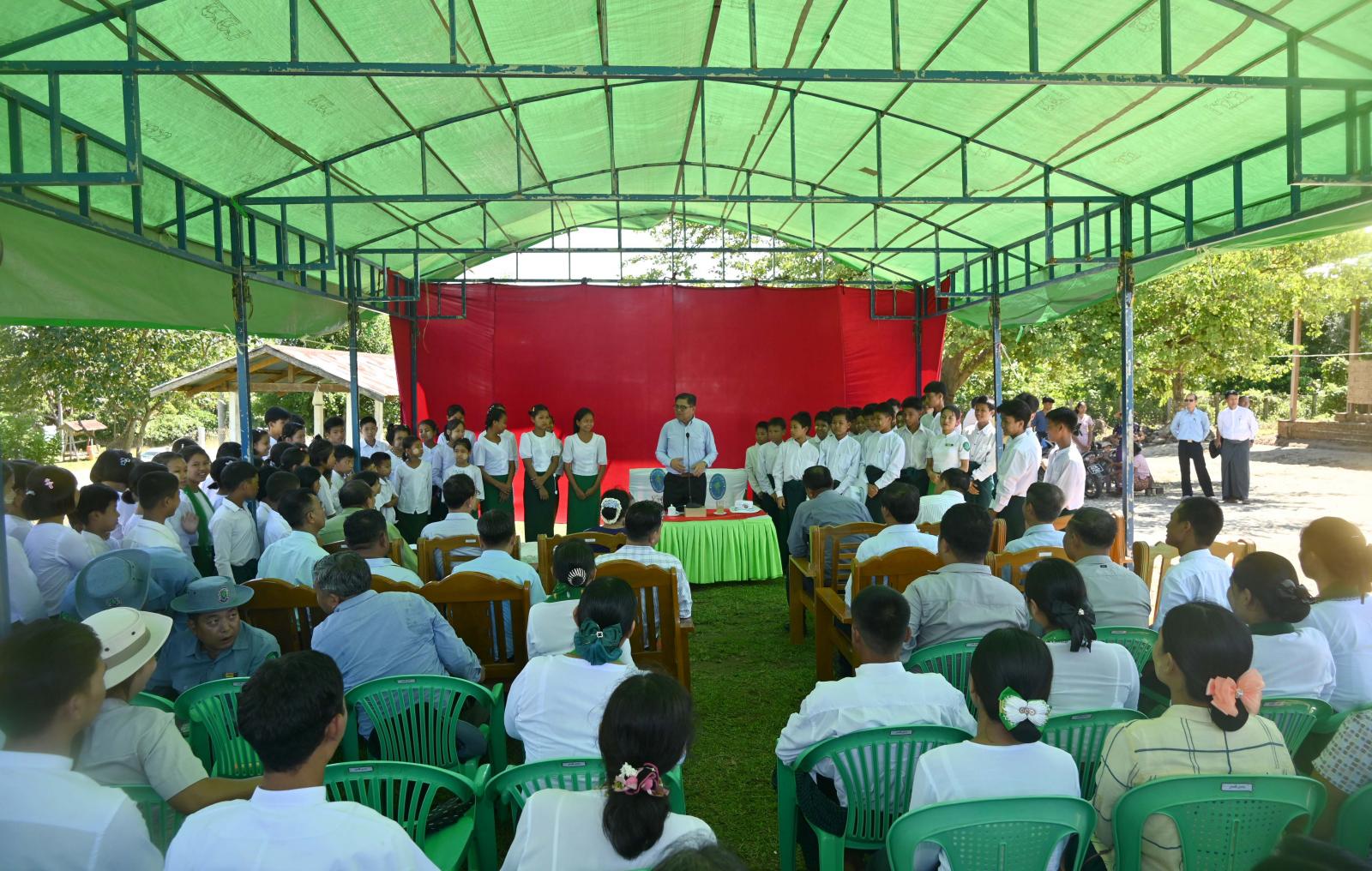 ယင်းနောက် ပြည်နယ်ဝန်ကြီးချုပ်သည် အဆိုပါကျေးရွာရှိ မူလတန်းလွန်ကျောင်းသို့ရောက်ရှိပြီး မူလတန်းကျောင်းအဆင့်မှ မူလတန်းလွန်ကျောင်းအဖြစ် အဆင့်မြှင့်တင်ပေးခဲ့မှု အပေါ် ကျောင်းအကျိုးဆောင်များ၊ ရပ်မိရပ်ဖများစုပေါင်း၍ တိုးချဲ့စာသင်ဆောင်သစ်တည် ဆောက်ရာတွင် အပြည့်အဝတည်ဆောက်ပြီးစီးရေးအတွက် ကြိုးစားဆောင်ရွက်နေမှုအပေါ် ဆရာ၊ ဆရာမများ၊ ရပ်မိရပ်ဖများနှင့်တွေ့ဆုံပြီး လုပ်ထုံးလုပ်နည်းနှင့်အညီ ပြီးစီးအောင်ဆောင်ရွက်ပေးနိုင်ရေး တာဝန်ရှိသူများနှင့် ပေါင်းစပ်ဆောင်ရွက်ပေးခဲ့ပြီး ကျေးရွာအတွင်း လျှပ်စစ်မီးမရရှိသည့် နေအိမ်များ လျှပ်စစ်မီးသွယ်တန်းပေးနိုင်ရေးနှင့် နယ်စပ်ရေးရာဝန်ကြီးဌာန၊ နယ်စပ်ဒေသ တိုင်းရင်းသားလူငယ်များ ဖွံ့ဖြိုးတိုးတက်ရေးသင်တန်းကျောင်း (ဟိုပင်) အတွက် သောက်သုံးရေရရှိရေး ဆိုလာရေတင်စနစ်ဖြင့် တည်ဆောက်နိုင်ရေးအတွက် ကုန်ကျငွေကျပ် ၇၅ သိနိးကို ထောက်ပံ့ပေးအပ်ခဲ့ကြောင်း သိရသည်။