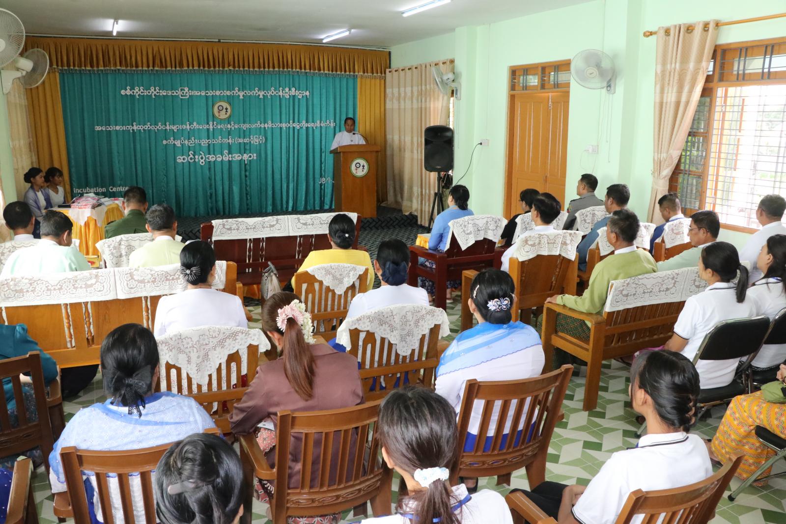 ဦးစွာ တိုင်းဒေသကြီး ဝန်ကြီးချုပ် ဦးမြတ်ကျော်က အဆင့်မြှင့်စက်ချုပ်နည်း ပညာသင်တန်းတွင် ပွဲတက်ဝတ်စုံများပါ ချုပ်လုပ်နိုင်အောင် သင်ကြားပေးခဲ့သည့်အတွက် လုပ်ငန်းထူထောင်လုပ်ကိုင်ရာတွင် များစွာအထောက်အကူဖြစ်ပြီး ထိရောက်အကျိုးရှိသည့် စီမံကိန်းသင်တန်းများ ဖြစ်ပါကြောင်း၊ ယခုသင်တန်းတွင် စီမံကိန်းလုပ်ငန်းတစ်ခုစီမှ ထူးချွန်ပြီး လုပ်ငန်းထူထောင်လိုသည့် သင်တန်းသူ ၅ ဦးစီးအား ရွေးချယ်ပြီး တစ်ဦးလျှင် ငွေကျပ် - ၁၄ သိန်းဖိုးနှင့်ညီမျှသည့် လုပ်ငန်းသုံးပစ္စည်းများ ငှားရမ်းသုံးစွဲခွင့်ပြုသွားမည် ဖြစ်ပါကြောင်း၊ ယခုသင်တန်း သင်ကြားတတ်မြောက်မှုကြောင့် စက်ချုပ်လုပ်ငန်းထူထောင်လိုသူများအနေဖြင့် မိသားစုဝင်ငွေတိုးပွားလာခြင်းကြောင့် လူမှုစီးပွားဘဝများ မြင့်မားလာပြီး သားသမီးများ၏ ပညာရေး၊ ကျန်းမာရေး၊ လူမှုရေးအထောက်အပံ့နှင့် ပြုစုပျိုးထောင်ခြင်းများ ဆောင်ရွက်နိုင်မည်ဖြစ်ပါ၍ အနာဂတ်နိုင်ငံတော်အတွက် မျိုးဆက်သစ်များ မွေးထုတ်ပေးနိုင်မည် ဖြစ်သည့်အပြင် လူသားအရင်းအမြစ်နှင့် နည်းပညာအခြေခံမိသားစုဝင်ငွေများ တိုးတက်လာမည် ဖြစ်ပါကြောင်း ပြောကြားခဲ့သည်။