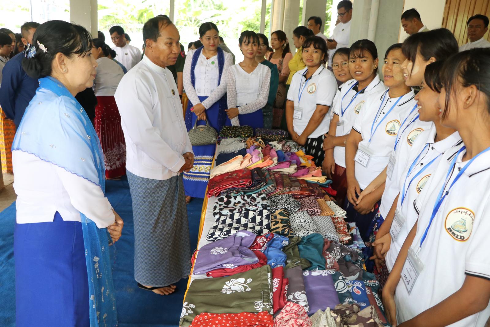 ဆက်လက်၍ တိုင်းဒေသကြီး လမ်းပန်းဆက်သွယ်ရေးဝန်ကြီး ဦးခင်မောင်အေးက အသေးစား၊ အငယ်စားစီးပွားရေးများပေါ်ထွန်းလာစေရေး စီမံကိန်းလုပ်ငန်းအတွက် ဖွင့်လှစ်သည့် စက်ချုပ်နည်းပညာသင်တန်း(အဆင့်မြင့်)မှရရှိသည့် ထုတ်ကုန်ပစ္စည်းများအား သင်တန်းသူတစ်ဦးထံသို့ လည်းကောင်း၊ တိုင်းဒေသကြီး ဥပဒေချုပ်ဒေါ်လှလှဝင်းက အမျိုးသမီးများအတွက် ဝင်ငွေတိုးတက်စေရေးစီမံကိန်းလုပ်ငန်းအတွက် ဖွင့်လှစ်သည့် စက်ချုပ်နည်းပညာသင်တန်း(အဆင့်မြင့်)မှရရှိသည့် ထုတ်ကုန်ပစ္စည်းများအား သင်တန်း သူတစ်ဦးထံသို့လည်းကောင်း အသီးသီးပေးအပ်ကြသည်။