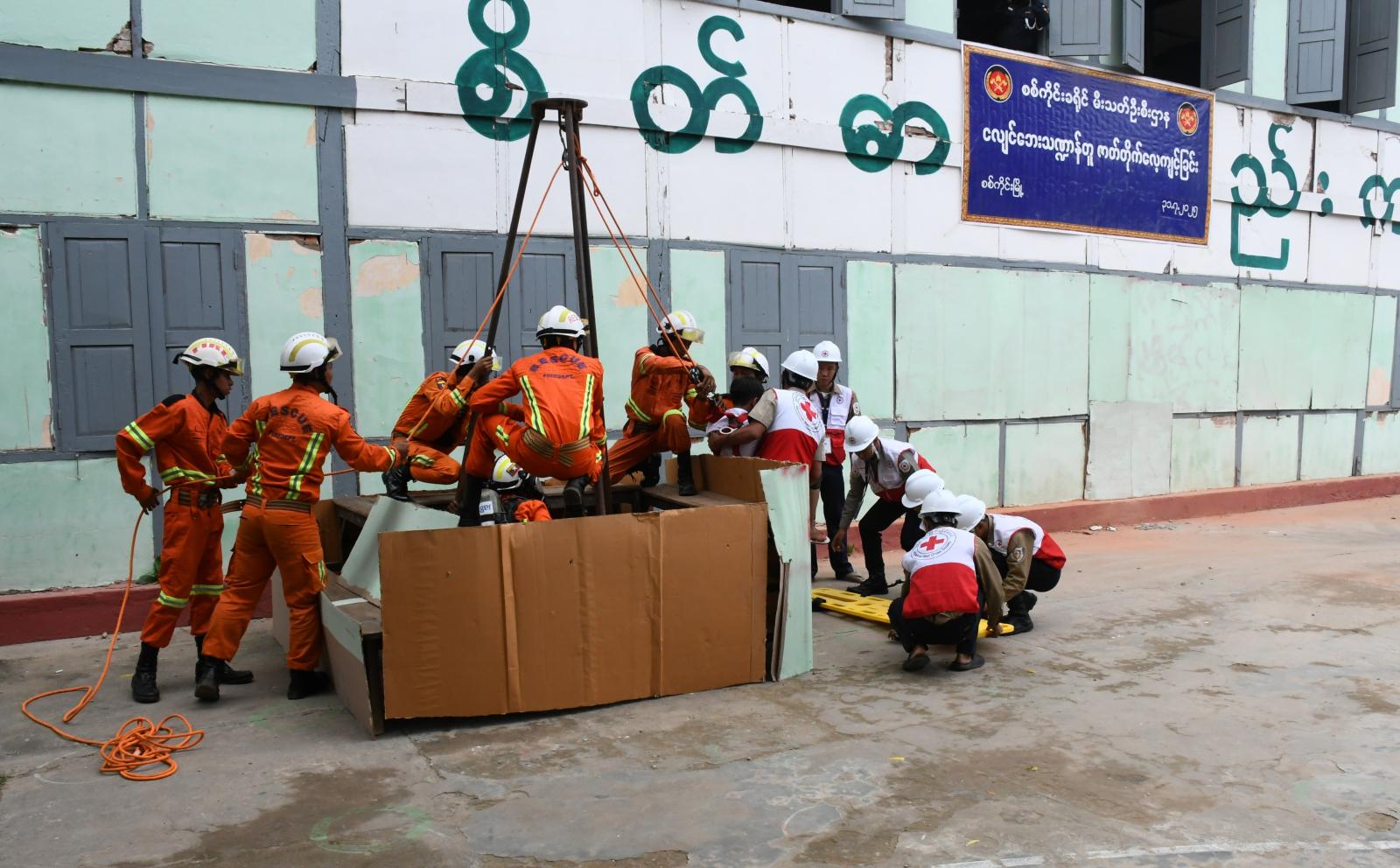 ထို့နောက် စစ်ကိုင်းမြို့နယ်မီးသတ်ဦးစီးဌာန၊ မြို့နယ်ဦးစီးမှူး ဦးဇော်မြင့်ဟန်နှင့် မီးသတ် တပ်ဖွဲ့ဝင်များက ဆရာ၊ ဆရာမ၊ ကျောင်းသား၊ ကျောင်းသူများနှင့် ပူပေါင်း၍ ငလျင် လှုပ်ခတ်မှုဖြစ်စဉ် သရုပ်ပြသခဲ့ပြီး၊ HNE မီးငြှိမ်းသတ်ရေးပစ္စည်းကိရိယာဖြင့် လက်တွေ့ မီးငြှိမ်းသတ်ခြင်း၊ Slide ဆင်းပြီး အထပ်မြင့်တွင်ပိတ်မိနေသောလူနာအား ကယ်ဆယ်ခြင်း၊ Tripot စနစ်ဖြင့် လူနာကယ်ဆယ်ခြင်း၊ အဆောက်အဦတွင် ပိတ်မိနေသောလူနာအား ထွင်းဖောက်ဝင်ရောက်ခြင်း နည်းစနစ်ဖြင့် ကယ်ဆယ်ခြင်းတို့အား လက်တွေ့သရုပ်ပြသ ပေးခဲ့သည်။